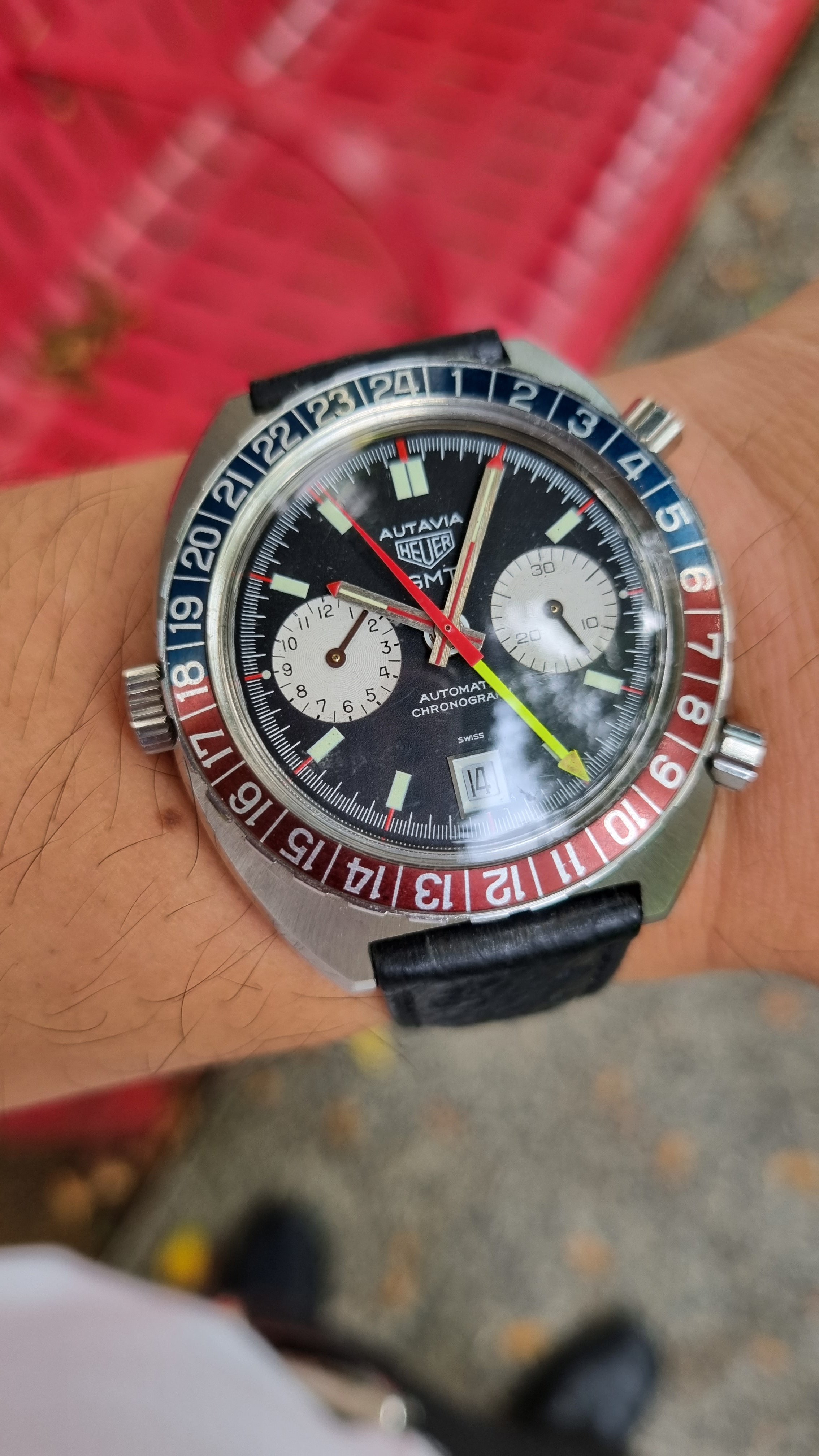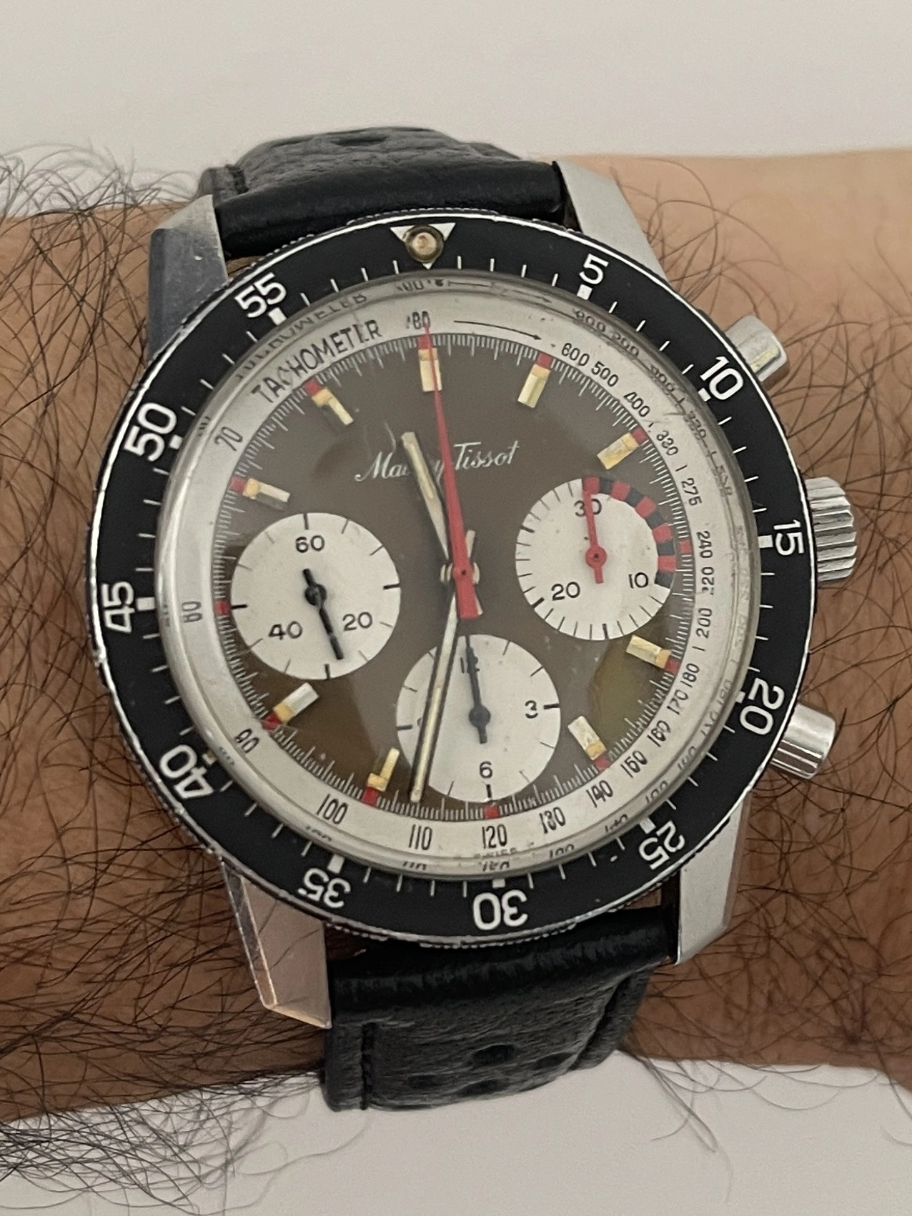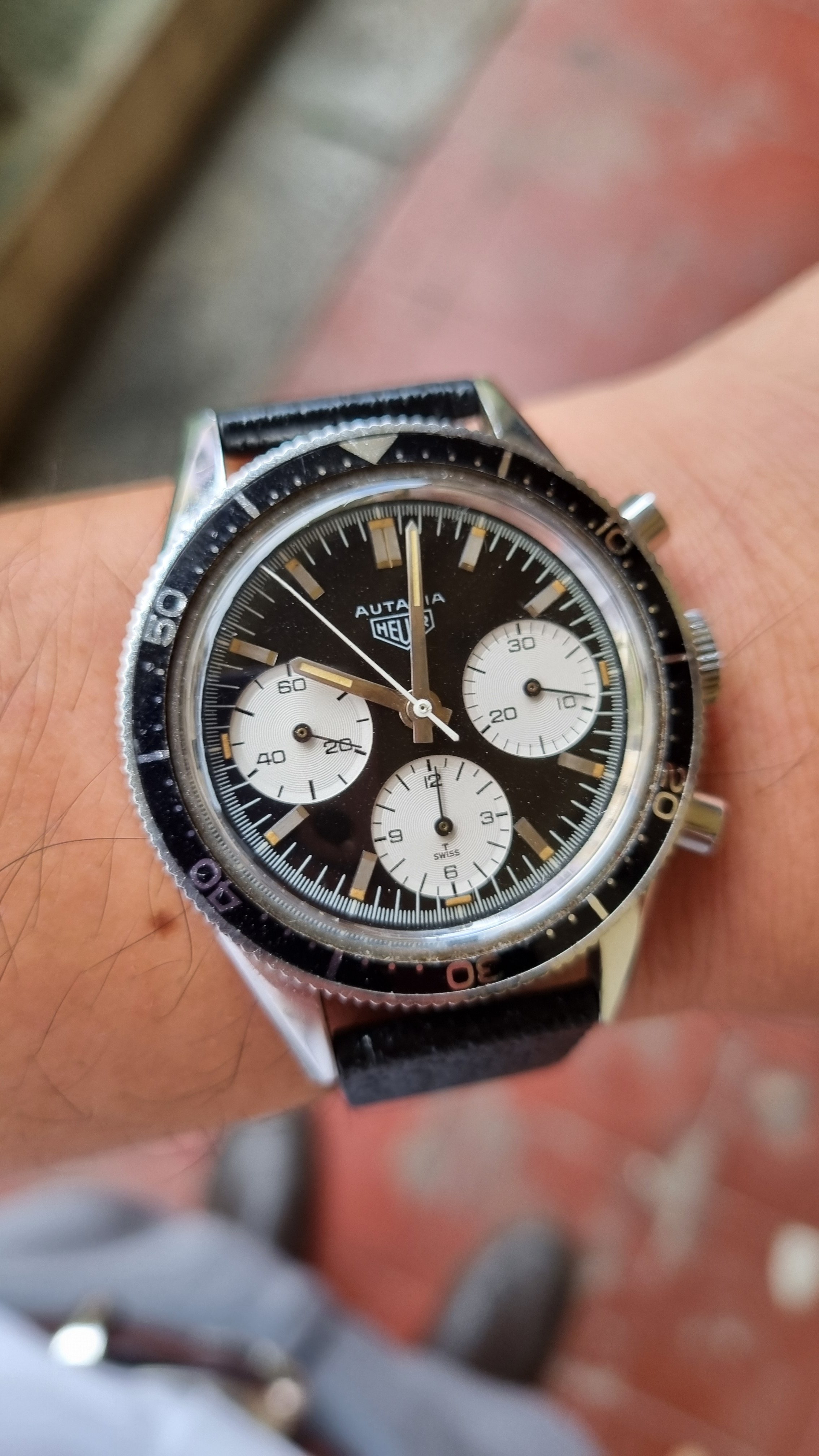 5.) The absence of a solid perimeter ring around the dial (its place typically taken by a tachy in the contrasting colour)