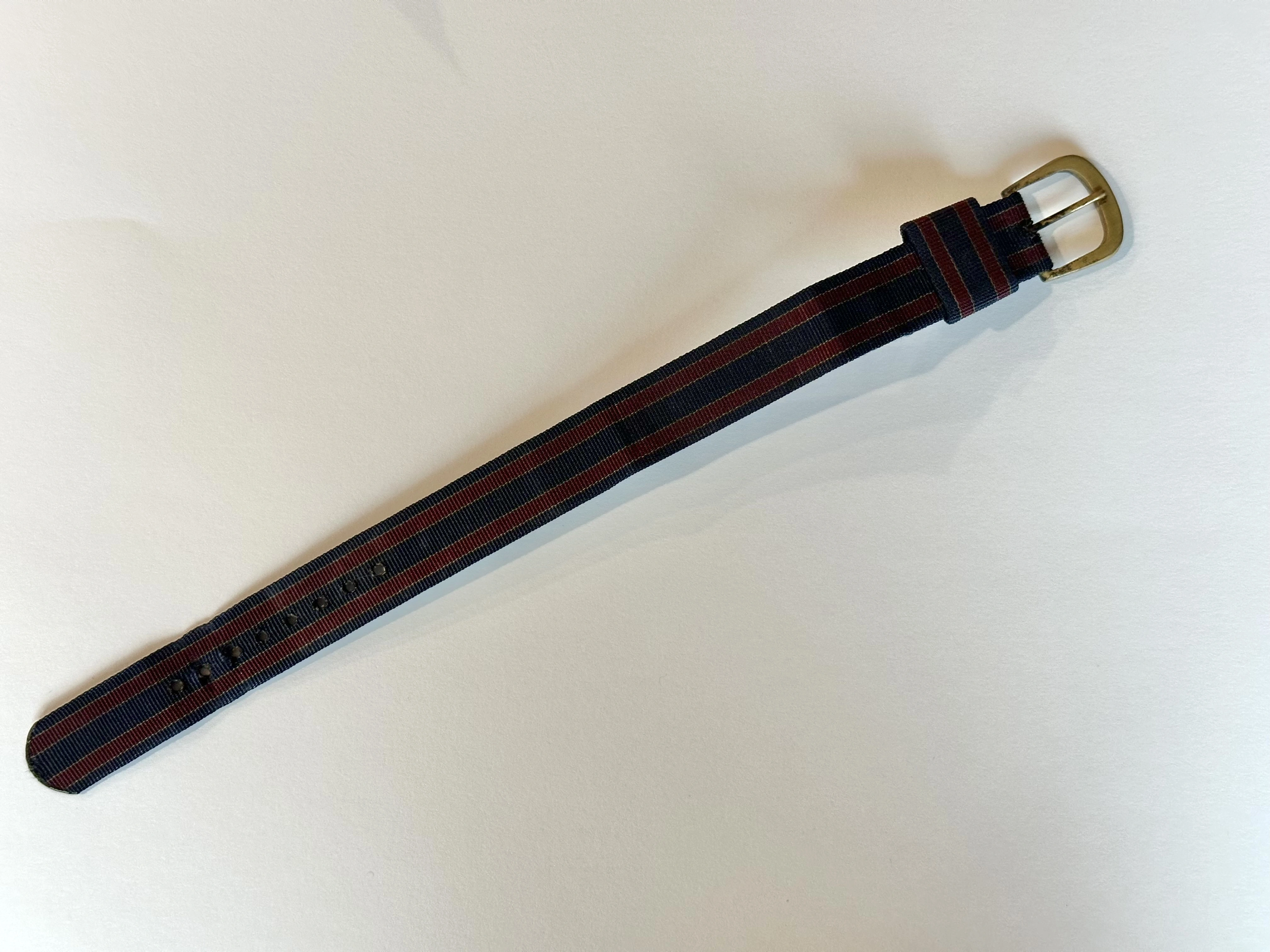 I have access to a strap (pictured) that appears to be almost identical to Bond strap, only with navy blue and red stripes with green piping, and brushed brass buckle (but of the right general shape). The only other difference I can detect is that the Bond strap appears to have had 7 holes, while this strap has 8. This strap has no military provenance, it appears to be just a cheap commercial watch strap, purchased by my dad perhaps 15 years ago at a (now demolished) antique shop in Bothell, Washington of all places.