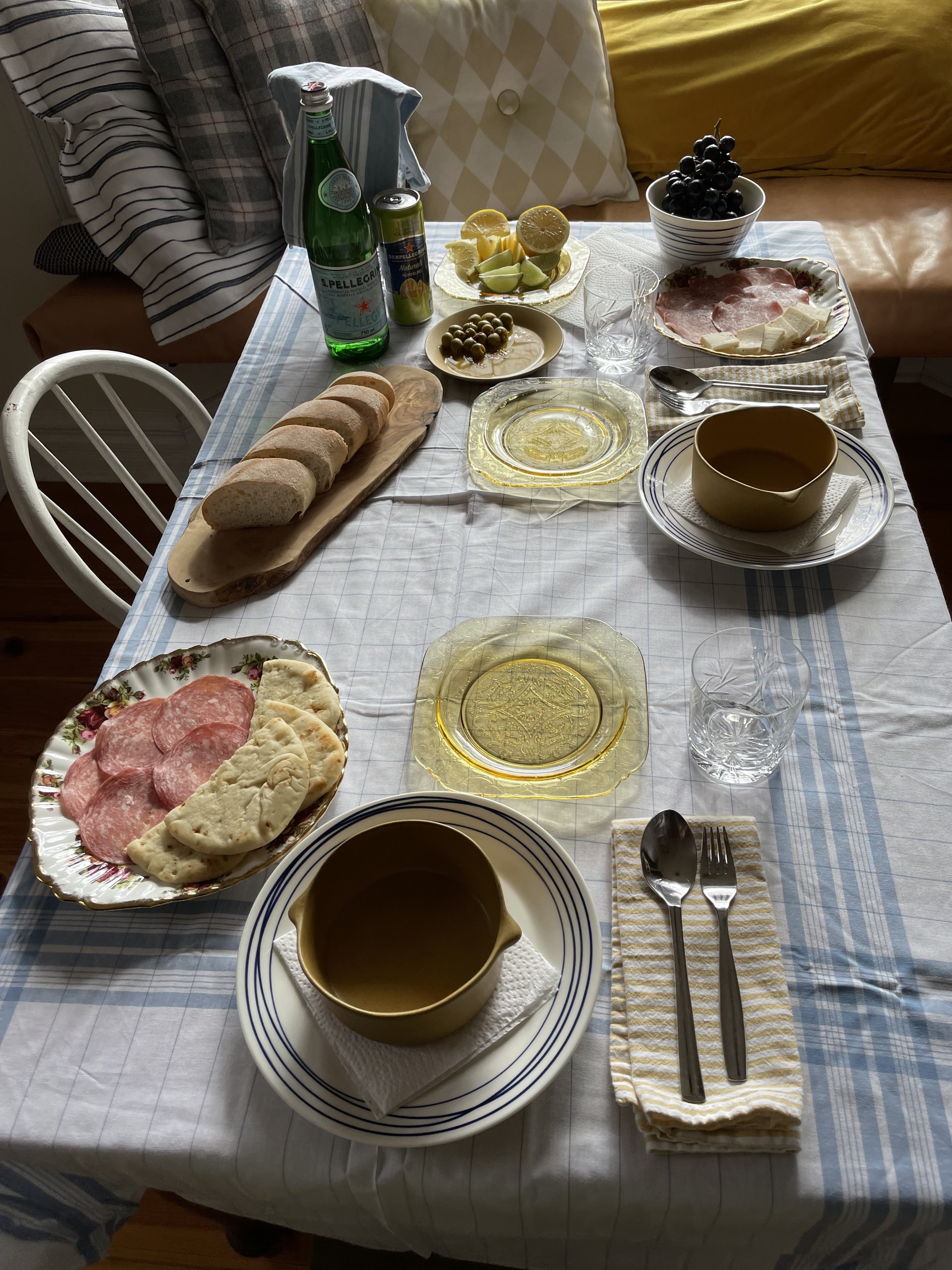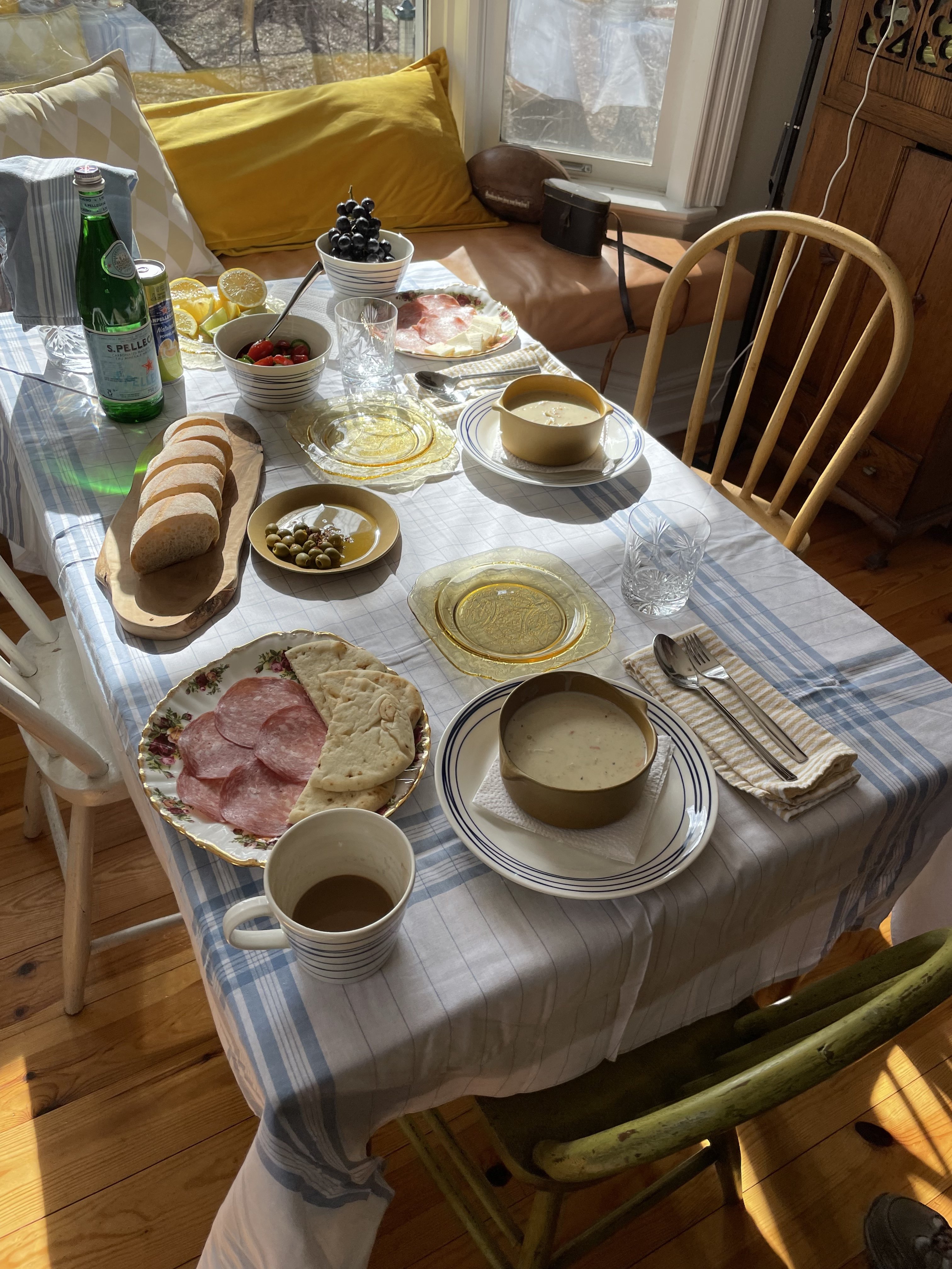 We started with coffee and a recent book purchase. A sweet treat prepared by Archer. Dave took some with him. If watchmaking doesn’t work out Al, you can sell these! After about 90 minutes, my wife, la Dure à Cuire had prepared a snack. Some seafood chowder picked up at a coastal village of Lake Huron. Fresh bread, salad and custard tarts. Plus more coffee.