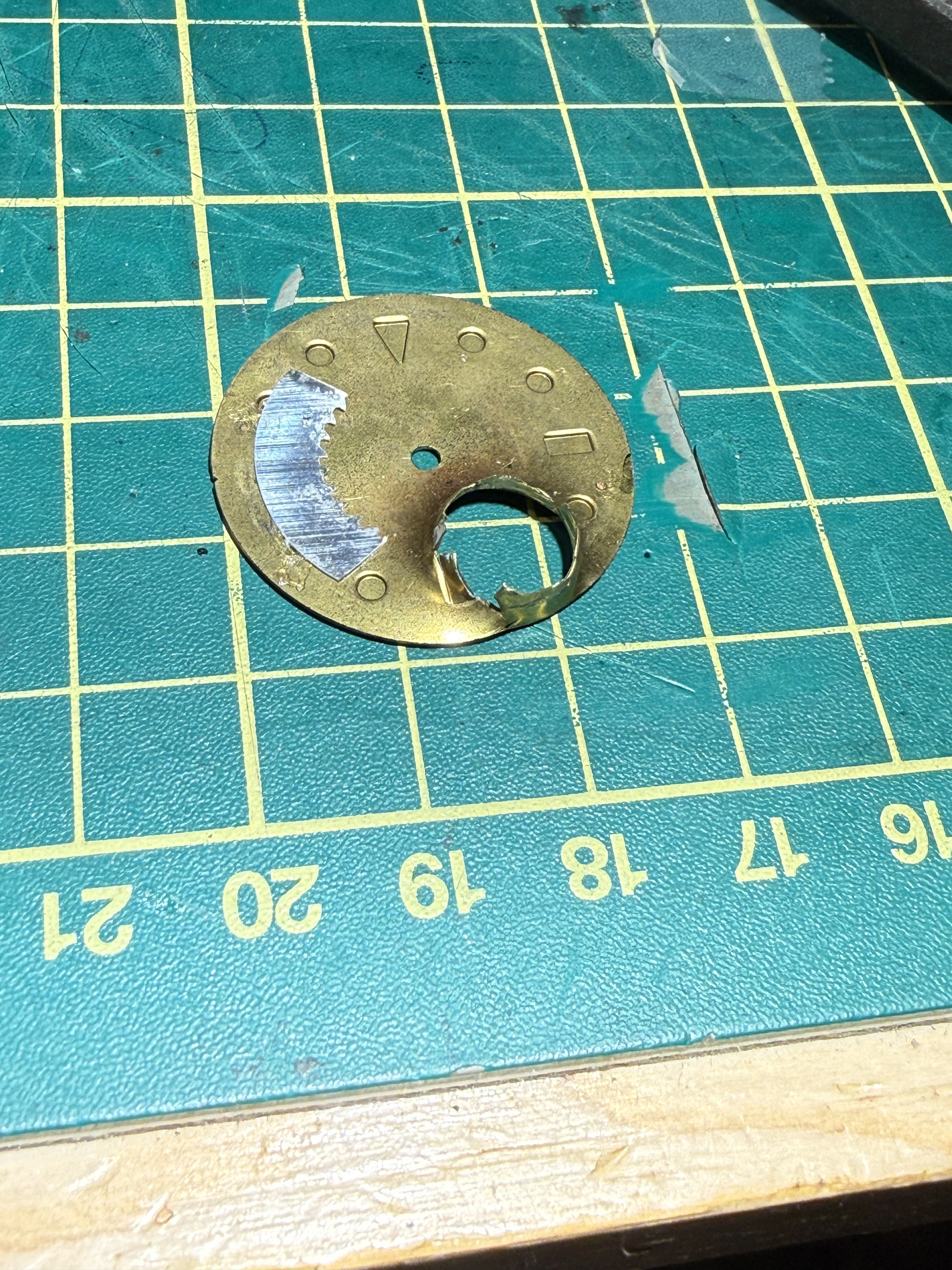 I cut the already bullet-damaged date wheel and glued it in place… I used 9 as the date. (9 mm… get it?).