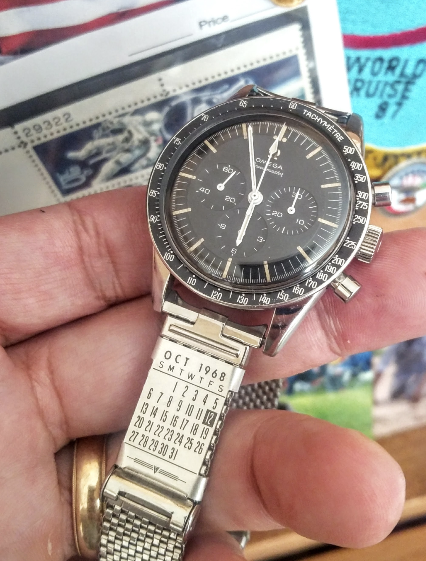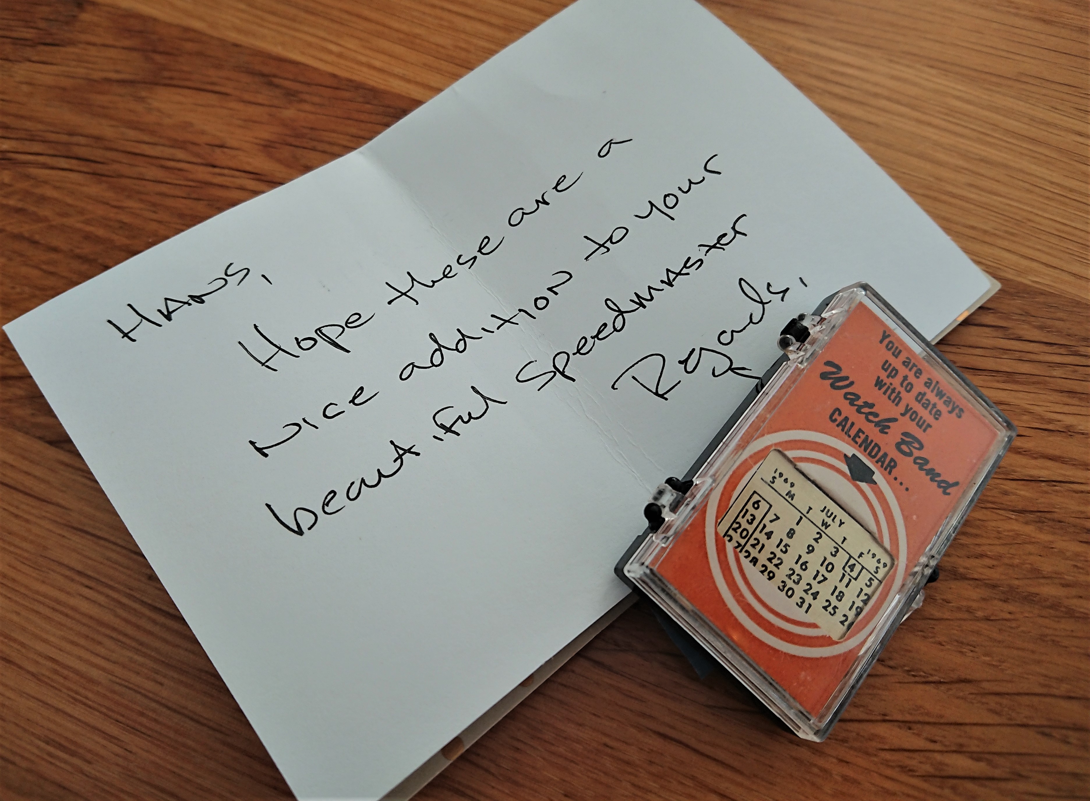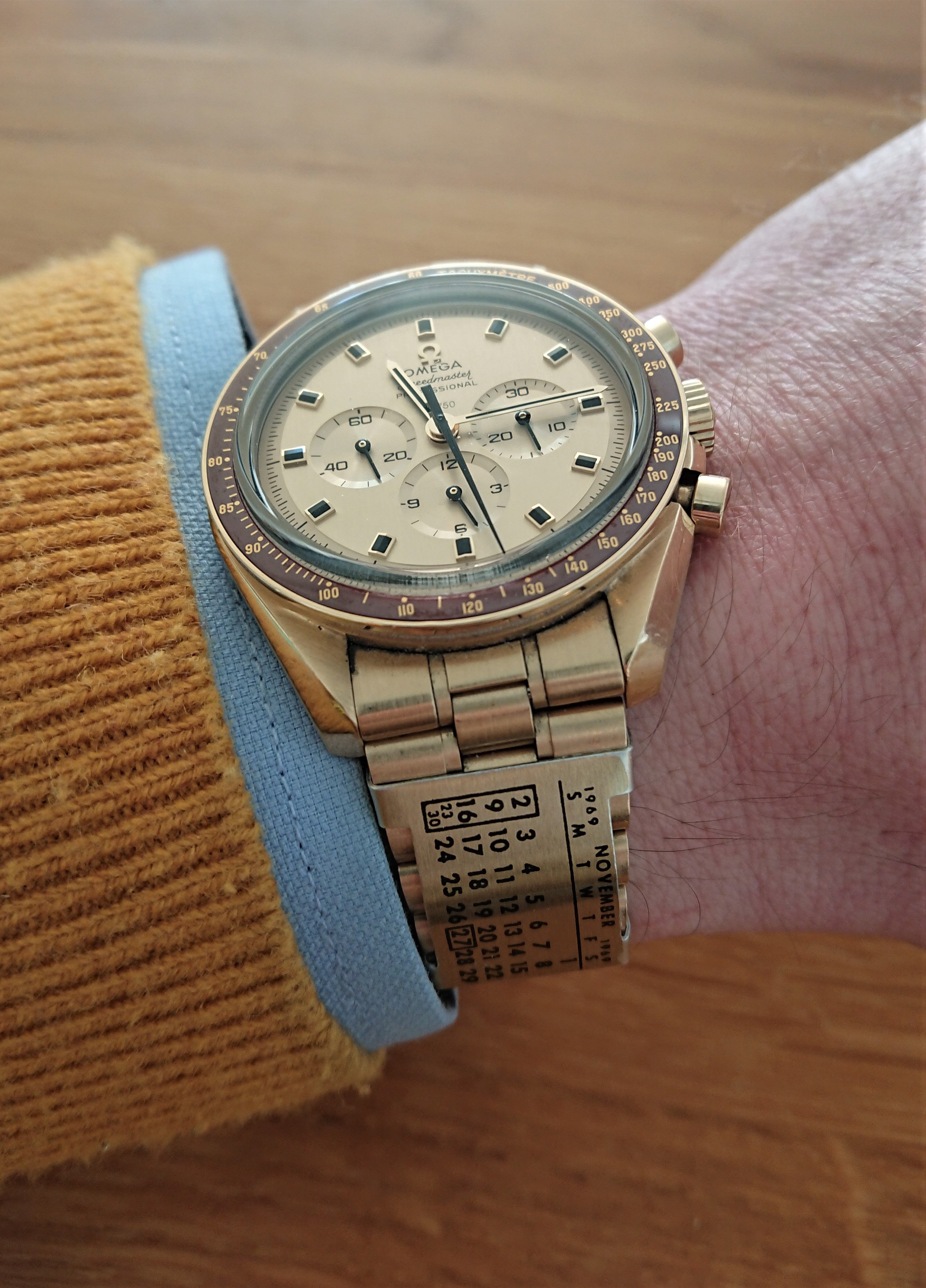 time to wake up this thread, because a new addition to my Speedy arrived safely from the very nice member and thread starter "TLIGuy". (Thanky you again for this perfect and very rare golden watch band calendar! I love it!)