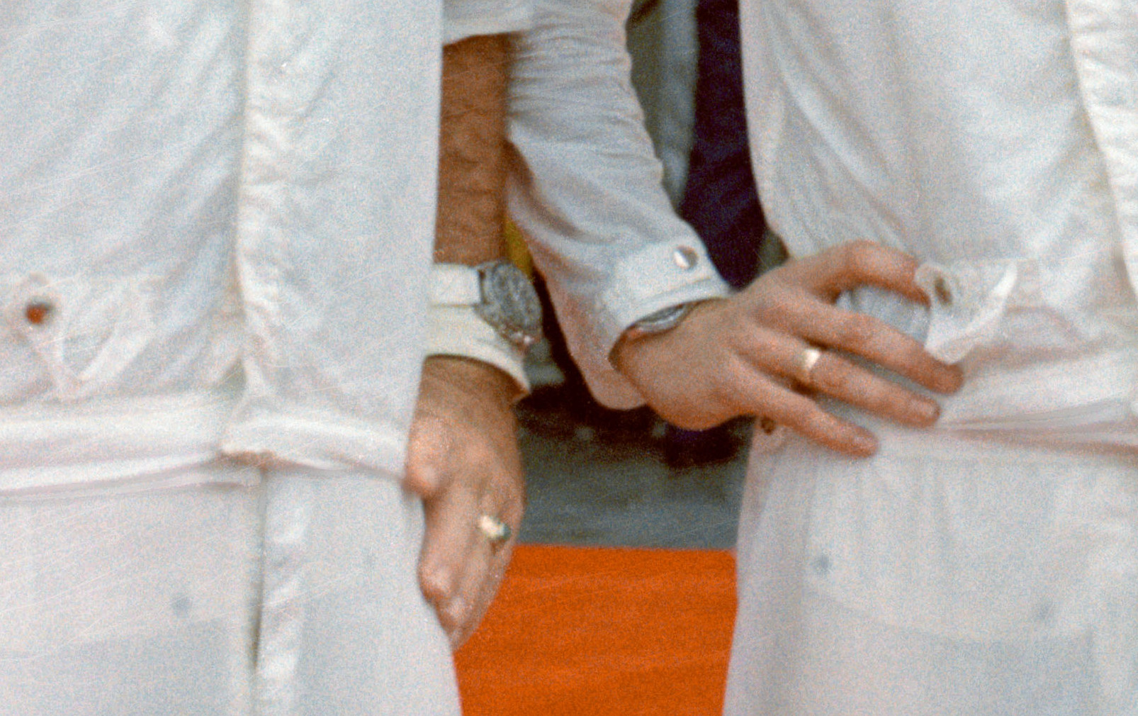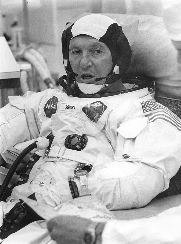Actual splashdown recovery 22 October 1968. Already changed out of spacesuits. Unfortunately nothing conclusive re Wally's wrist calendar. This can't be the only available photo?