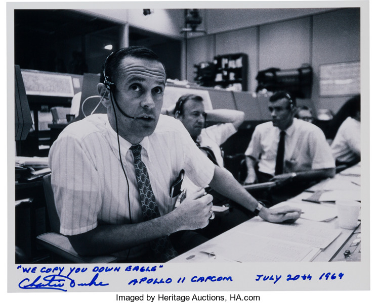 I noticed this signed picture of Charlie Duke at the Mission Control desk as CapCom for Apollo 11 come up at auction (Heritage) last weekend.