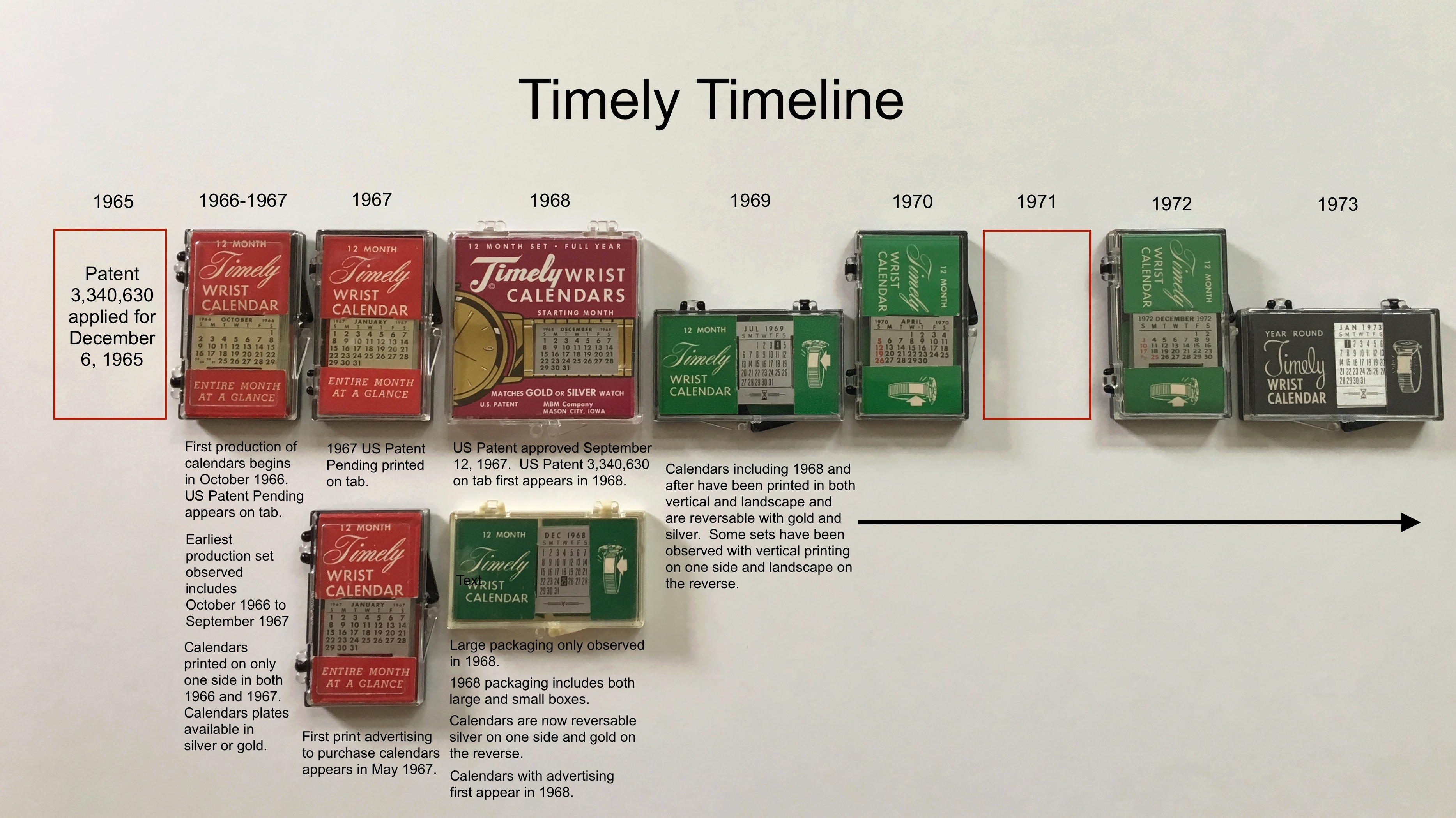 Finally, the quest began. After months of searching and checking multiple sources I checked ebay everyday, if not every few hours, under multiple words and combinations only finding H shaped calendars by Profile from the 80's, to current production ones, to the newer oval calendars. Then last week, to my surprise, the elusive Timely calendar appeared. While ideally I was looking for calendars from '68-'70 I purchased them immediately and victory was declared.