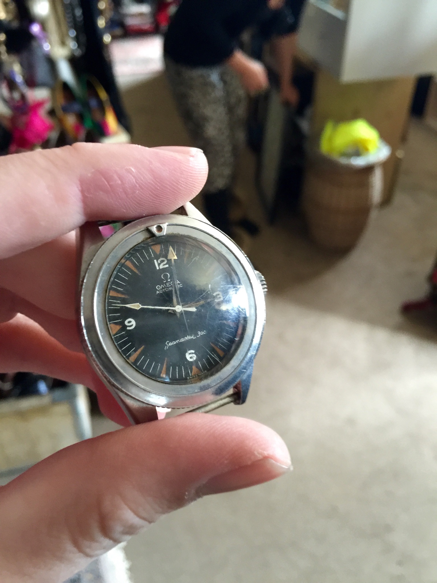This was when my heart jumped a beat. I couldn’t believe it and first dismissed it as a copy but became more and more sure that I had found an early Seamaster 300. It didn’t run, but I could set the hands. I asked the price and the vendor said €80. I repeated the €80 to her, ready to pay, but she heard it as I perhaps thought it was a little much for a not running watch and imidiately replied €65 then - it is an Omega. I paid the €65 walked to the car to calm myself. After coming to the car I thought I have to document it! So I went inside again and took a picture of where I found it. The first two pictures are from when I found it.