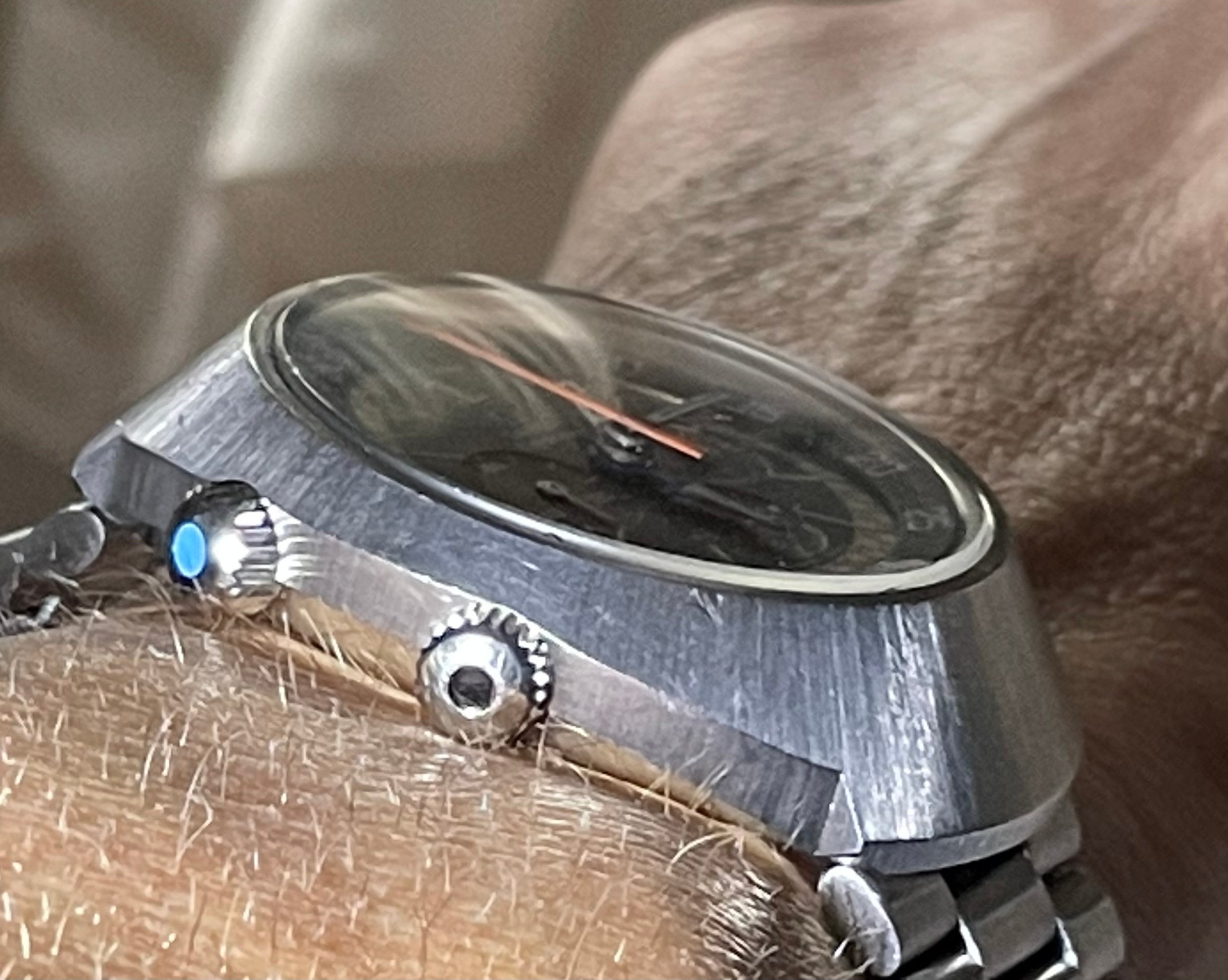 It's currently sporting a grey leather band, having tried black, brown, tan, green and blue leather bands and none ever looked quite right for it, only fitted the grey the other day...not sure it's right for it, no matter I have had a bracelet from a 007 Seamaster land in my lap and with some fettling it could be made to fit the Flighty. Though I like the grey more than the others, it brings out the grey face of the watch.