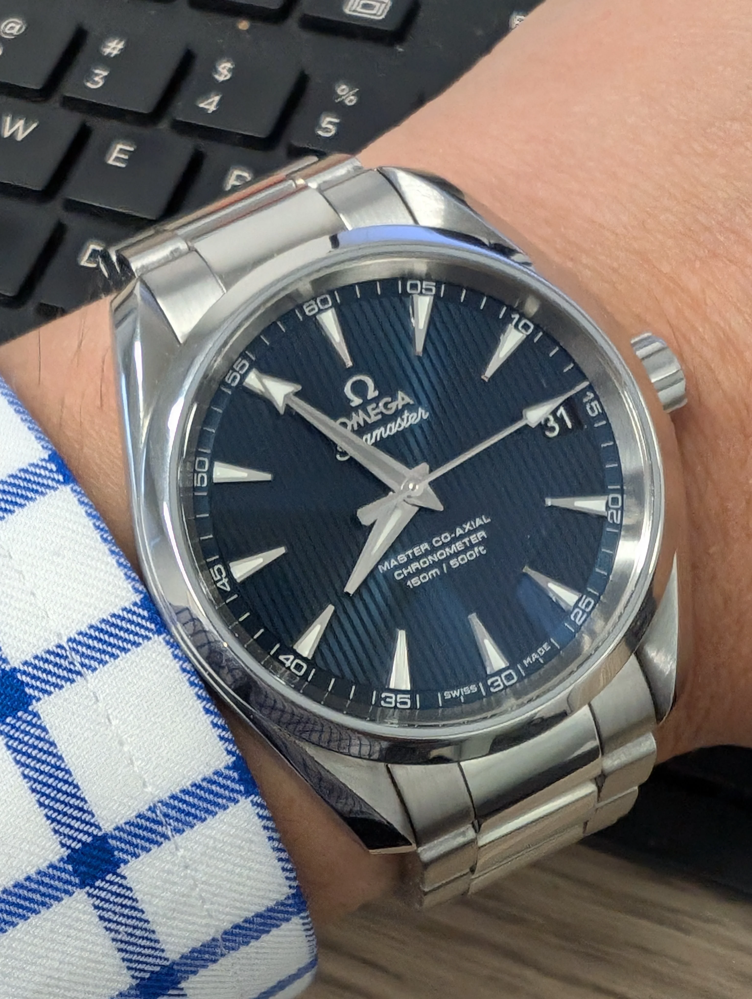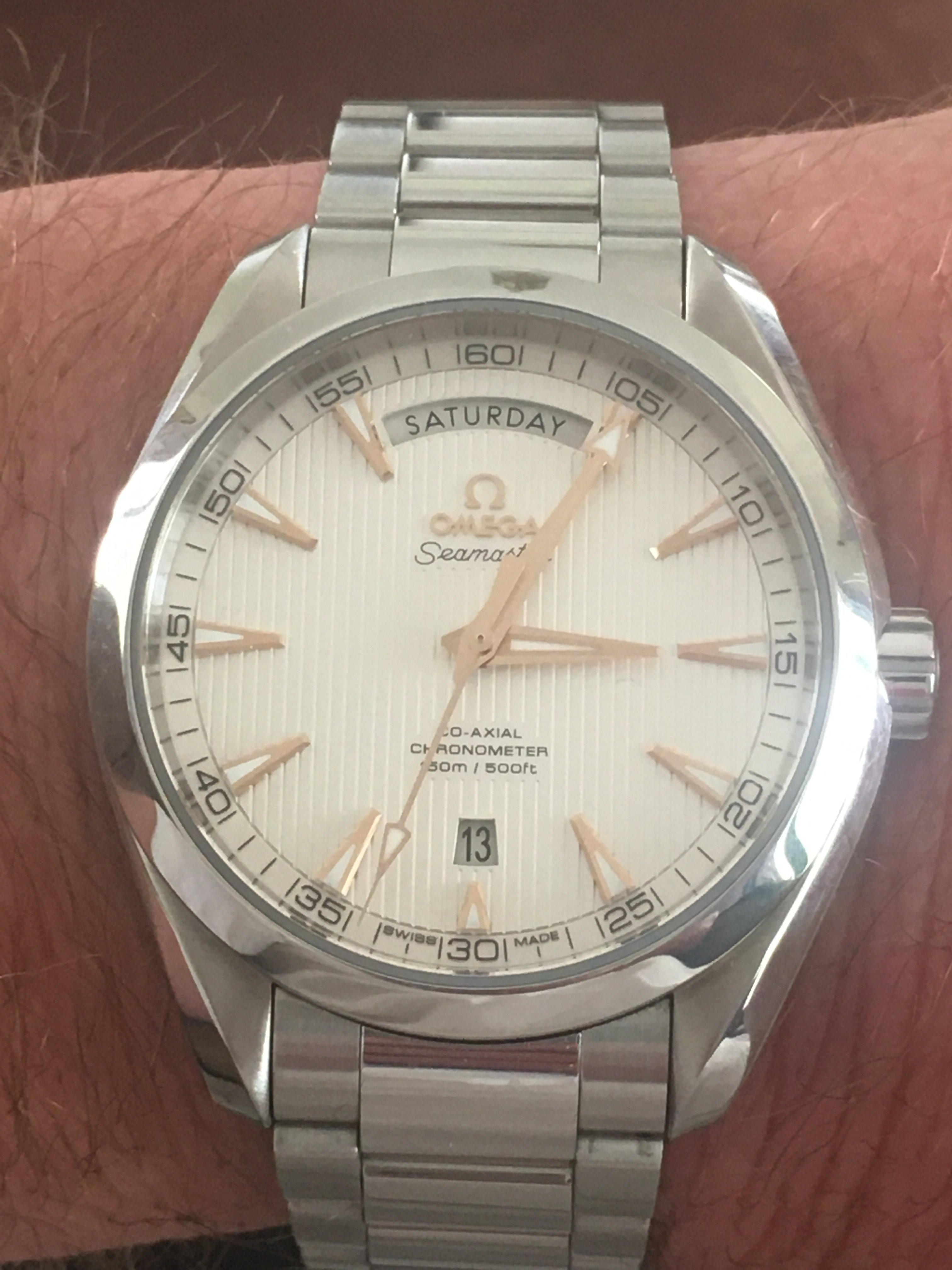 Lovely watch! Just wondering if you wouldn't mind citing your reference for this piece of information? I'm curious as to why Omega would use white gold on one generation of Aqua Terra but then discontinue it on the next, especially if there's likely a price increase. I've been trawling the web trying to verify your information but no success. Even Omega's website doesn't confirm the use of white gold for the indices. Fairly certain they would draw attention to this feature if it was present.