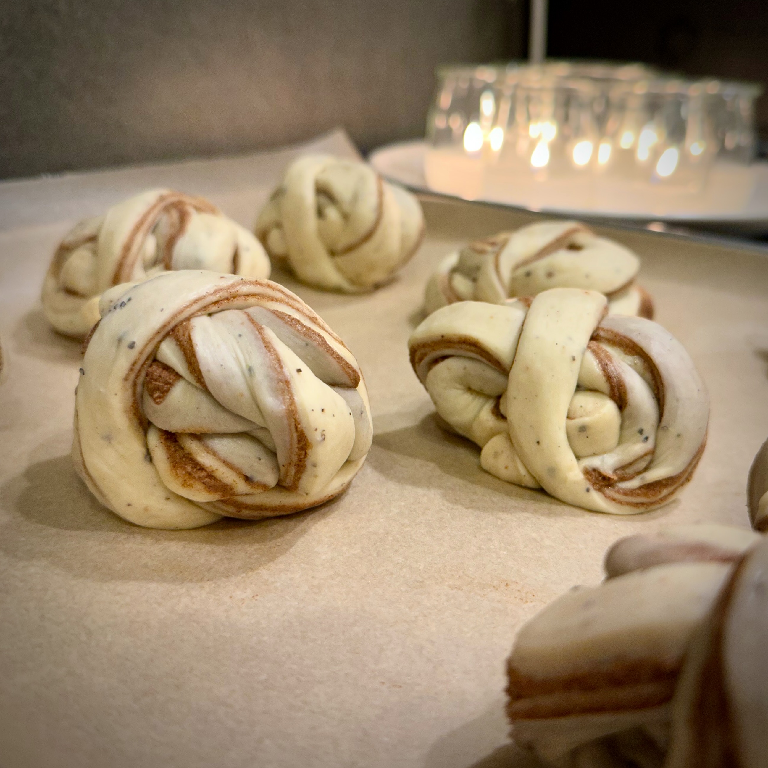 Dough is very simple, so once it's made, you let it rise for a while, roll out the bagels, and then stick them in the fridge until the next day.