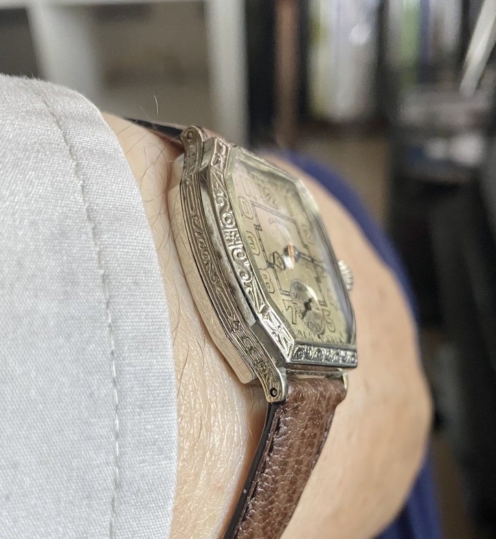 Pocket watch grade movement appearance under the hood! Interesting and appealing dial styling and features. Attractively decorated case that harks back to the era in which it was produced. Is the case solid gold rather than rolled gold?