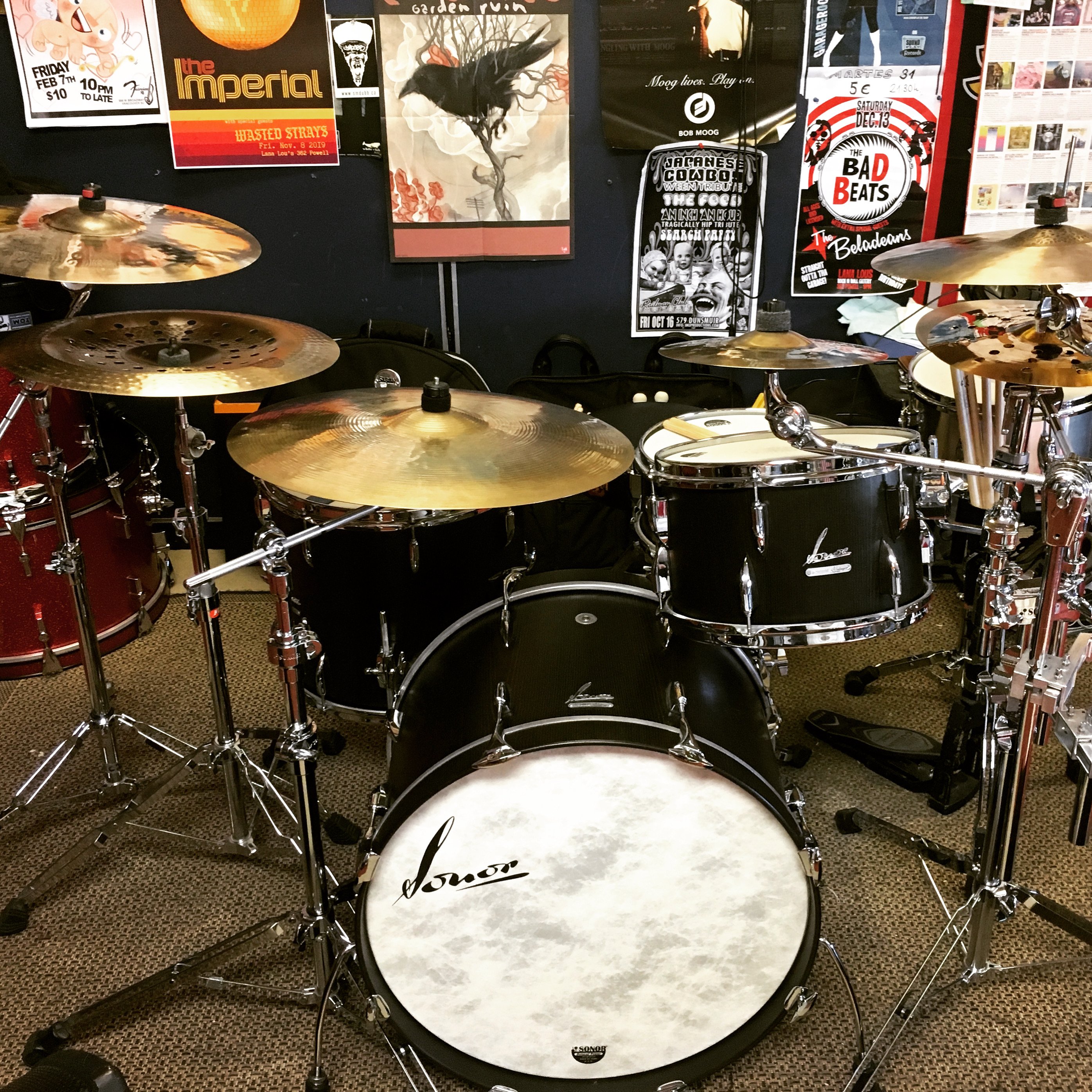 My office today: Sonor Vintage Series (matching Sonor snare or Dunnett 2N stainless steel).