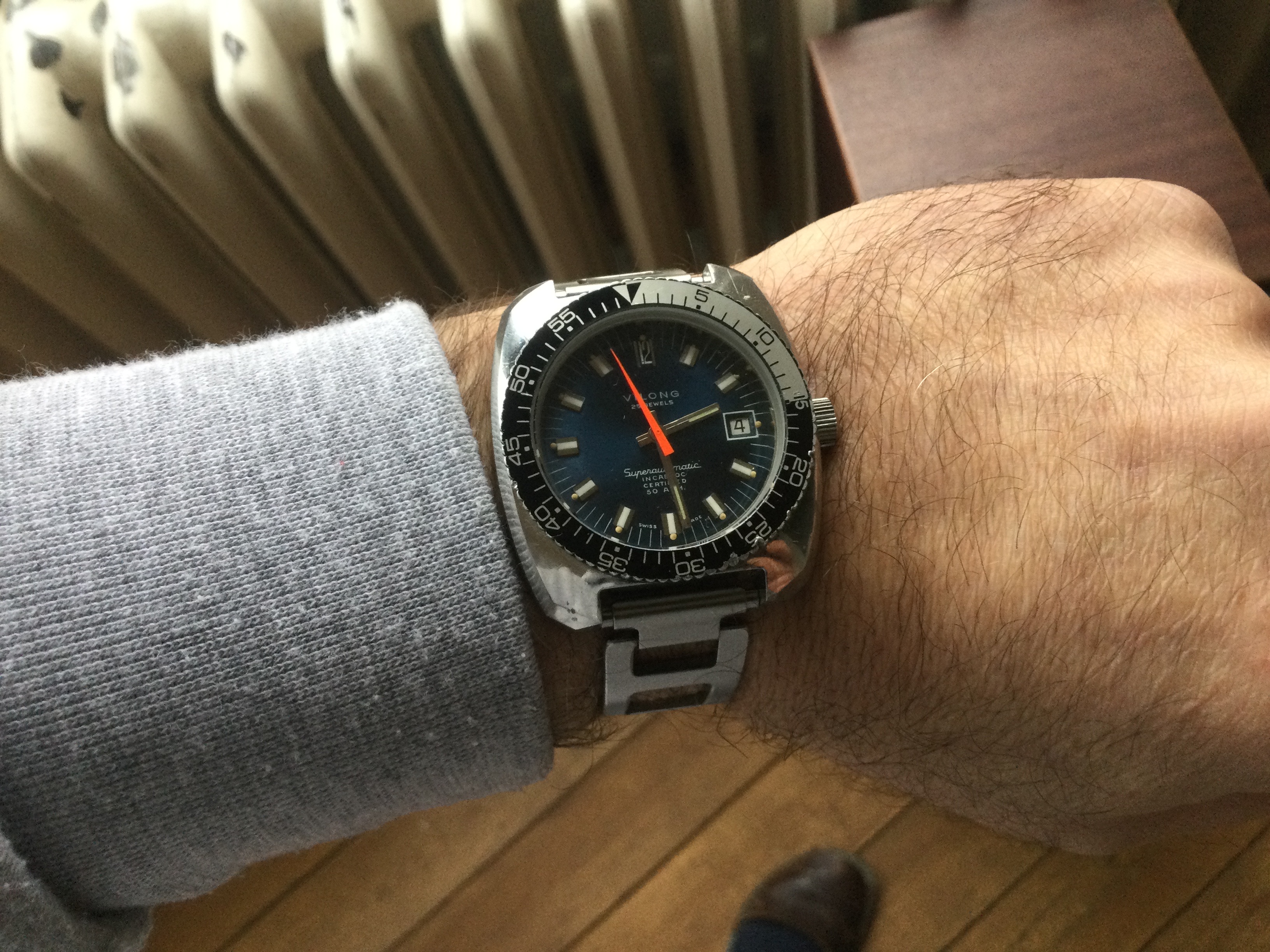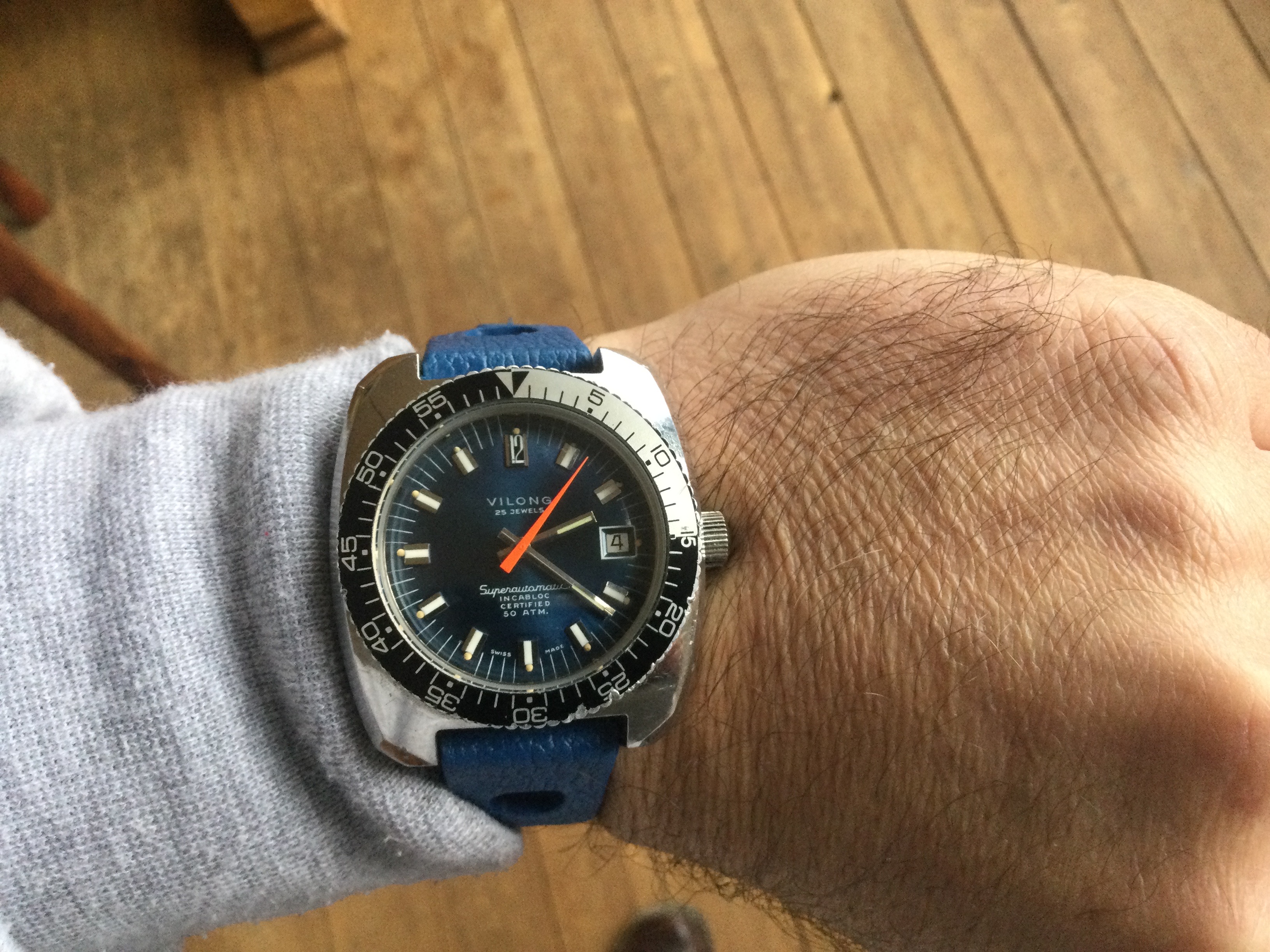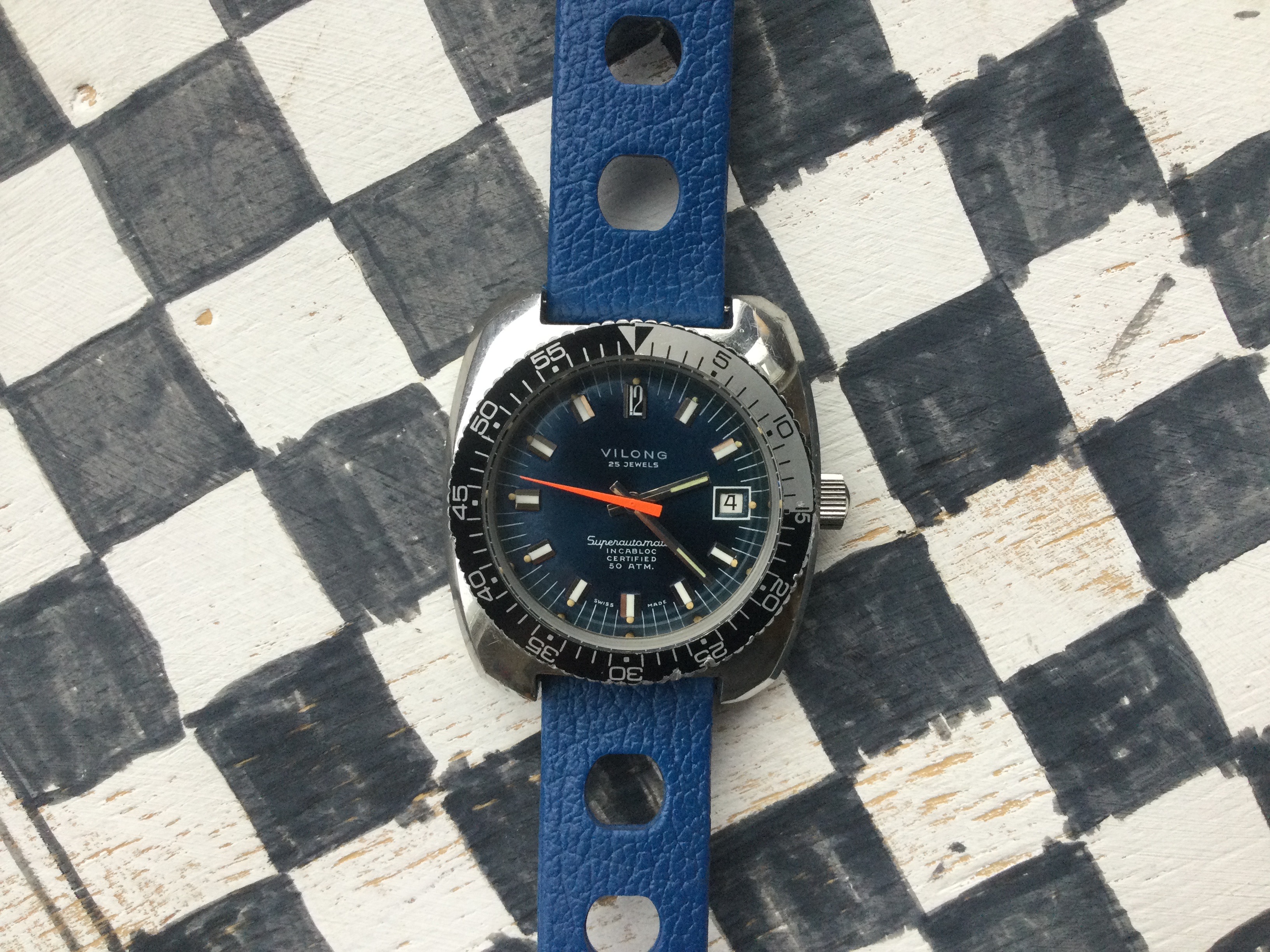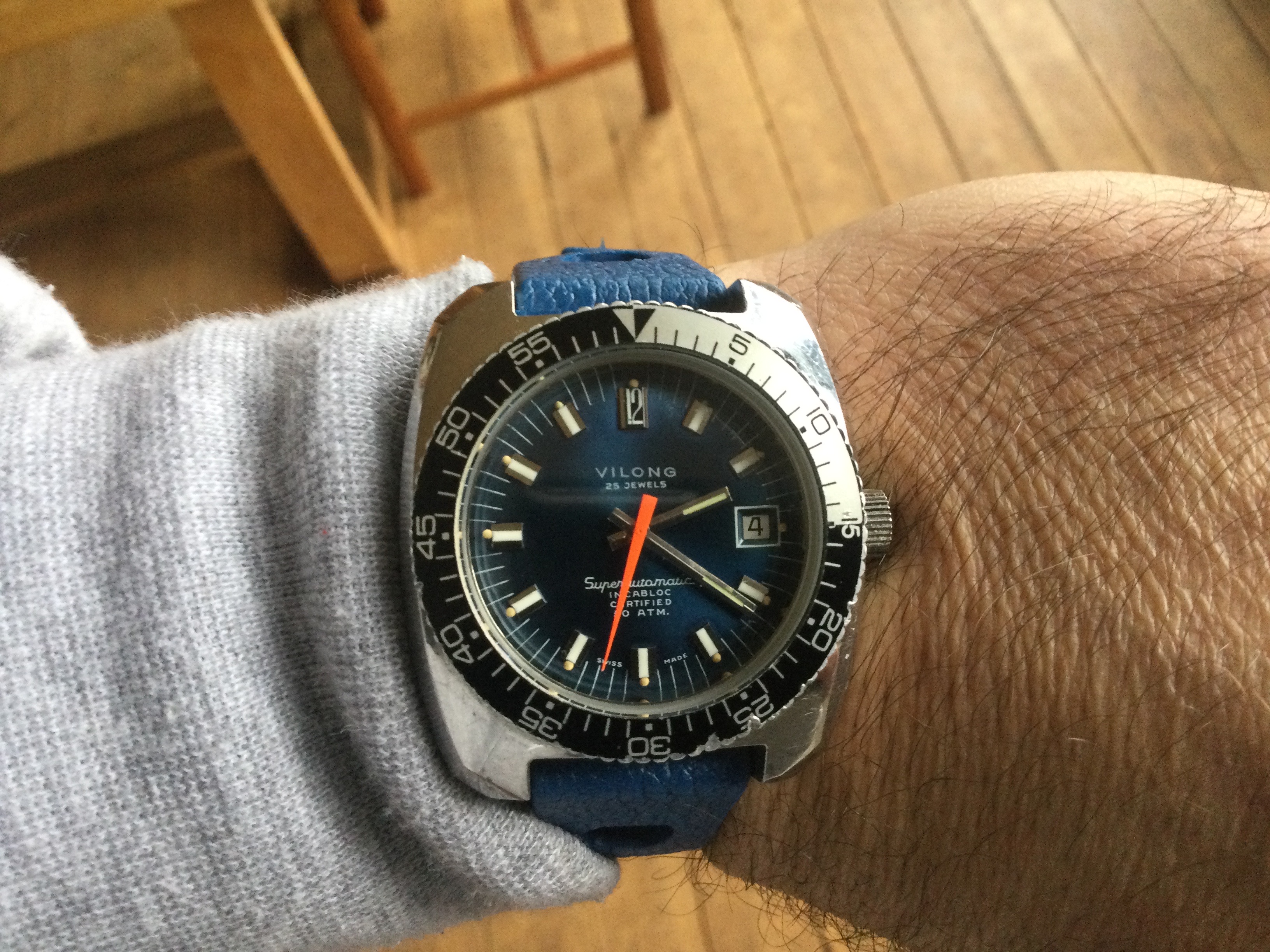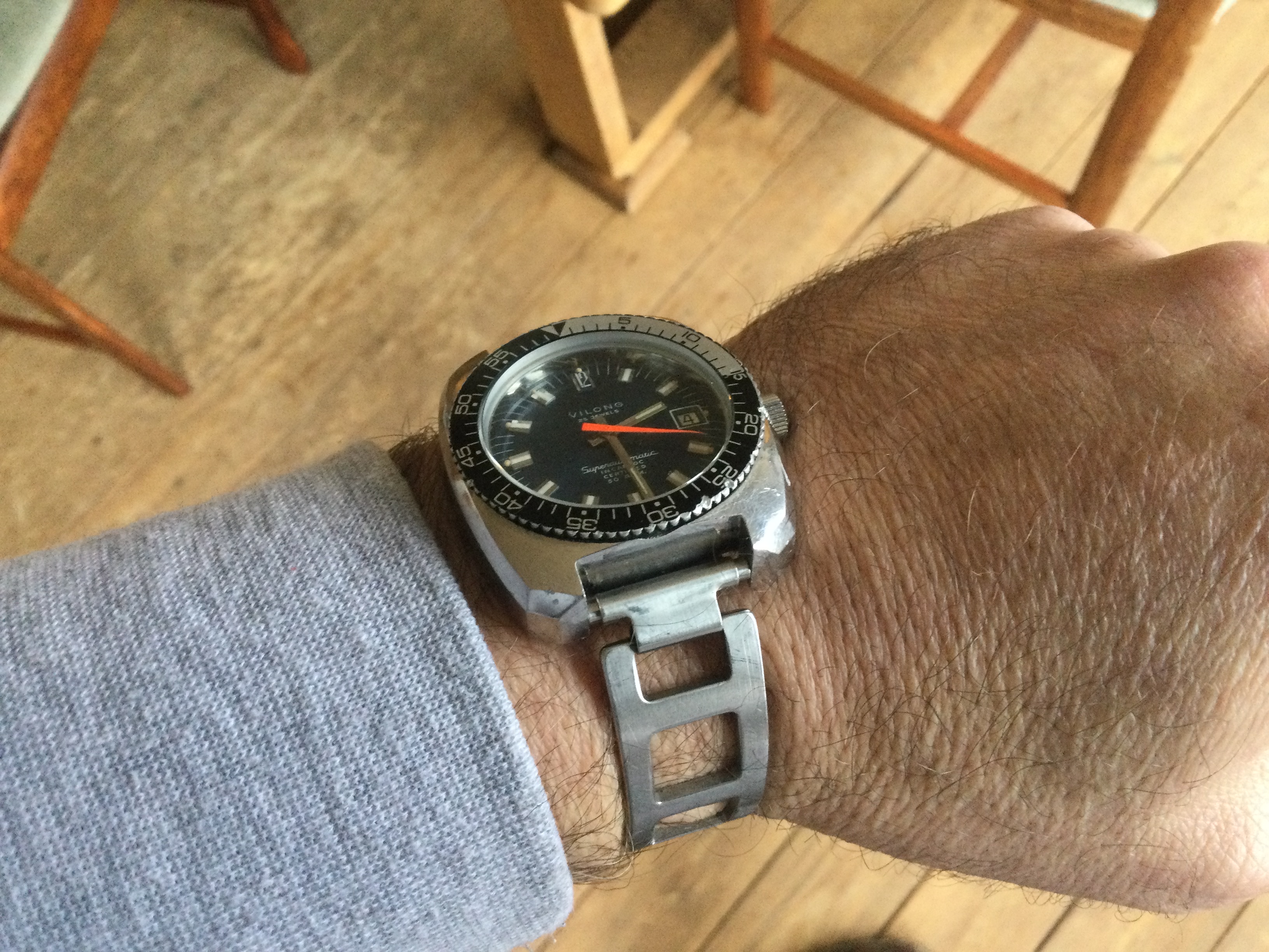·Two days ago, I went to my watchmakerwas to recover a watch. As I was hanging out looking at potential purchases, after some discussions, I selected three watches for a nice price. Among them, was this sturdy diver’s watch made by Vilong. My WM told me, trying to tempt me : « It’s serviced and it is a real diver’s watch with screw down crown and waterproof to 500 m. » I wasn’t in love but you know temptation is always there…