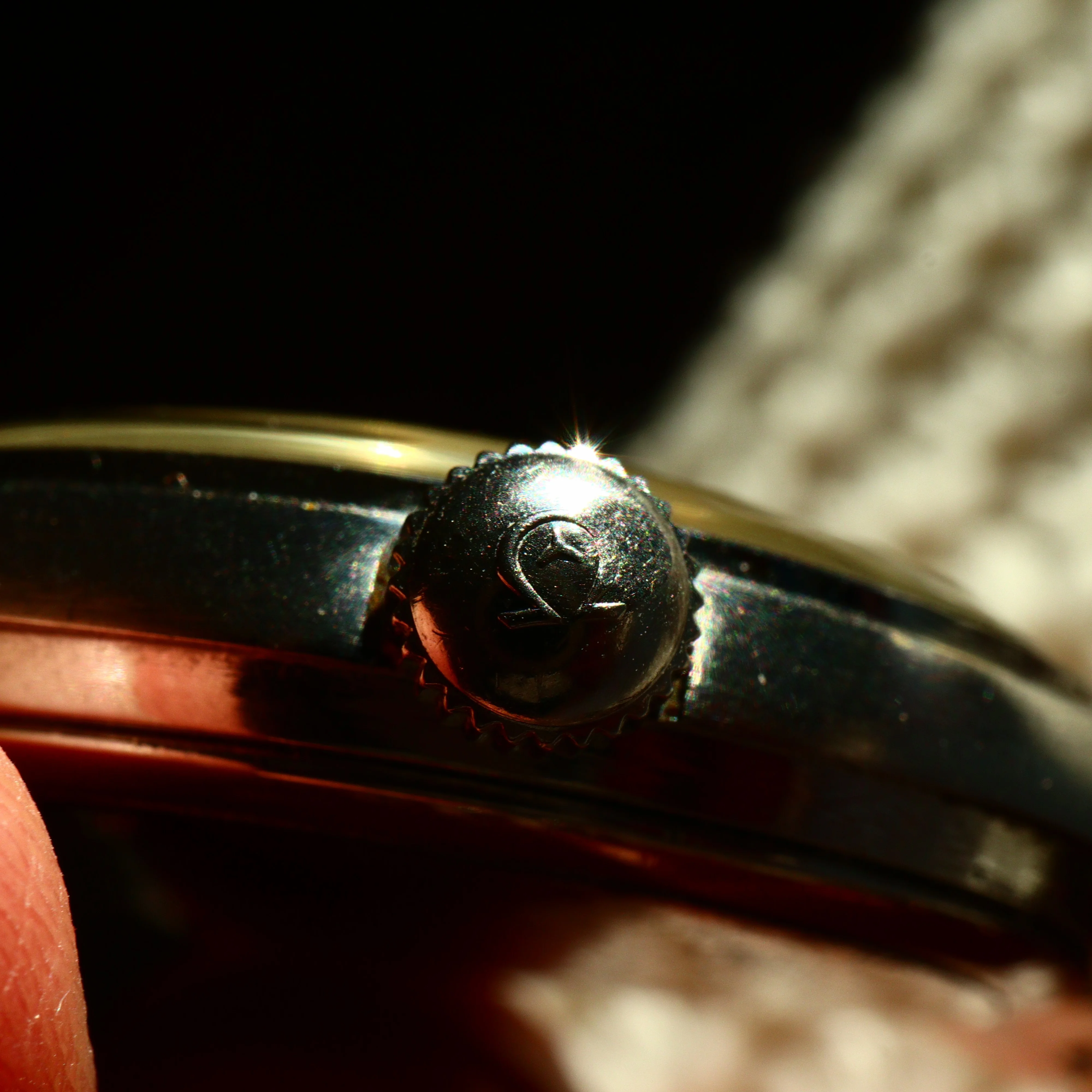 It came with a super-thin service crown as most do. I sourced a (what I believe to be) period correct niad crown.