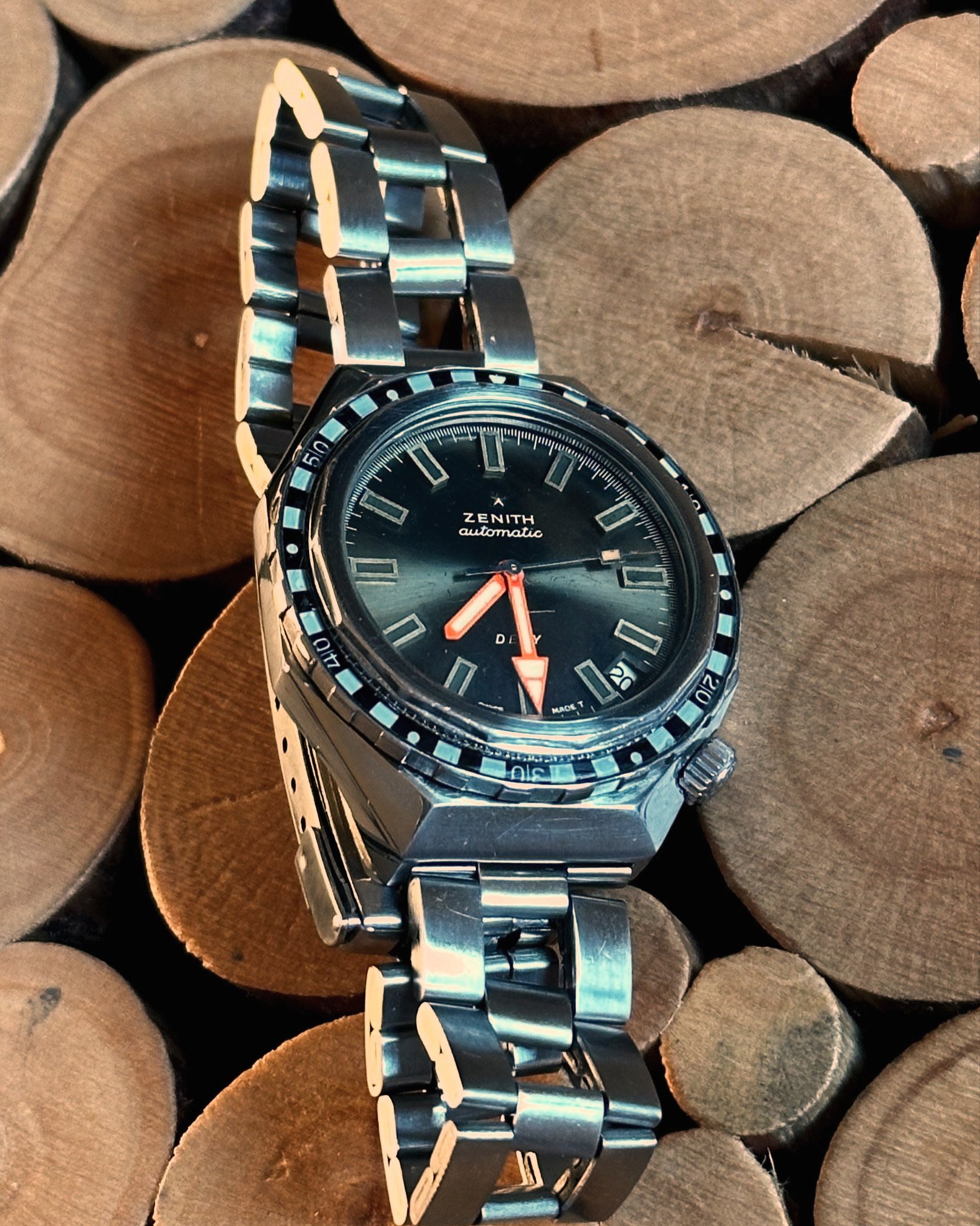 The Sub-Sea line also includes two other references which were released later. These don't have a bakelite bezel and have unique hands. The dials are blue, beige and black. Note the reference numbers used for these are based on the newer reference system that was introduced by Zenith in 1972. Finally, the movement used in these is the automatic cal 2572 PC.
