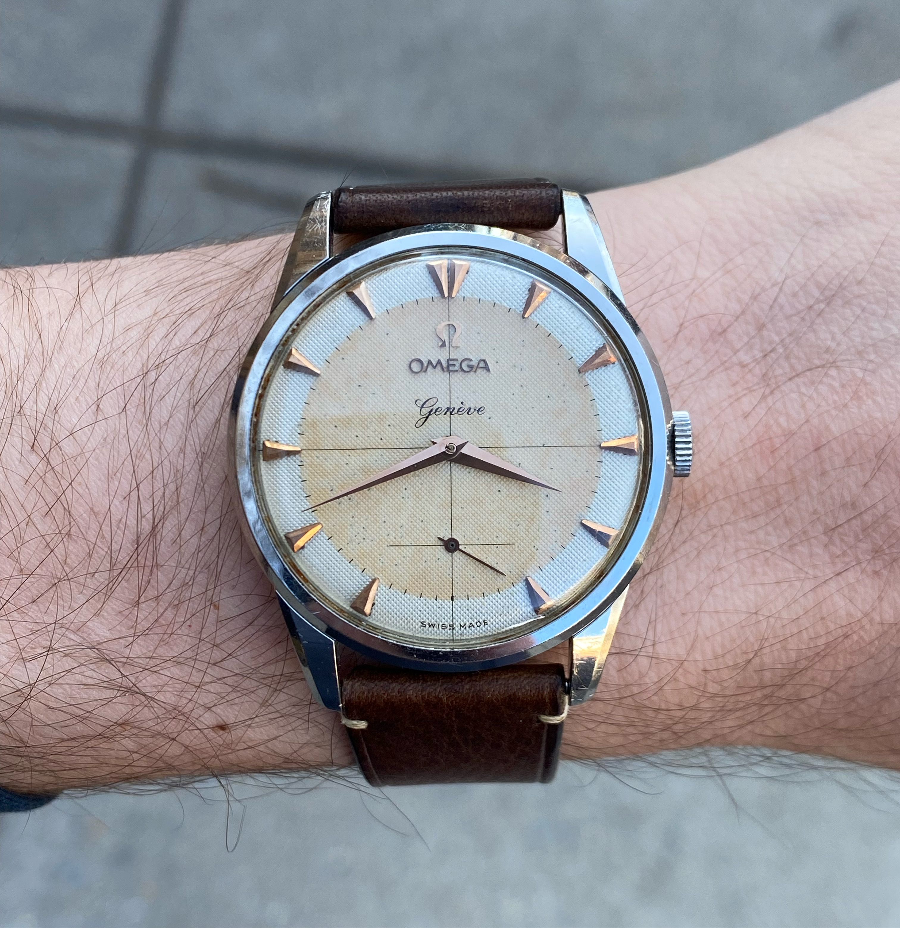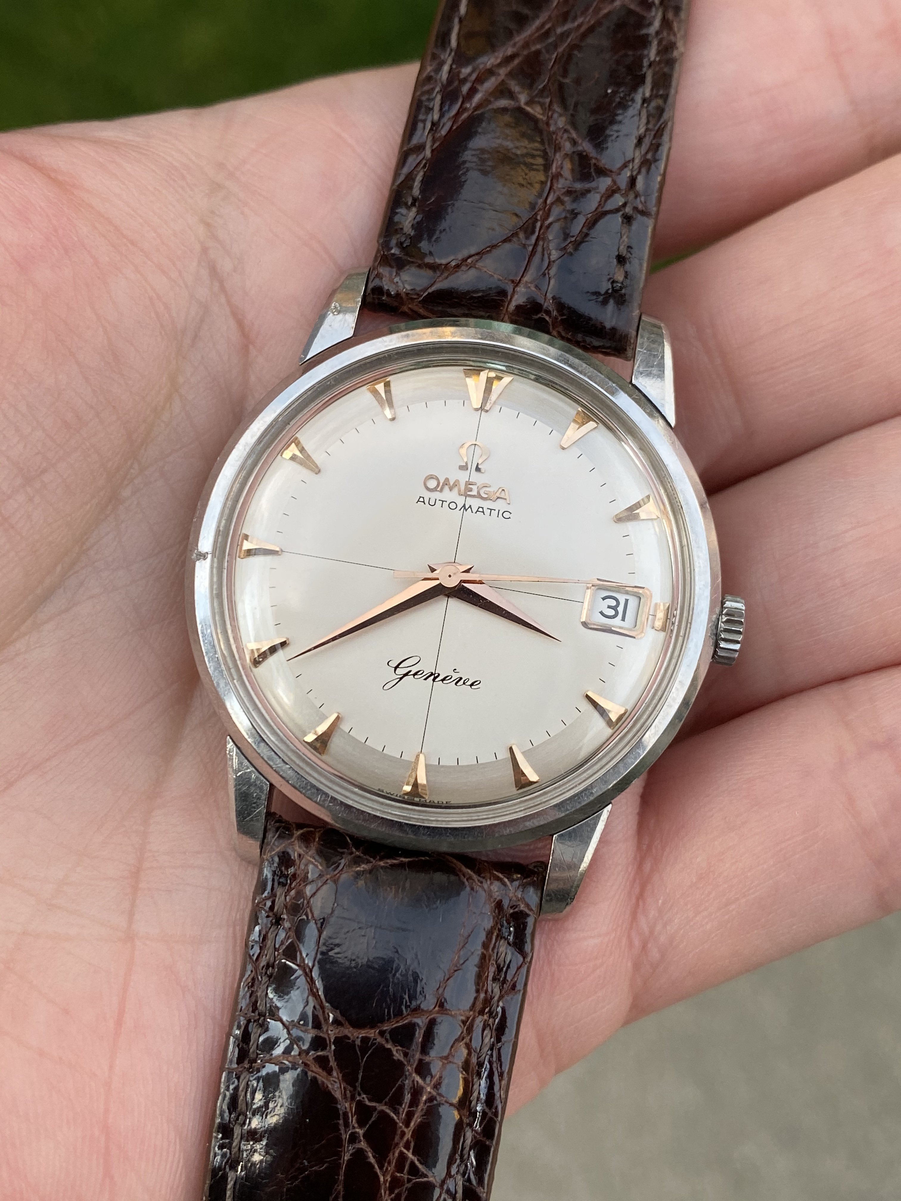 I love the old Geneves. Such classy watches. And they are a bitch to find in good original condition now. Here’s my 1959 reference 2903 manual wind with a stainless steel case and rose gold dial furniture. Fully original. Still looking for a solid gold example in similar condition.