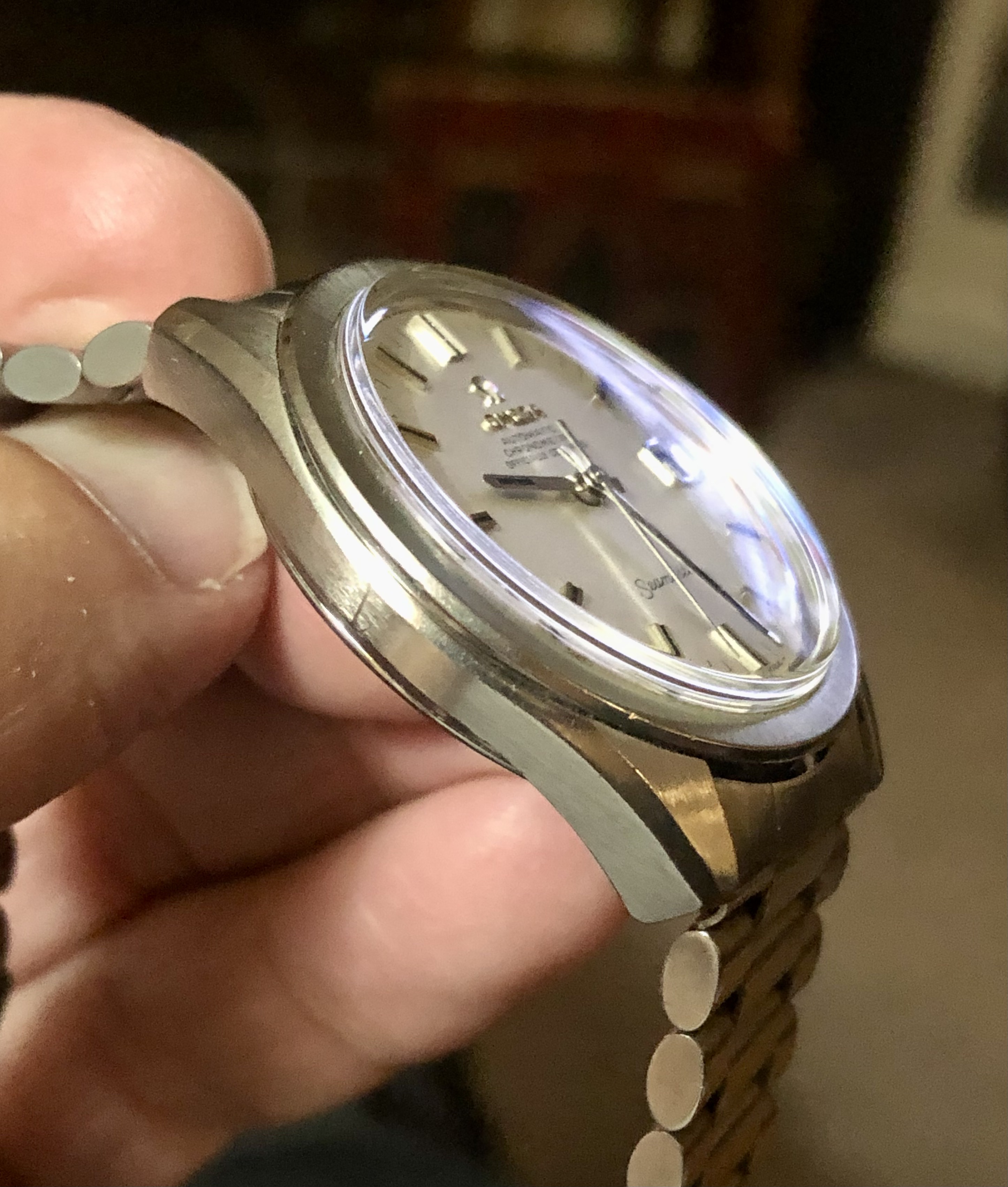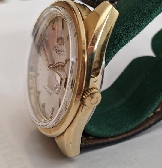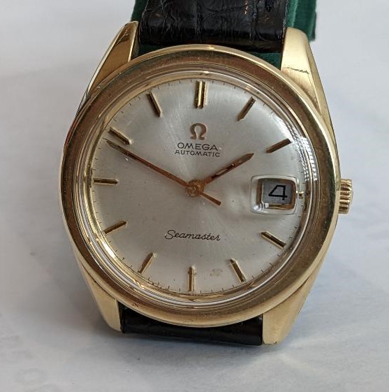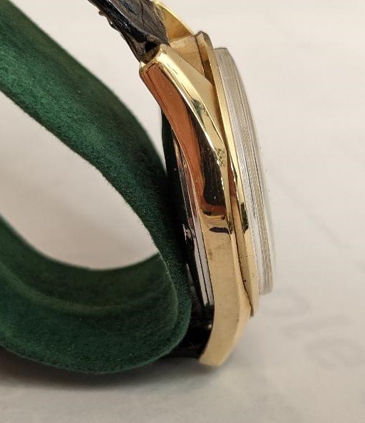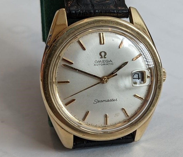 ·My brother is terrible with watches...he needs them to be very simple and easy to remember how to use. He came over recently to show me his Omega bumper wind Seamaster Date gold cap. He wasn't sure it was working or how to change the date. He also thought that I might have given it to him. And yes I might have but neither of us remember when that might have been, and I can't even remember where or when I got it. My past is filled with so many watches I have forgotten I owned. Any way, I could tell right away that this was one of that generation of bumpers that you were just supposed to give a couple of shakes and strap it on. Playing with the date, I quickly figured out you changed it by pulling out and then pushing back in, the crown. The date window has a lovely gold picture frame window plus the Omega version of the cyclops. And the more I played with and studied the watch, the more I liked it. It is yellow gold cap, screw back case, silver dial with gold and black markers and black and gold hands, no luminous material. The lugs are what knock me out...truncated and stubby (like a Lamborghini)...it just has a great presence. A dress Seamaster, in my opinion. I don't know what I'm going to do with it yet. I gave my brother one of my Rolex 1018s on a Jubilee bracelet, I took this off his hands. I keep thinking I need to thin the herd but I put this on my wrist and it doesn't want to leave. I don't open my watches, so any info on the model would be helpful... years made, probable movement, etc., any and all thoughts would be appreciated.