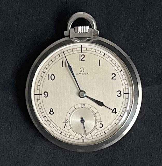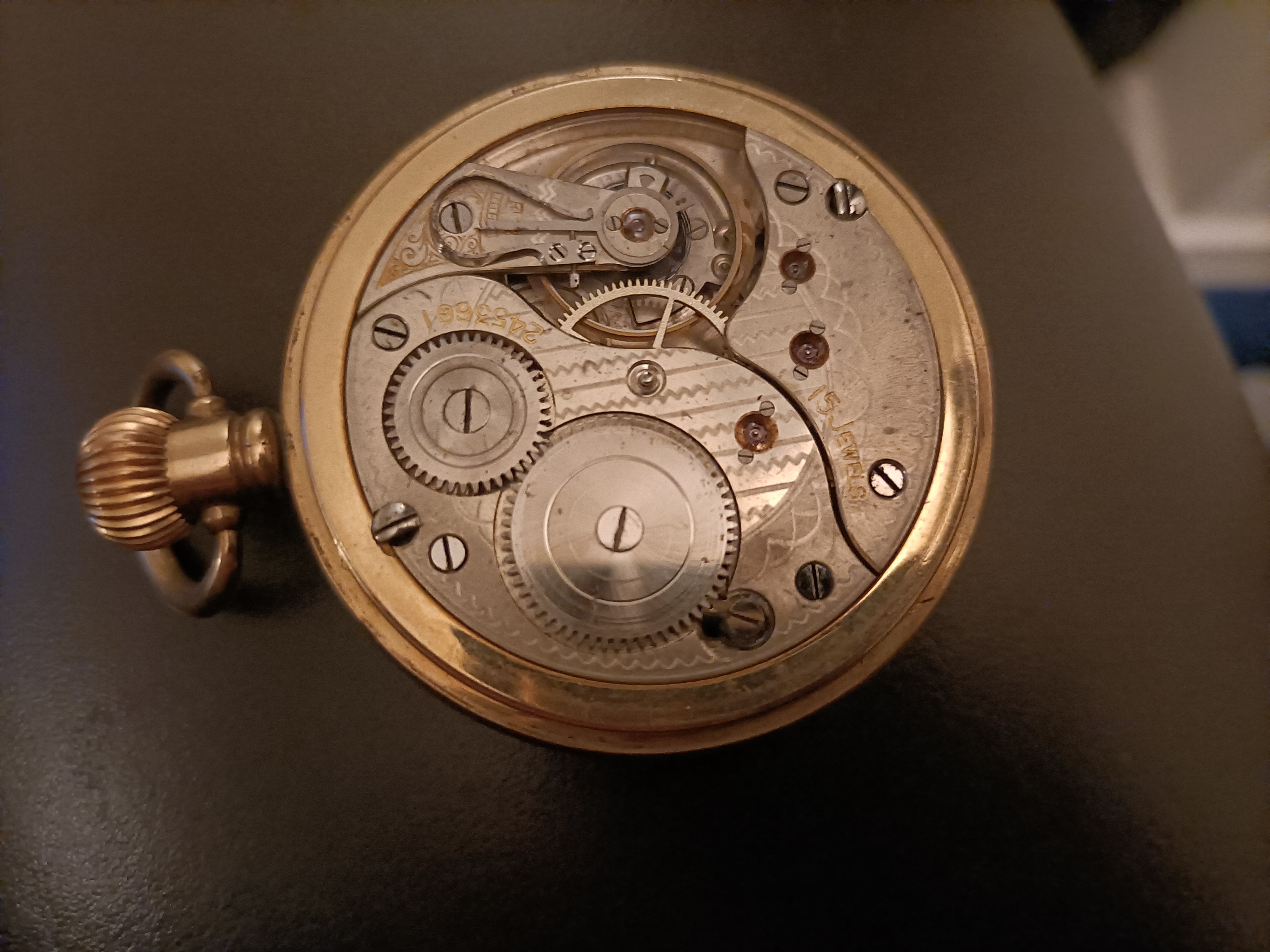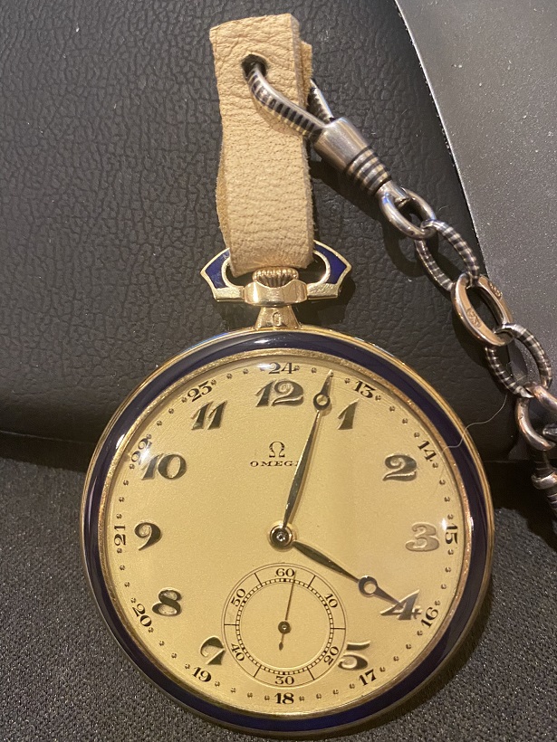 Okay! I’ll play. I’ve shown this watch before. Many times. The founder of the watch company that became Omega was Louis Brandt. The firm was renamed Omega after his death. This is one of two Brandts that I have. The dial is marked Louis Brandt & freres as is the movement. The movement is a grade CCR with 19-jewels, patent regulator, Breguet hairspring, bi-metallic, temperature compensating balance wheel, jewelled safety barrel, adjusted for 5 positions, heat, cold, and isochronism. It was approved for use on numerous railroads in Canada, and I believe also in the USA. It is a companion to the grade CCCR model with 23-jewels. Six jewels in gold chatons. This picture was taken before the era of the mystery braid lanyard made by Dave.