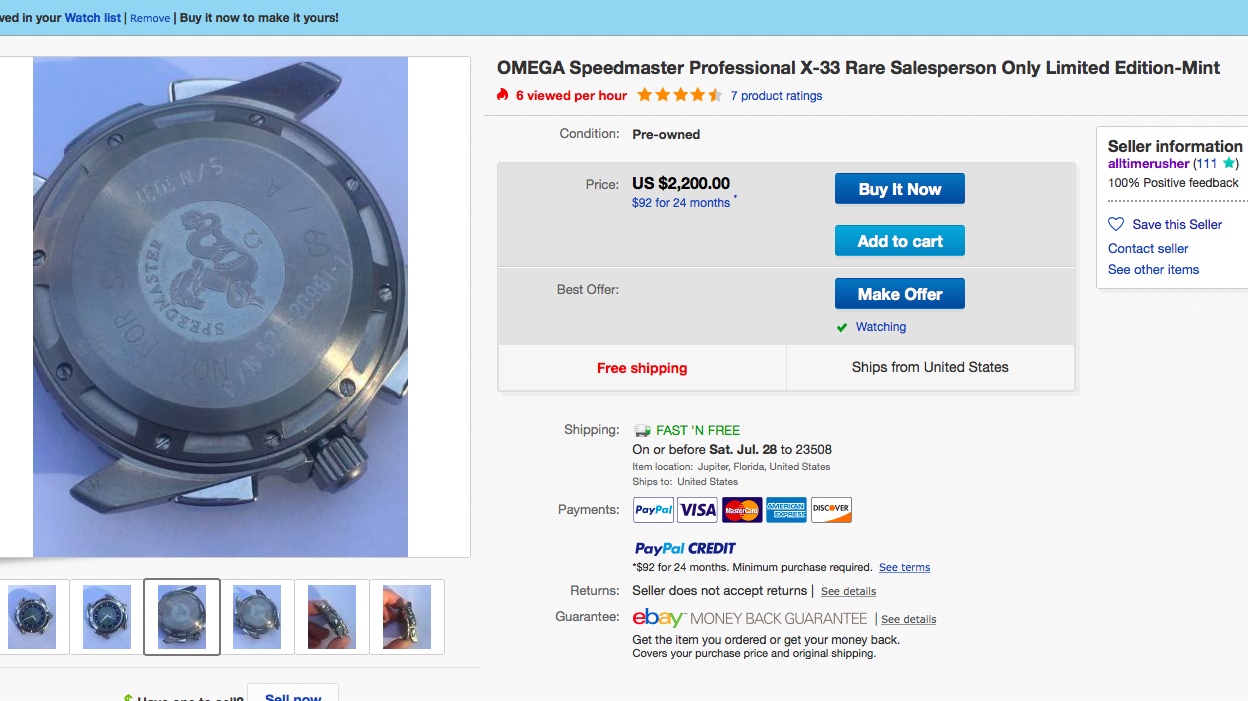 This NASA issued X-33 popped up on eBay one evening with a BIN $2200 price from a seller in Jupiter Florida just south of Cape Canaveral. Knowing better and having a feeling something about it was not quite right I was hesitant to buy it fearing legal repercussions. I reached out to Omega to see what their interest was as well as contacting my contact at the GSA. After watching it sit for 4 days I finally received information back from Omega and the GSA on the same day saying they had no interest in the watch and laid no claim to it. I immediately went to purchase it and it was gone after being there an hour earlier.