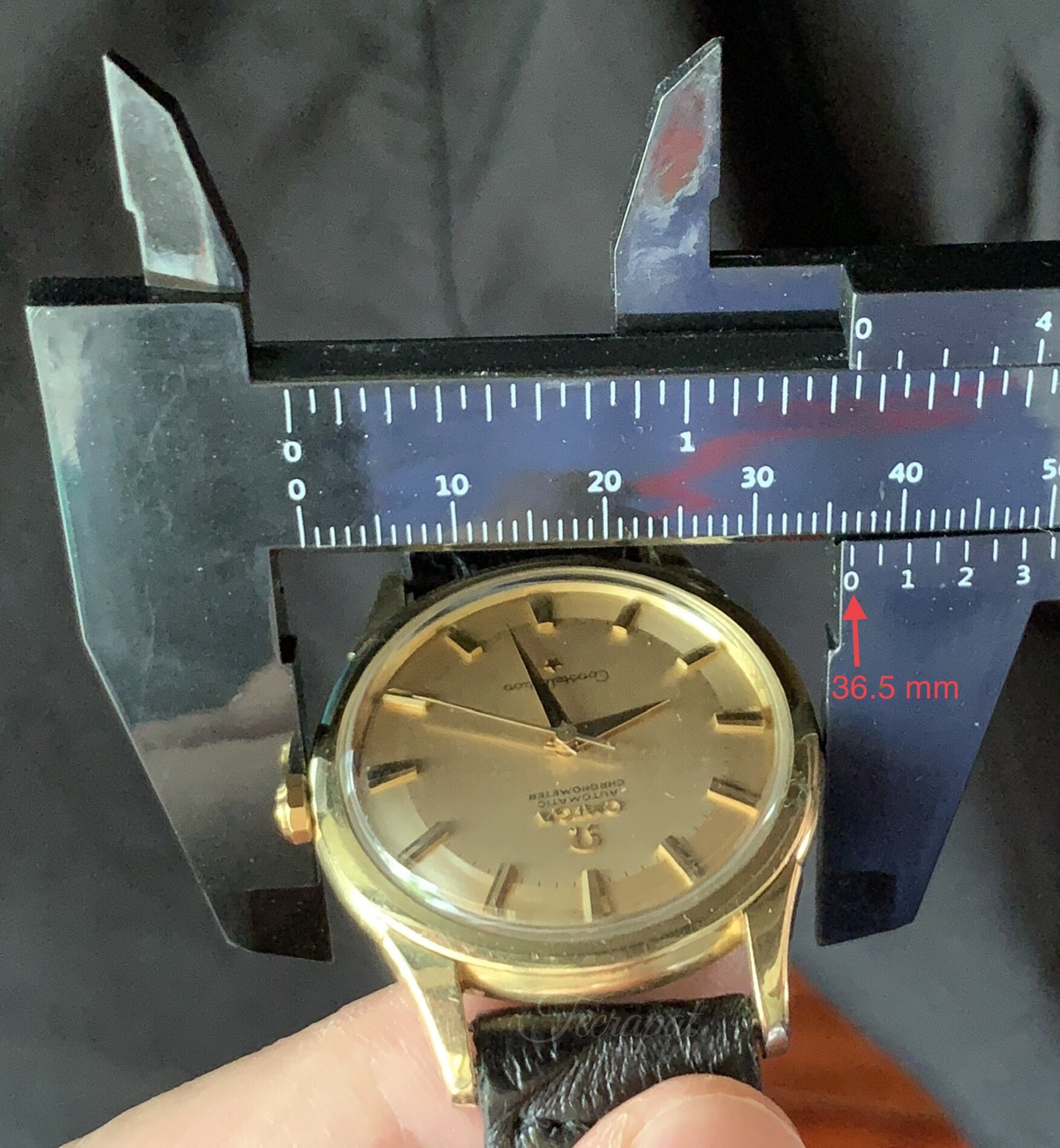 It came with the larger case approximately 36.5mm excluding the crown and 38.5mm including the crown.