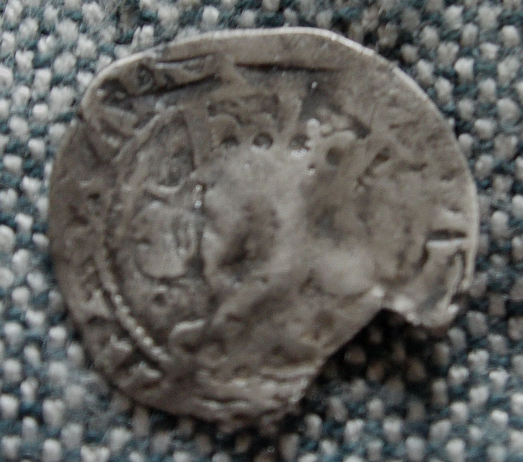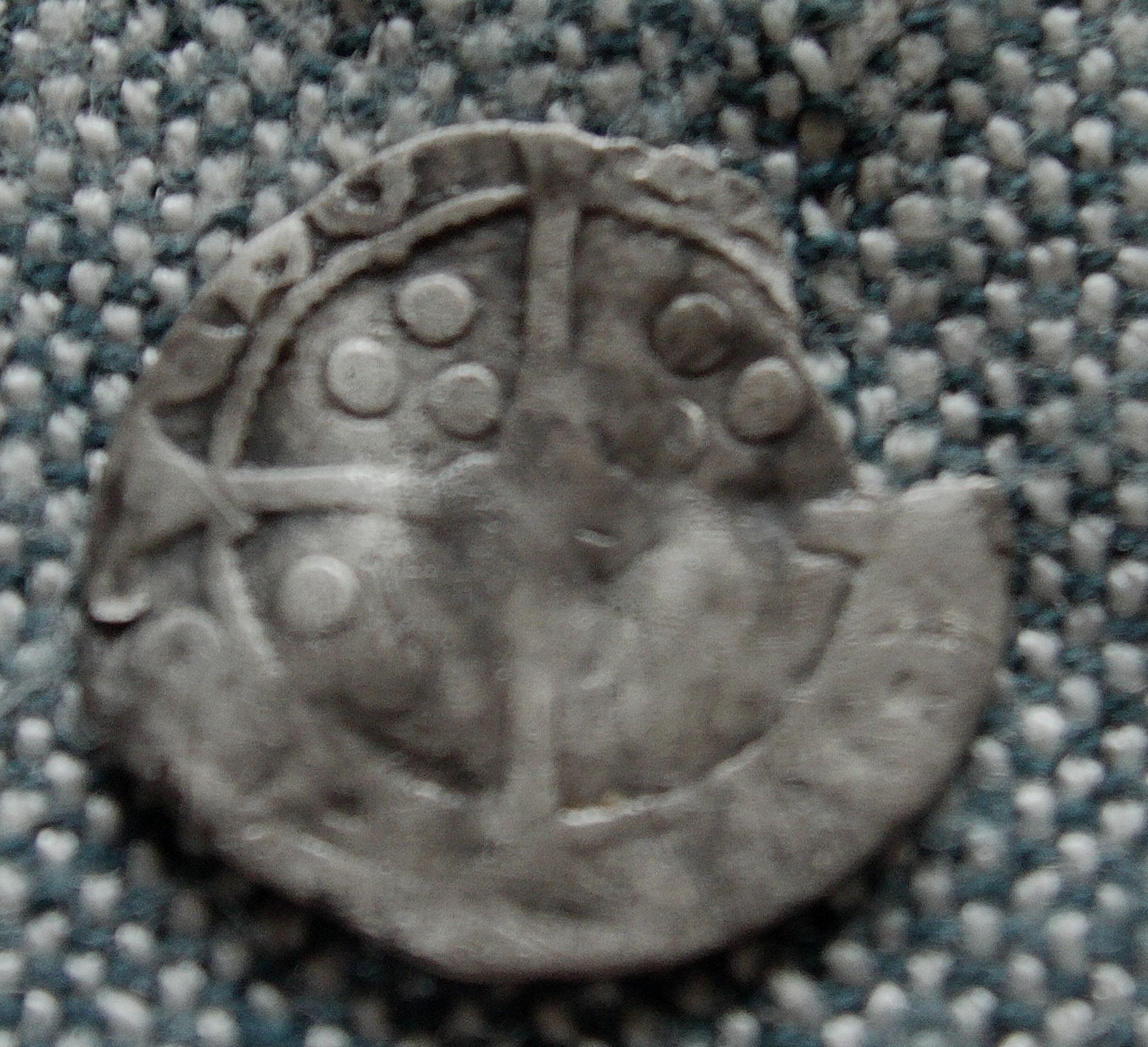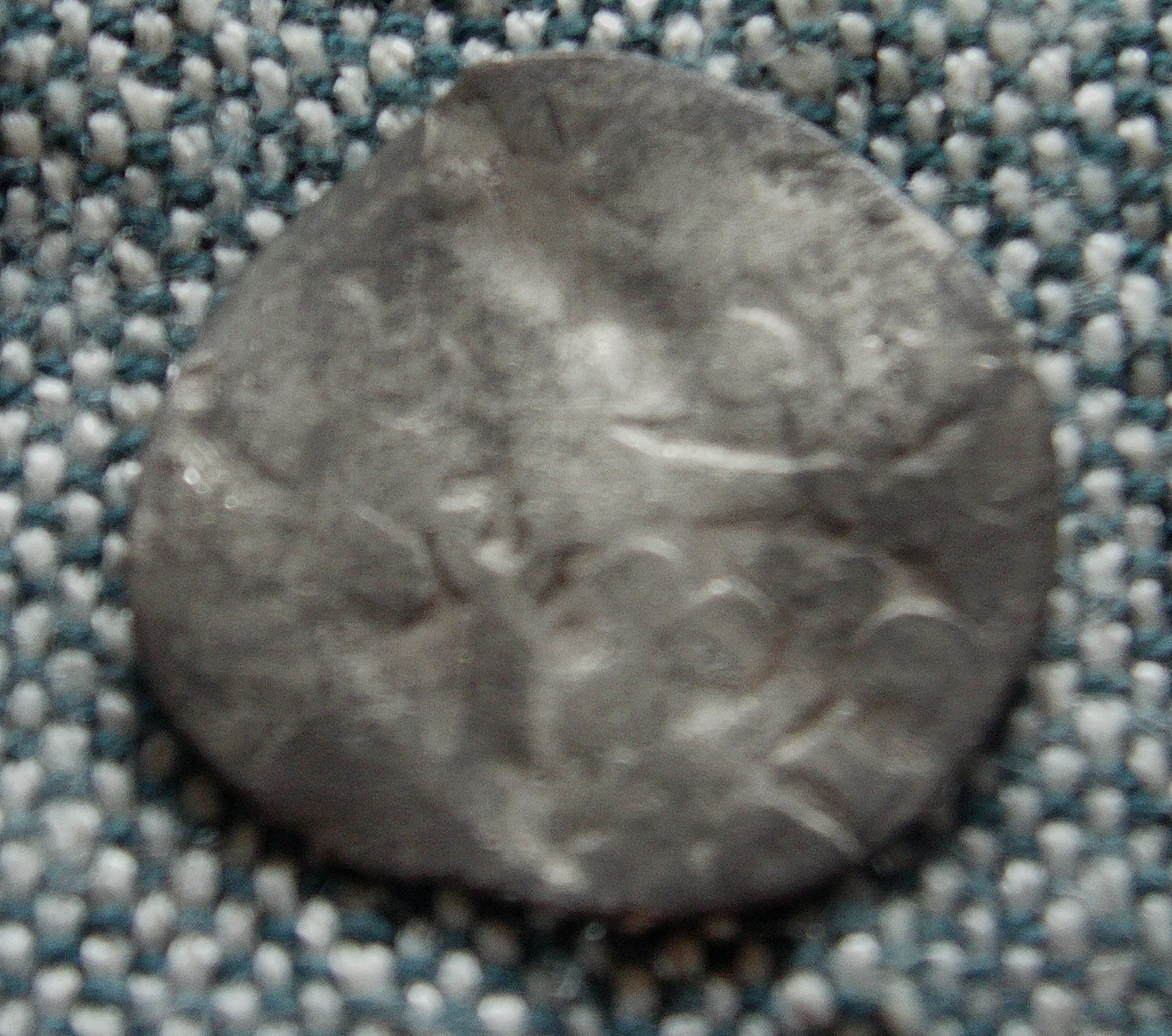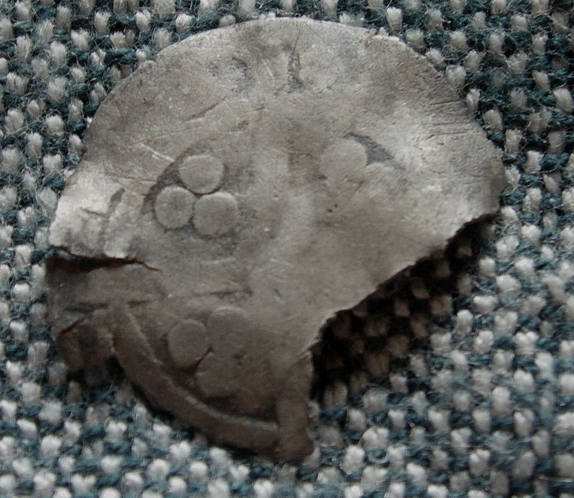 Another of our finds from the same general location. We knew it wasn't English but couldn't identify it and my Dad's label in the box reads "Dutch? 12th cent." At the time we dismissed it as worn and not very interesting. Now, a quick image search for [hammered silver coin sheaf arrows] reveals that in fact it's a coin of Ferdinand and Isabella of Spain, possibly a reale. That's the same Queen Isabella who sponsored Columbus, the Spanish sailor who ran across something or other, I forget what.