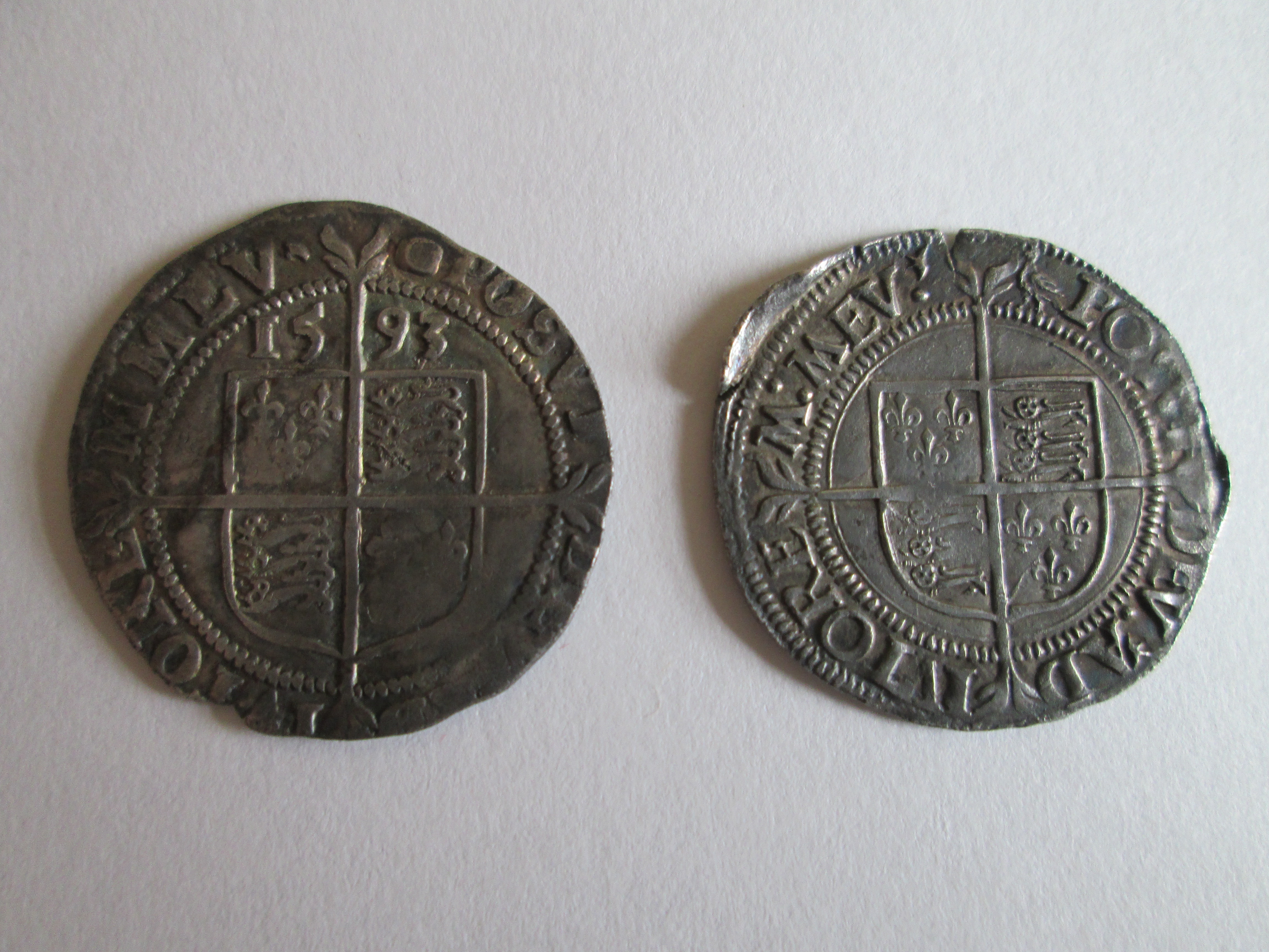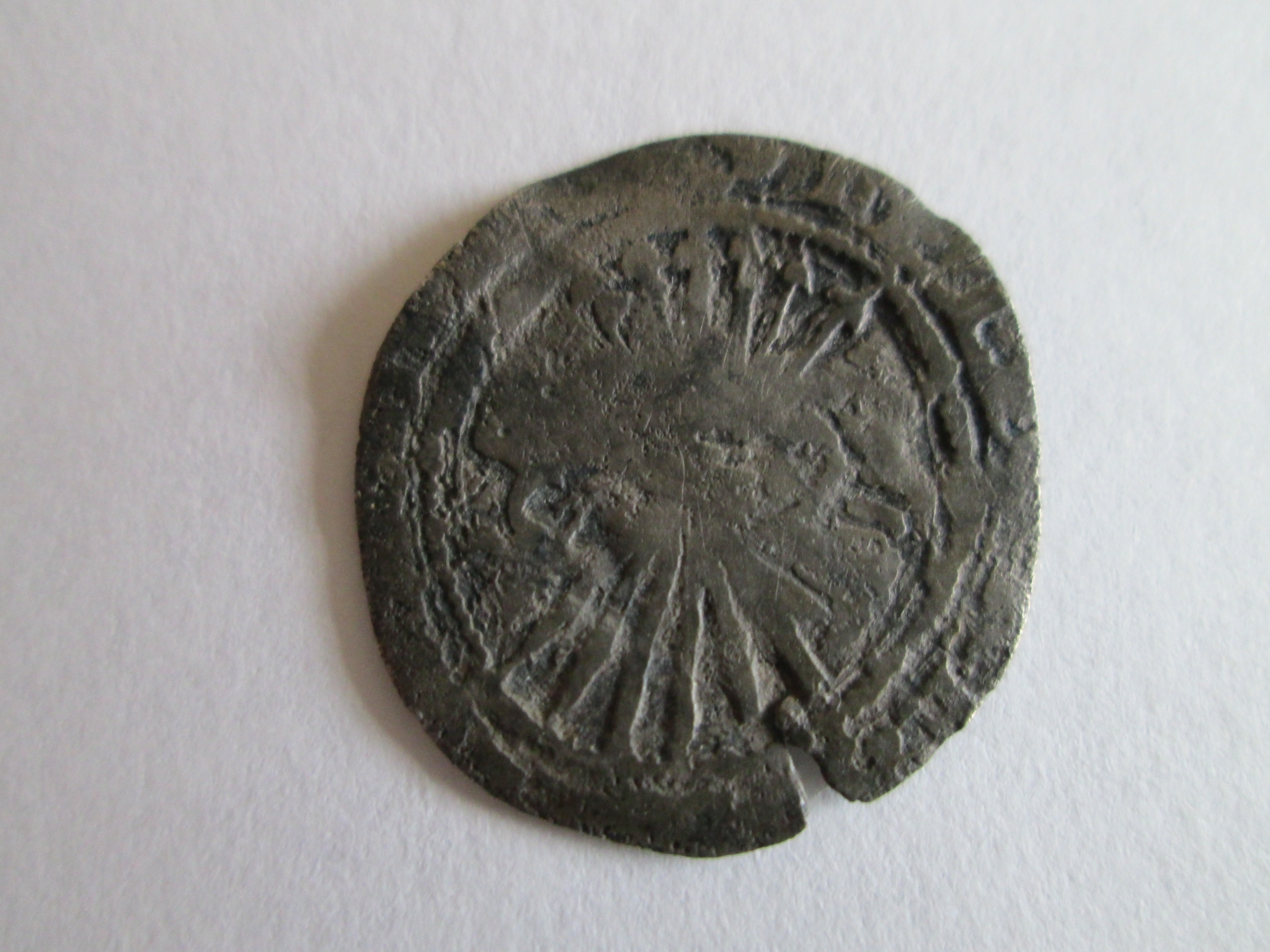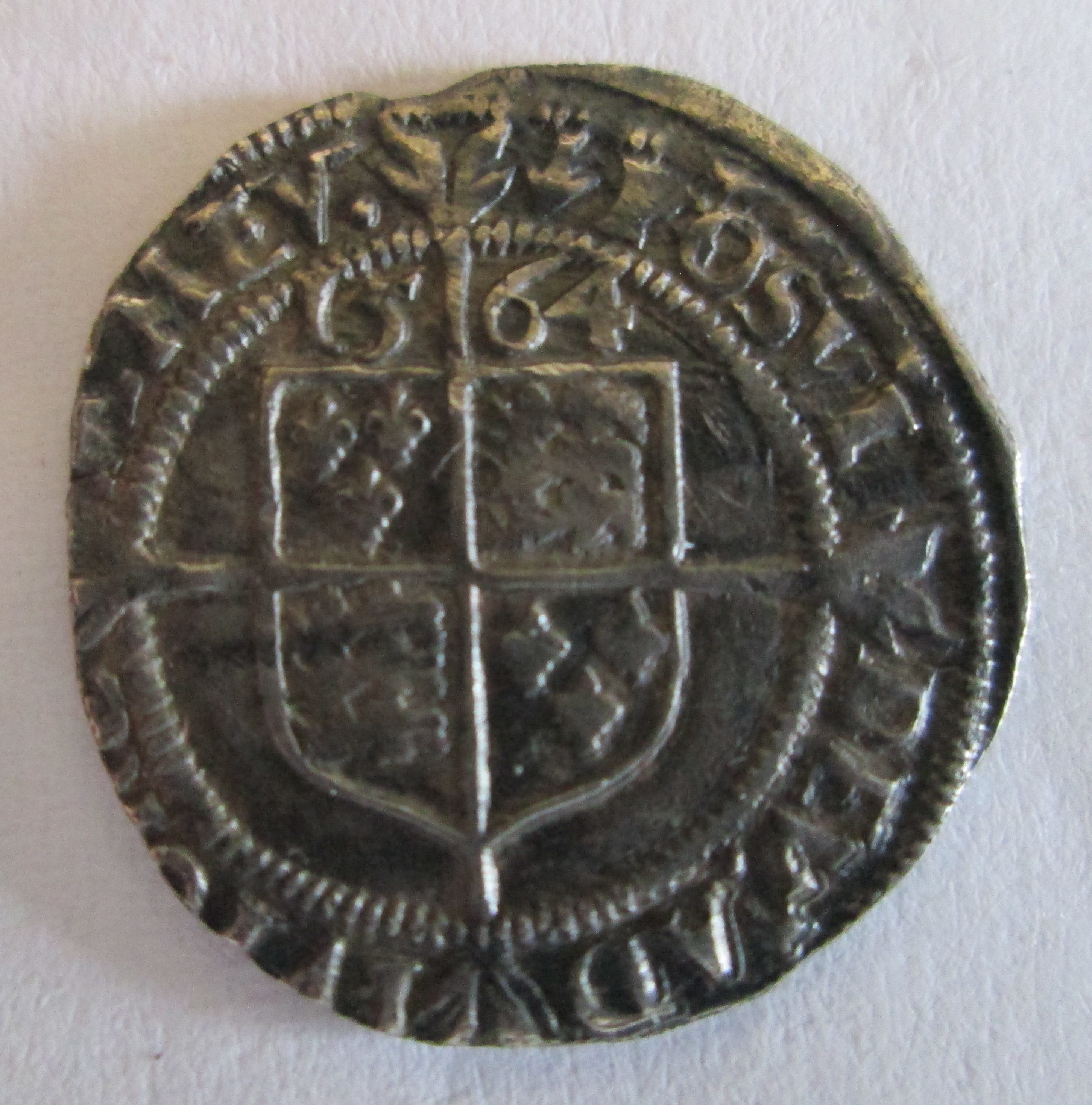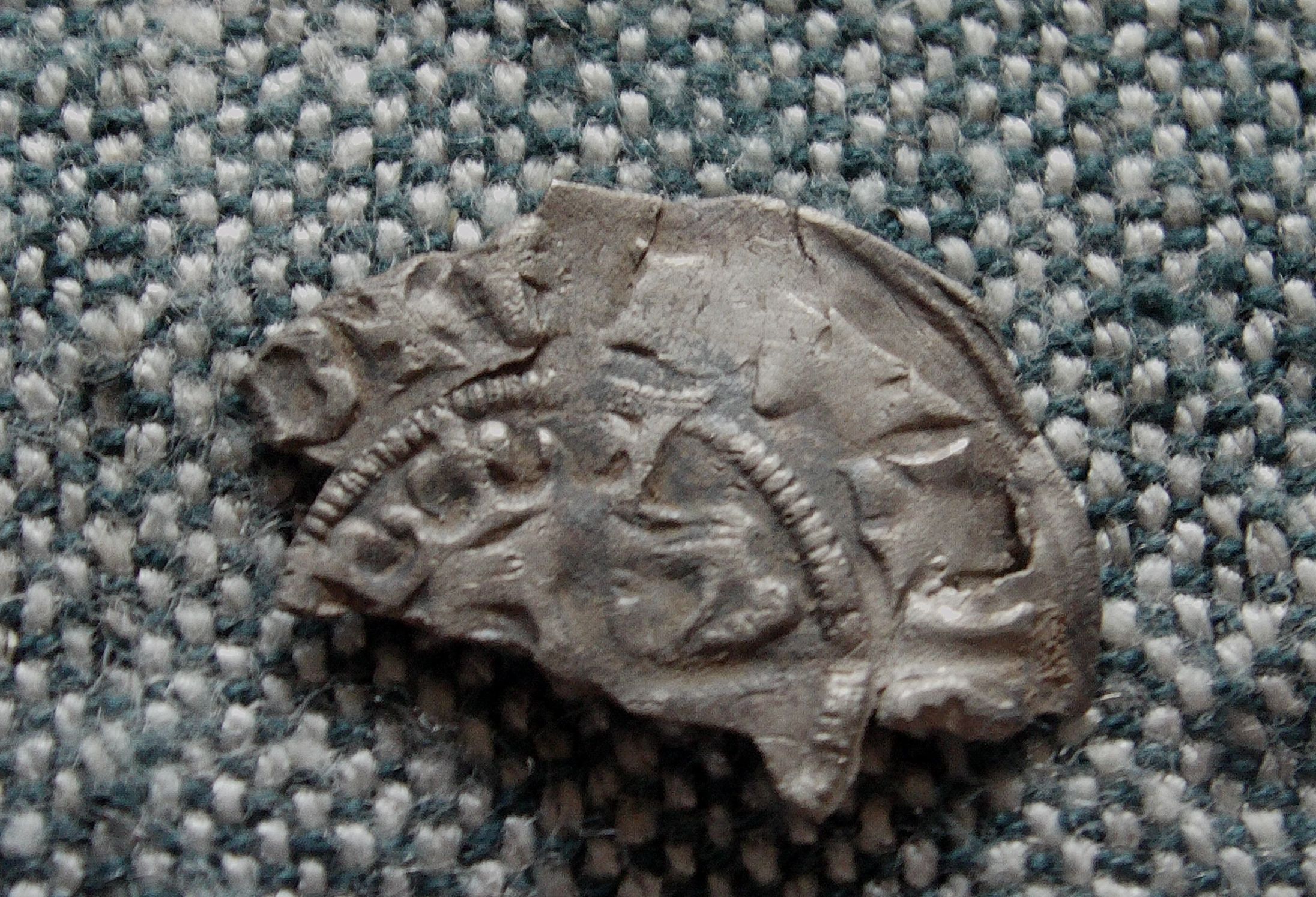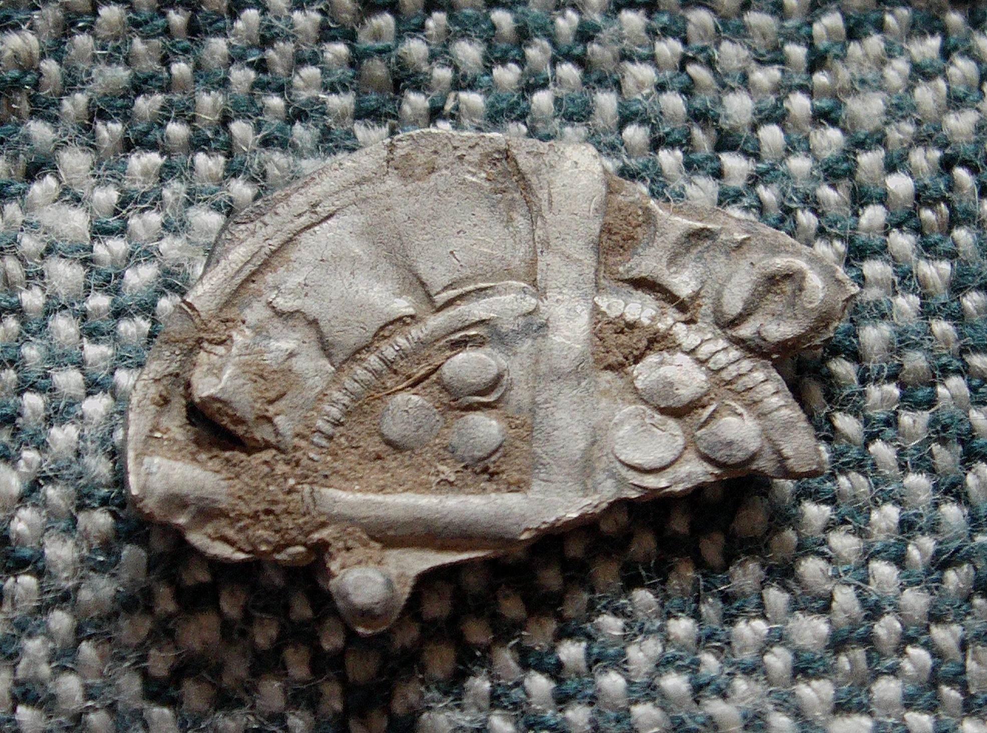 Another of our finds from the same general location. We knew it wasn't English but couldn't identify it and my Dad's label in the box reads "Dutch? 12th cent." At the time we dismissed it as worn and not very interesting. Now, a quick image search for [hammered silver coin sheaf arrows] reveals that in fact it's a coin of Ferdinand and Isabella of Spain, possibly a reale. That's the same Queen Isabella who sponsored Columbus, the Spanish sailor who ran across something or other, I forget what.