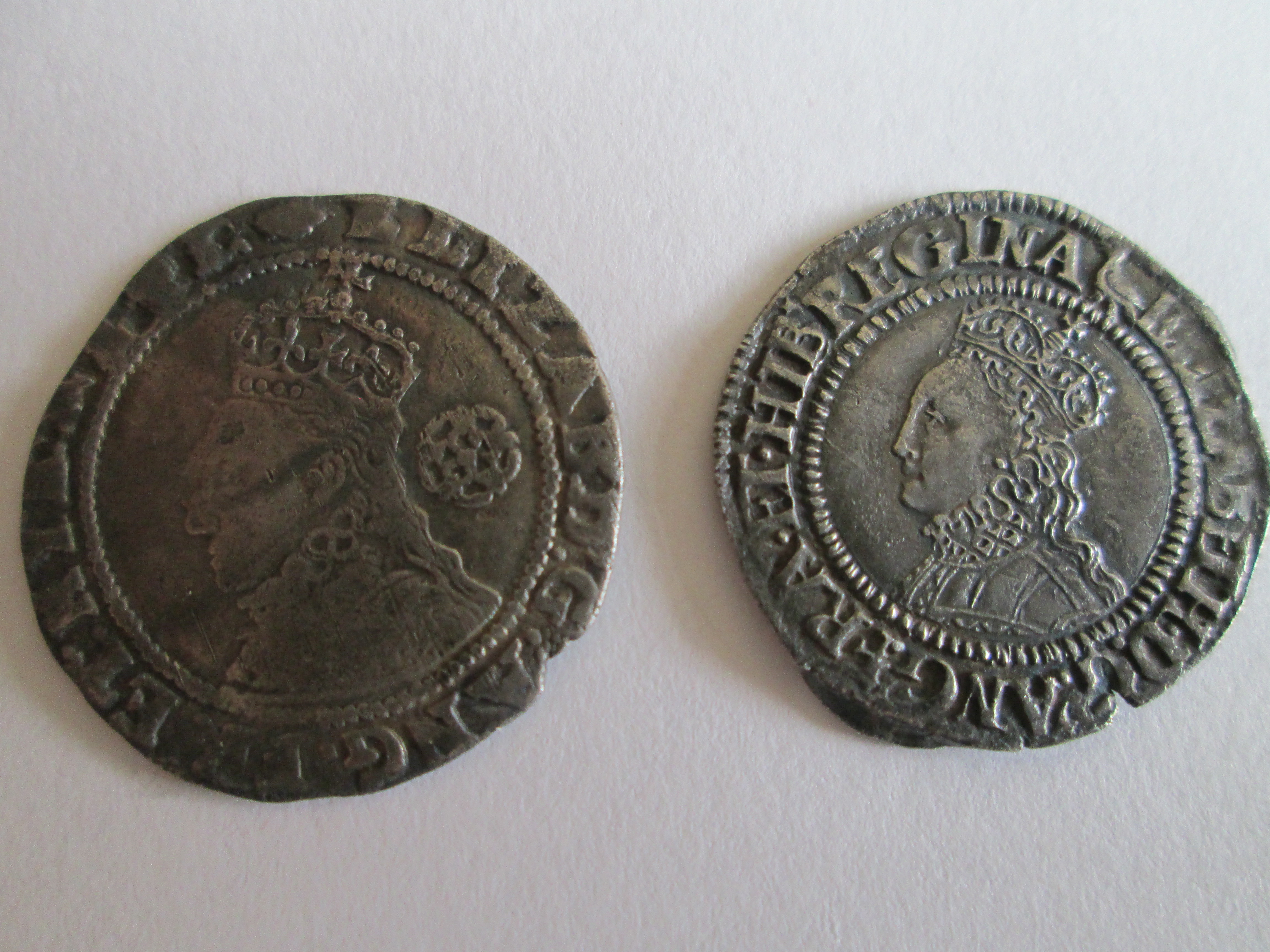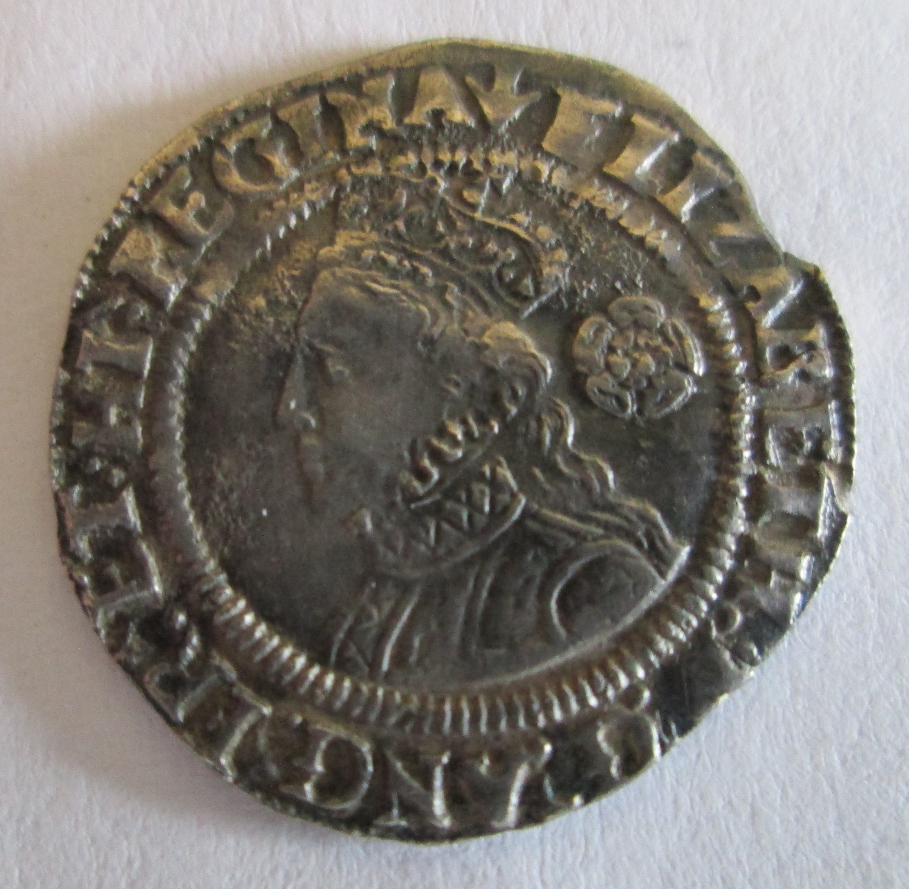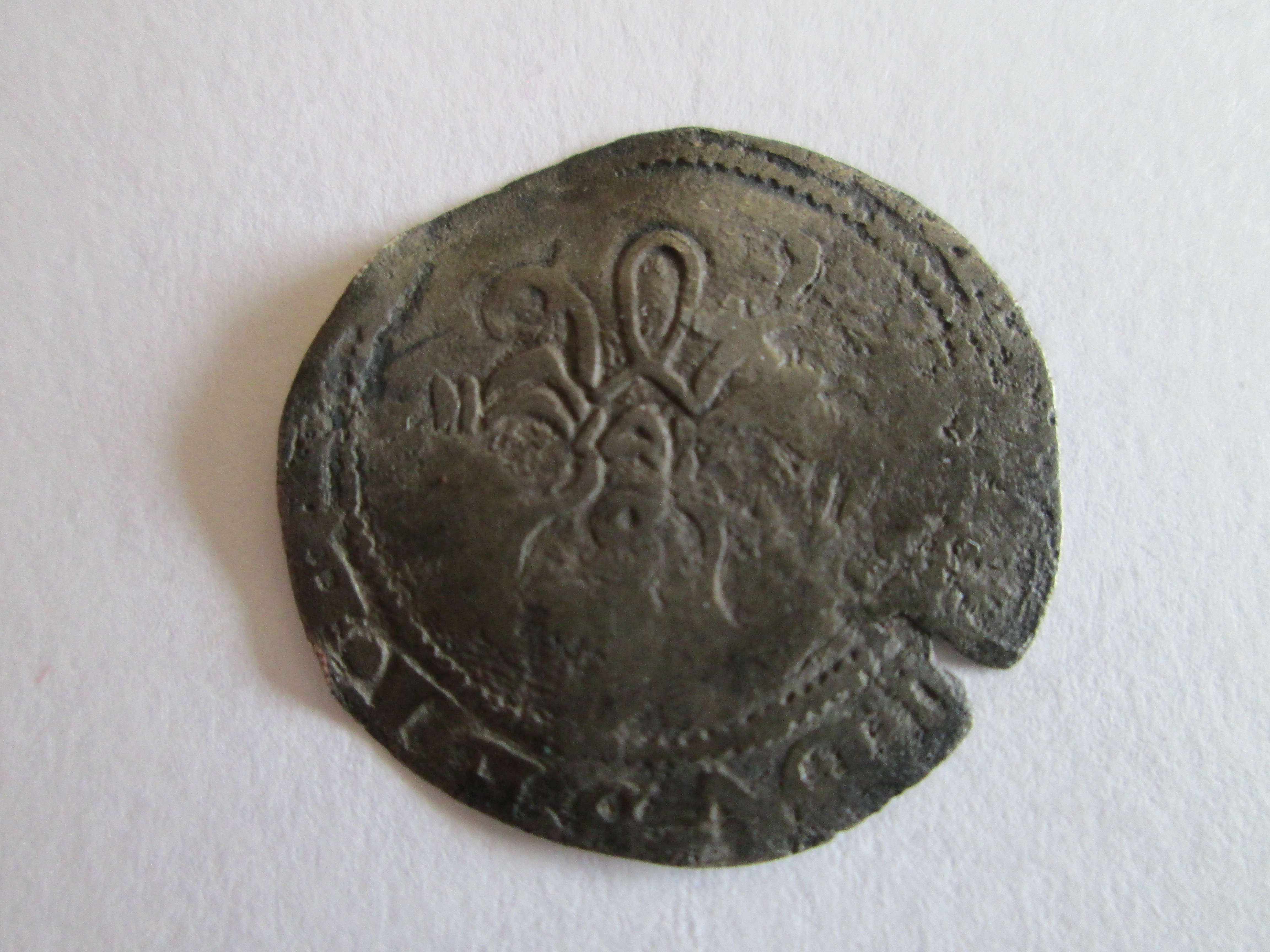 The real should have quartered coat of arms on the obverse. The bunched arrows are Isabella's device. As for the obverse of your coin, obviously it's worn, but has similarity to the half real: https://finds.org.uk/database/artefacts/record/id/616588