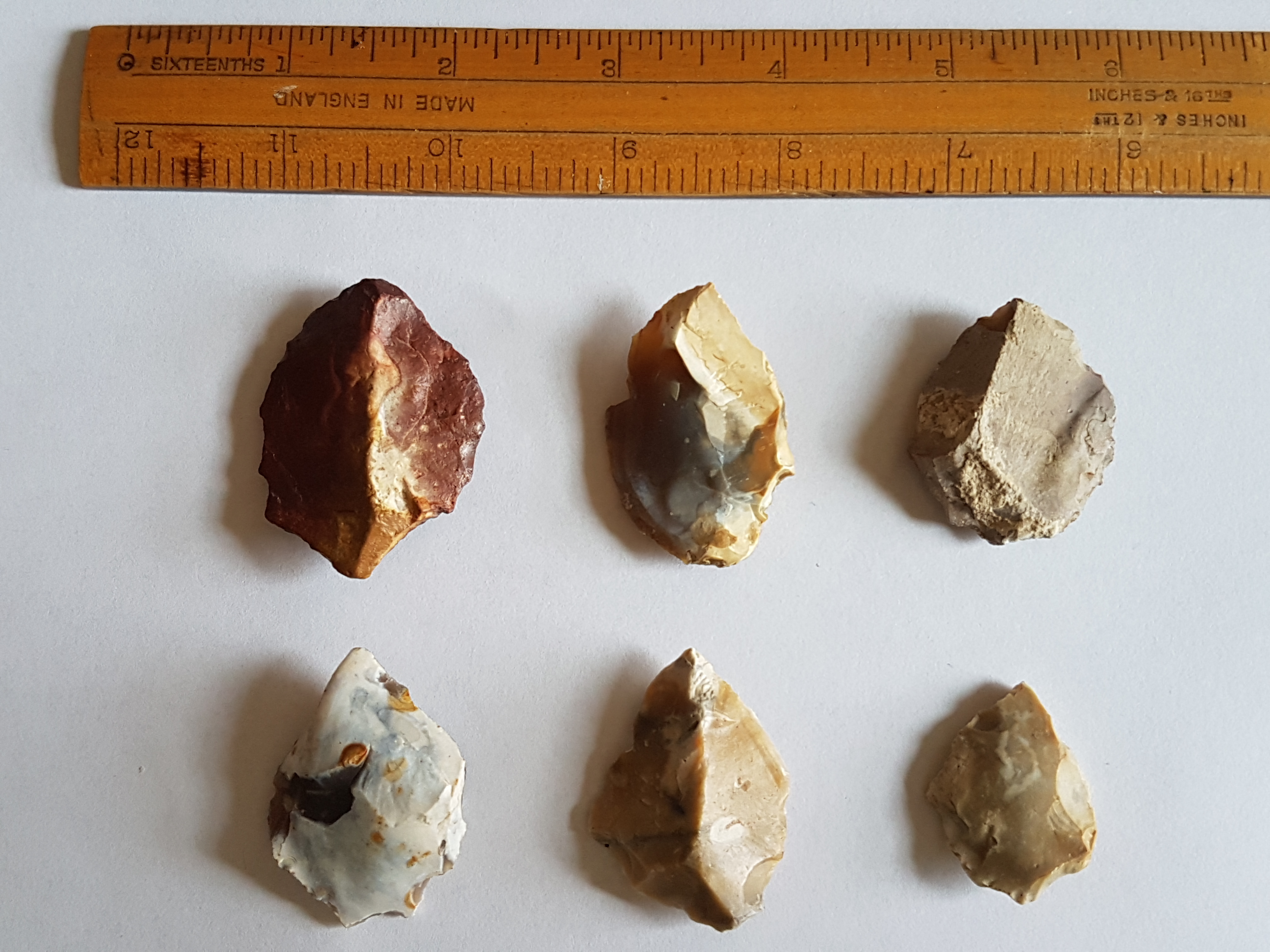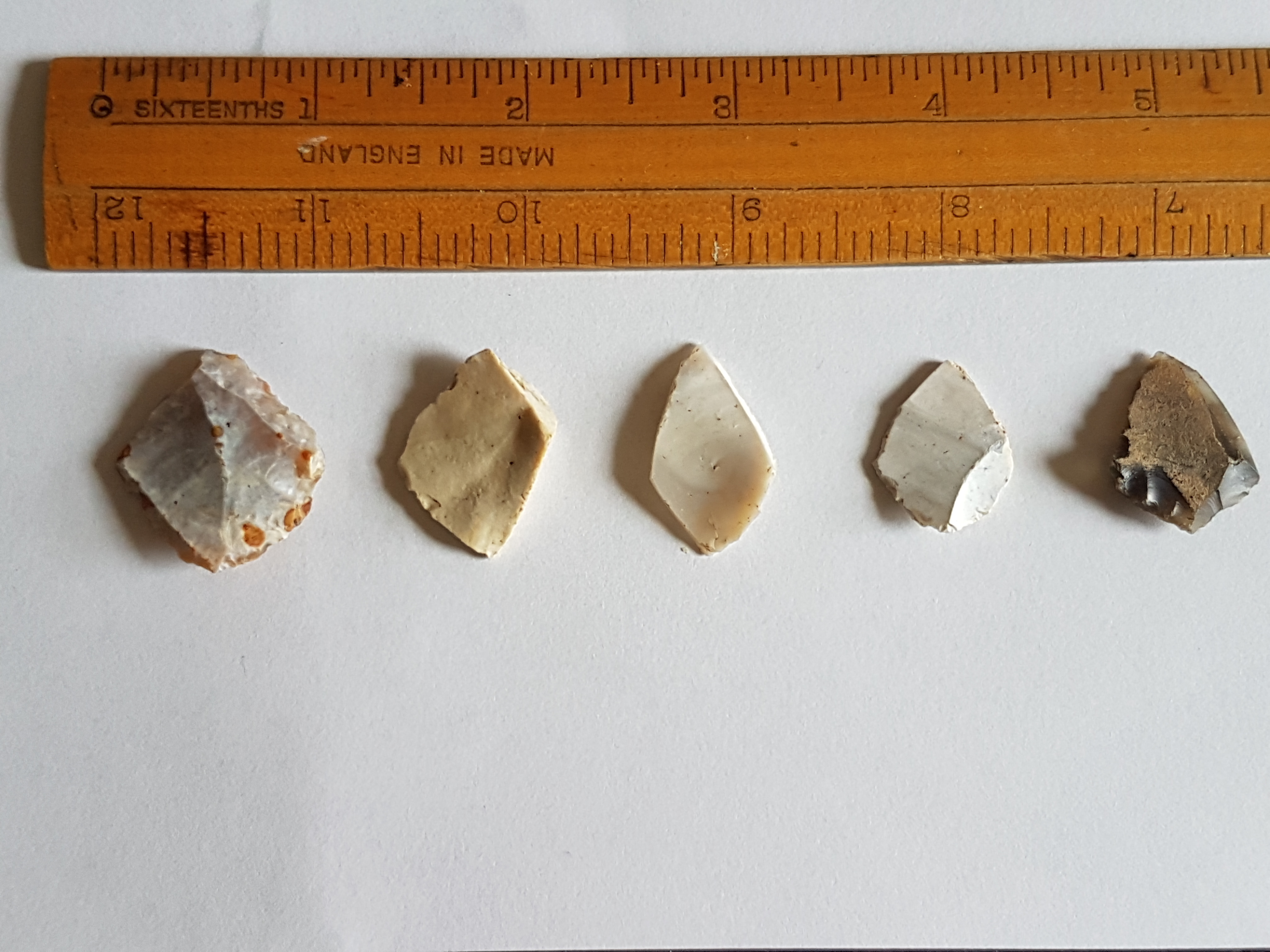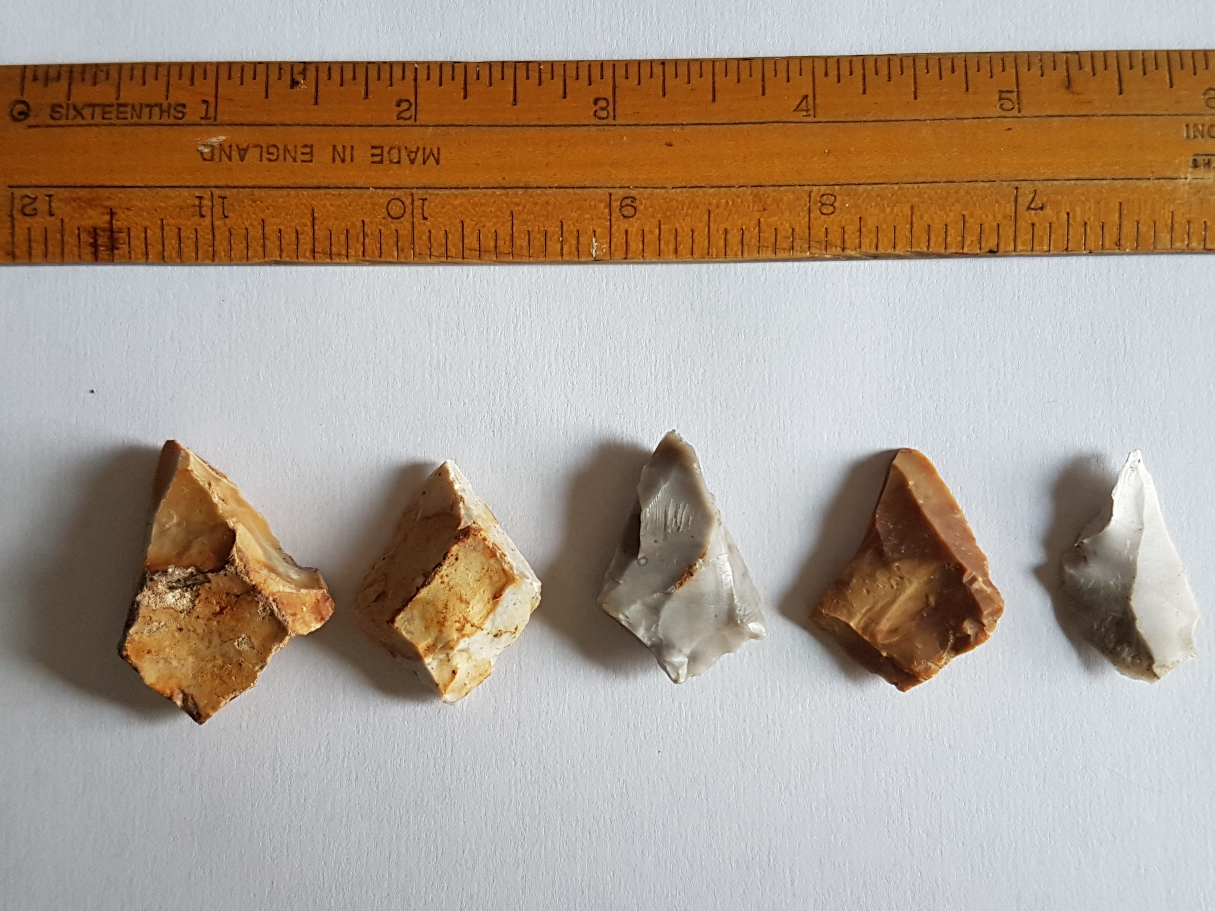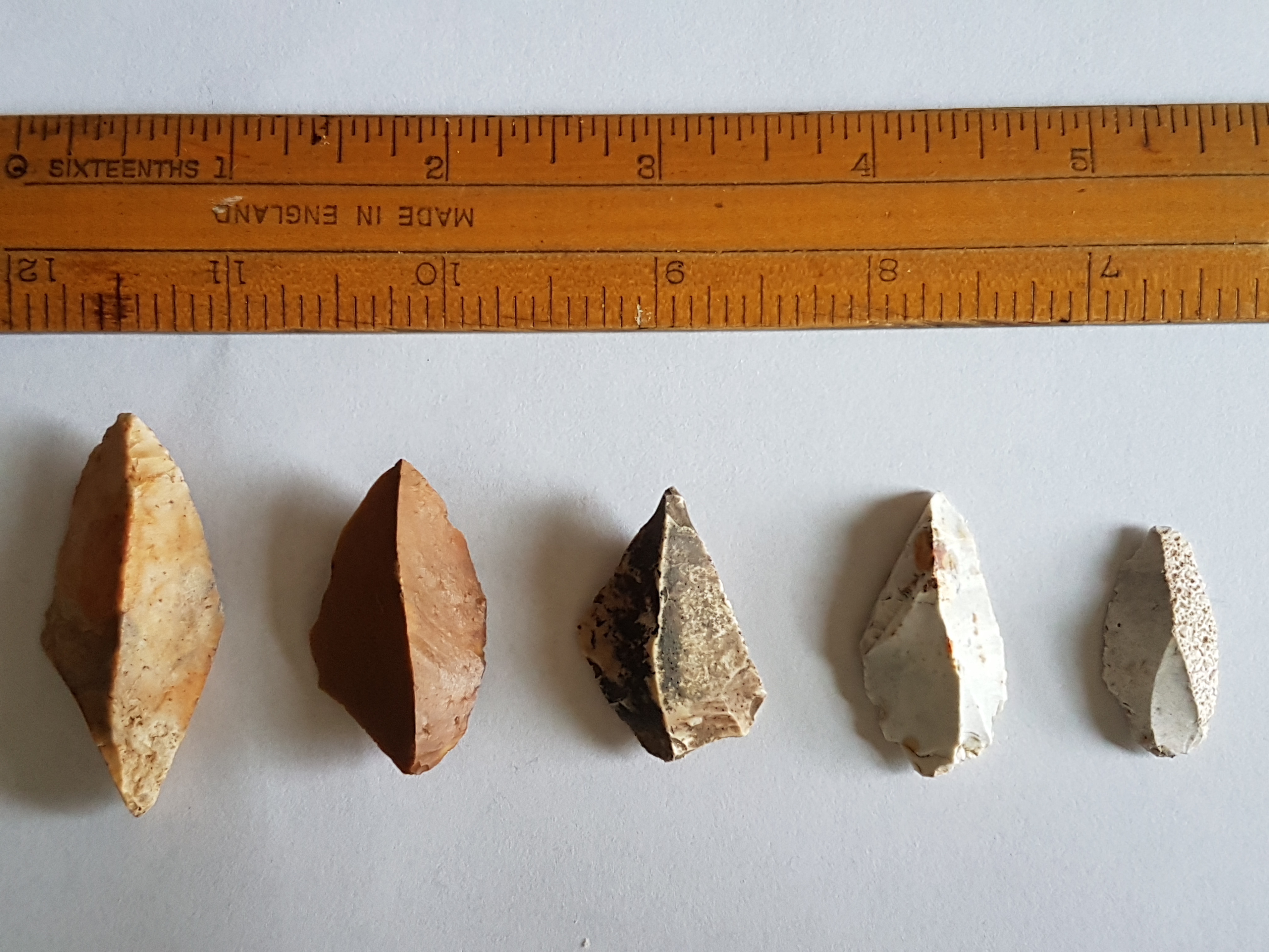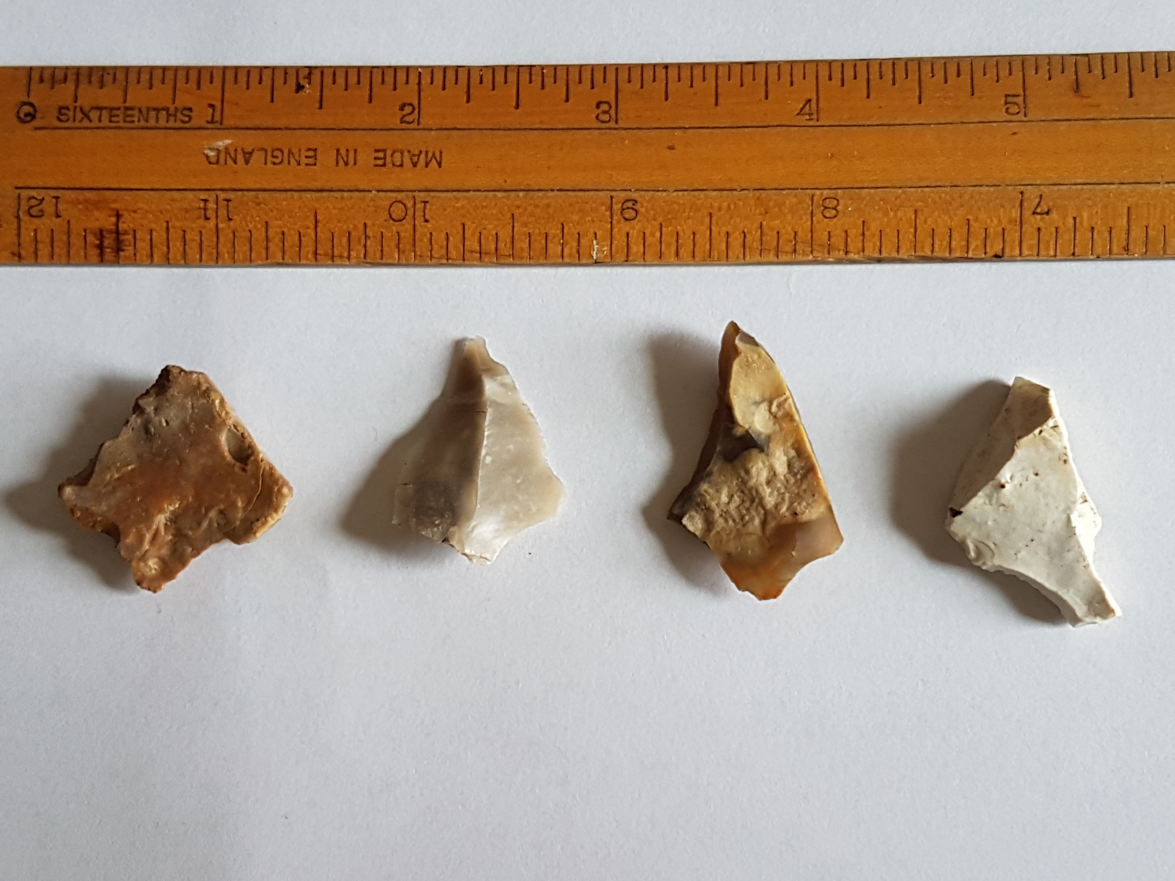 Not things I've actively collected but becoming a collection by default: most of the footpaths round here go over fields at some point and at ploughing time I usually pick up a few worked flints on certain walks. These four came from the same field. R to L - a blade, a tranchet arrowhead, an awl and something unidentified.
