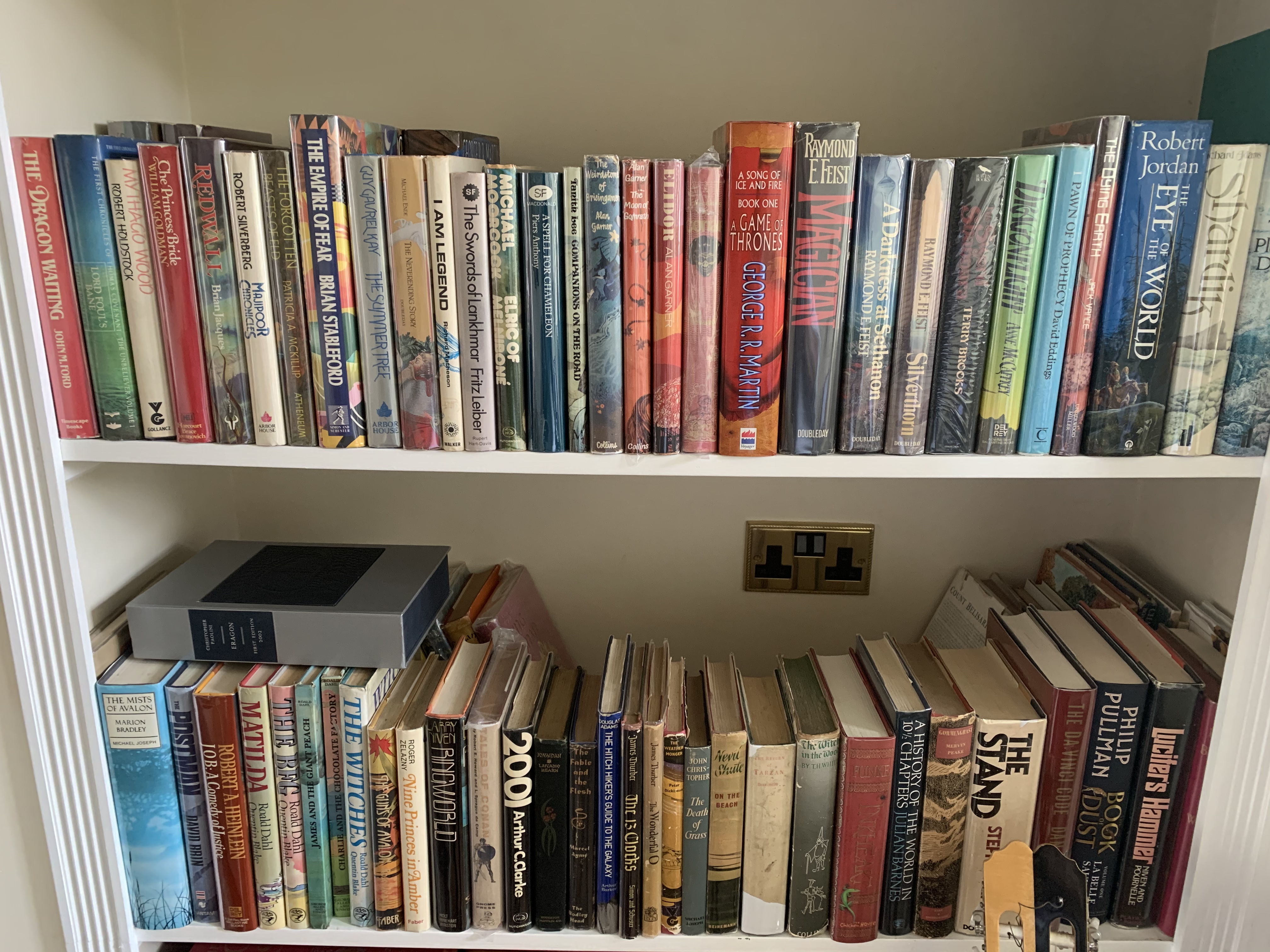 Sci-fi and fantasy - all the books I loved reading as a kid, and which I can now afford to buy the first editions of... in many cases the artwork from the 70s and 80s is fantastic- photo of a couple of shelves and covers: