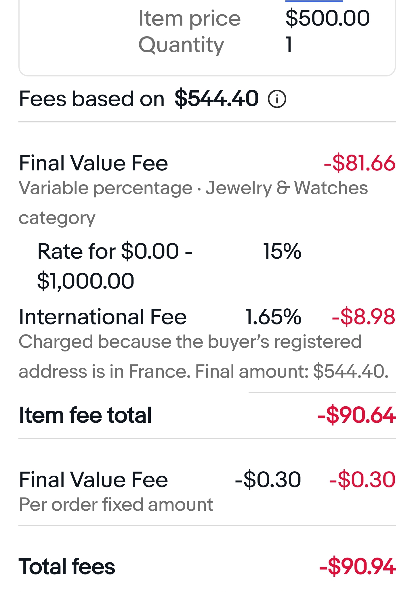 ·Note my painful example below. Not only do I pay 15% instead of 12.75% for normal items, but its also based on the total the buyer pays, INCLUDING TAXES. PLUS International fee of 1.65%, plus 0.30 final value fee(seriously?)