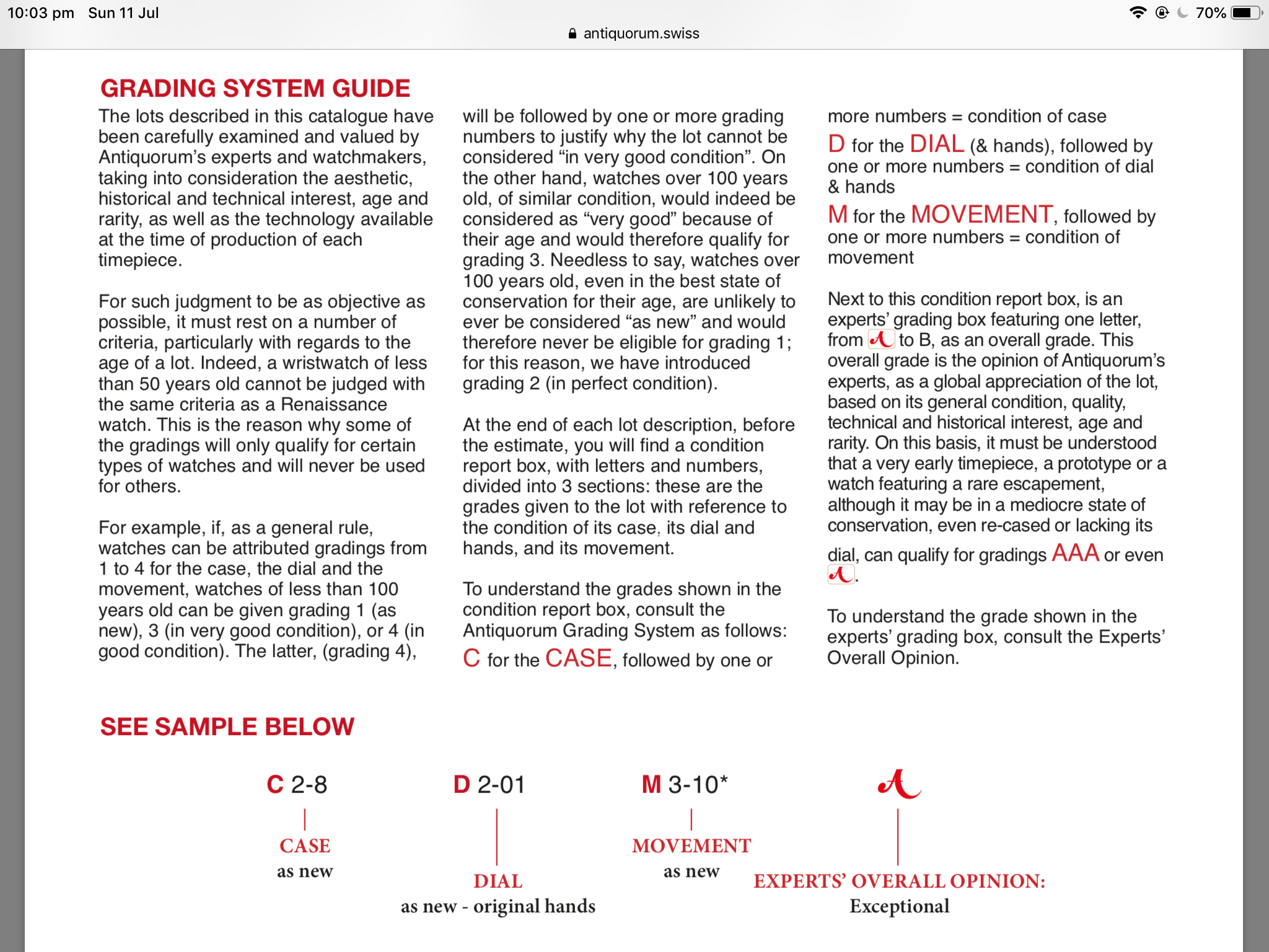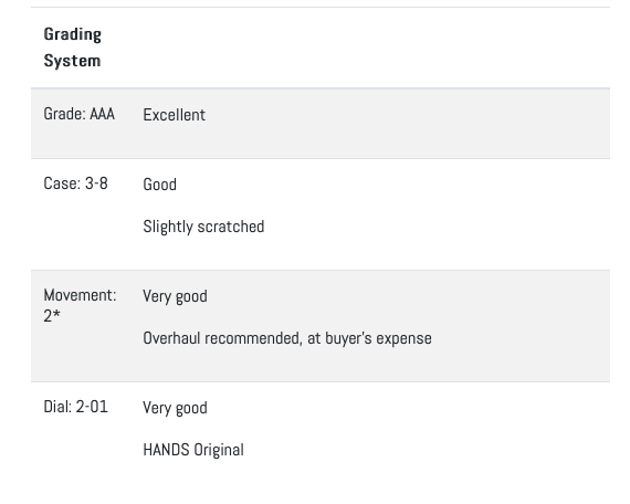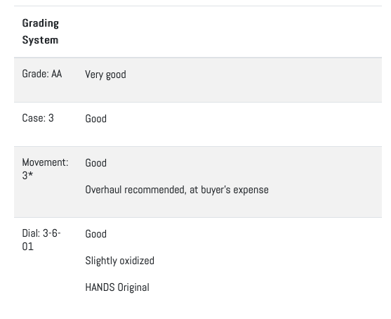 penalizes a watch for having little (if any) "global appreciation" or "historical interest". It would be more honest, and widely understandable, to have an "overall" condition grade, and then add footnotes to describe desirability and rarity, etc.