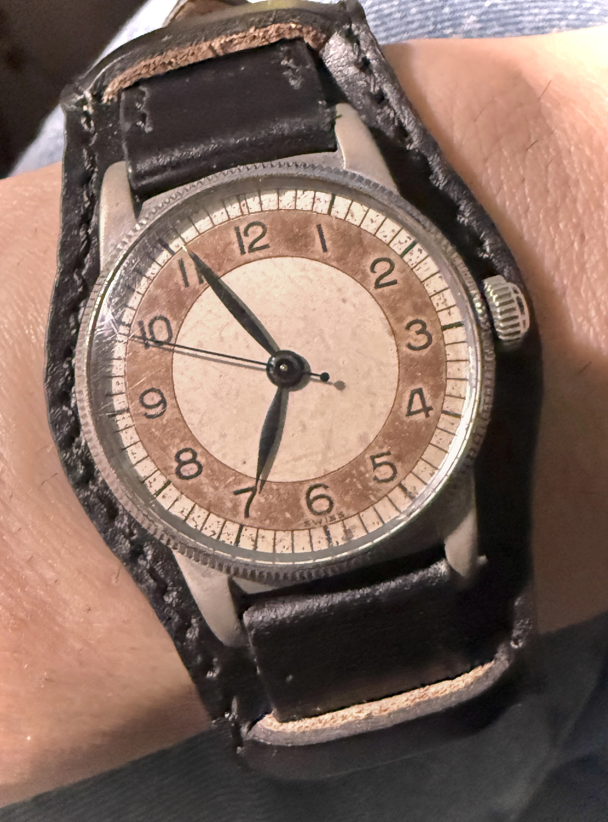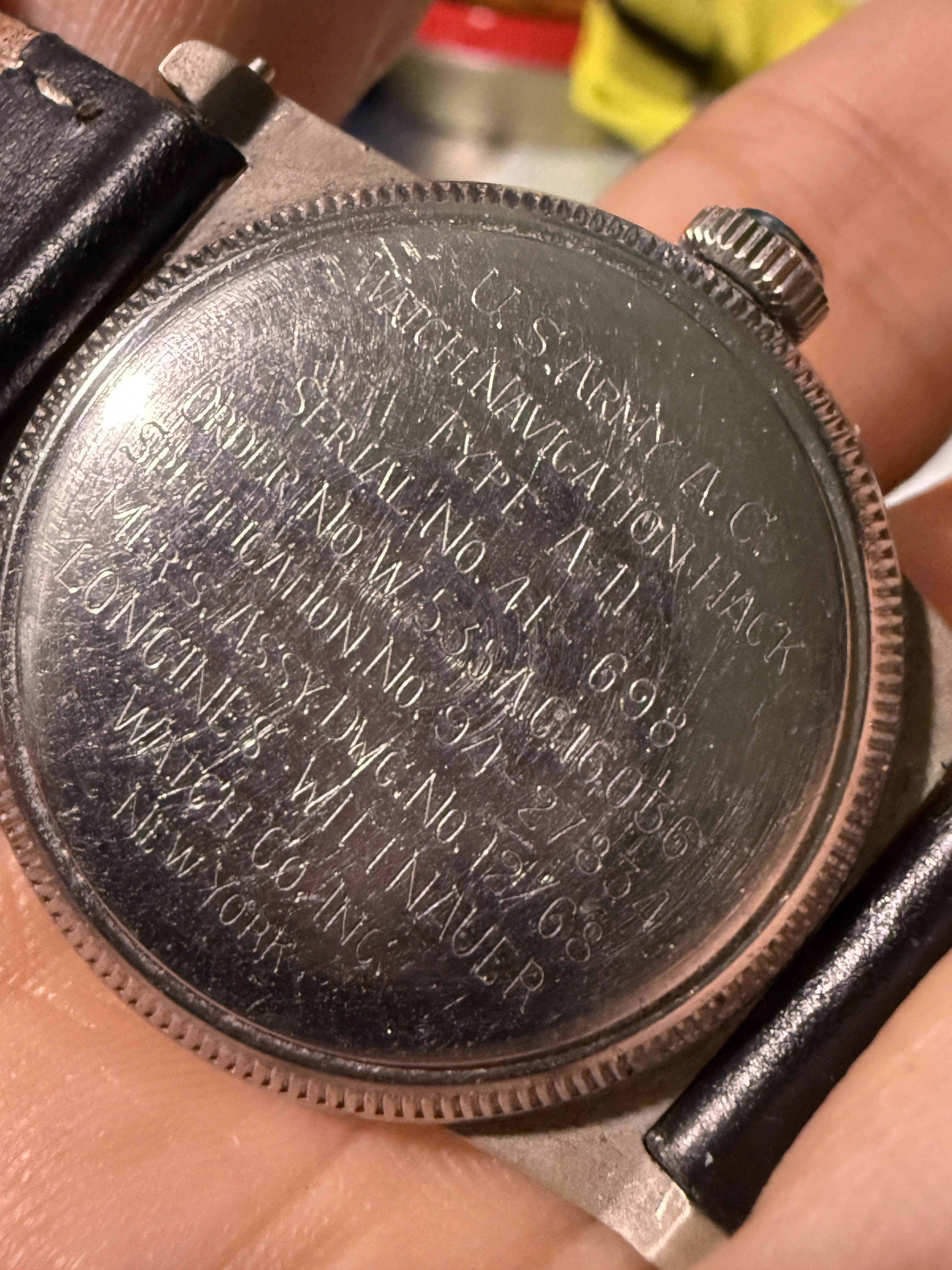 Some interesting details the second version of the Longines A-11 . It is more rare than the 1940 A-11 with the Weems bezel. Bellow is 100% correct USAAC issued military specifications flown watch.