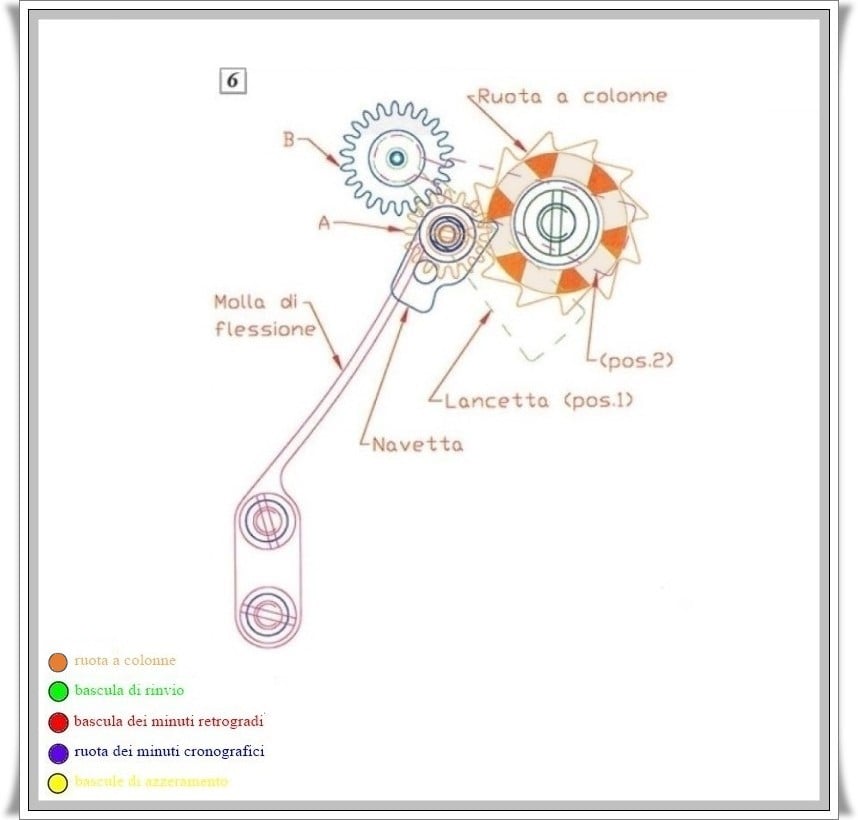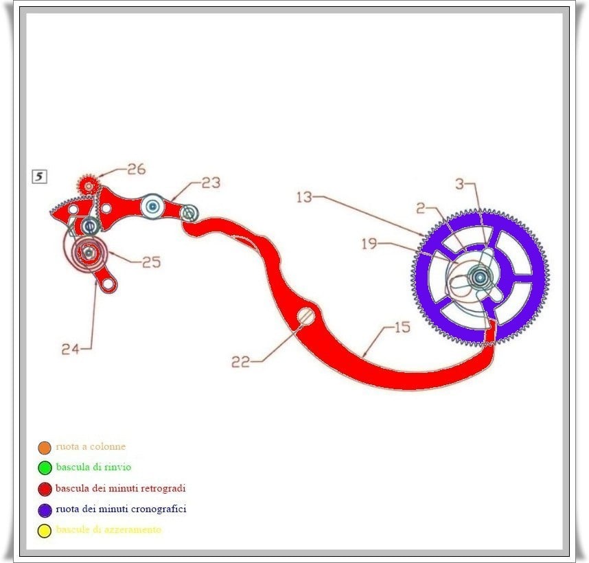 First of all, the minute wheel is not driven, as in classic chronographs, by a finger placed under the central chronograph wheel and a return wheel driven by the aforementioned tooth, but by a pinion which constantly meshes with the return wheel, which, equipped with a pinion, is connected to the chronograph minute wheel.