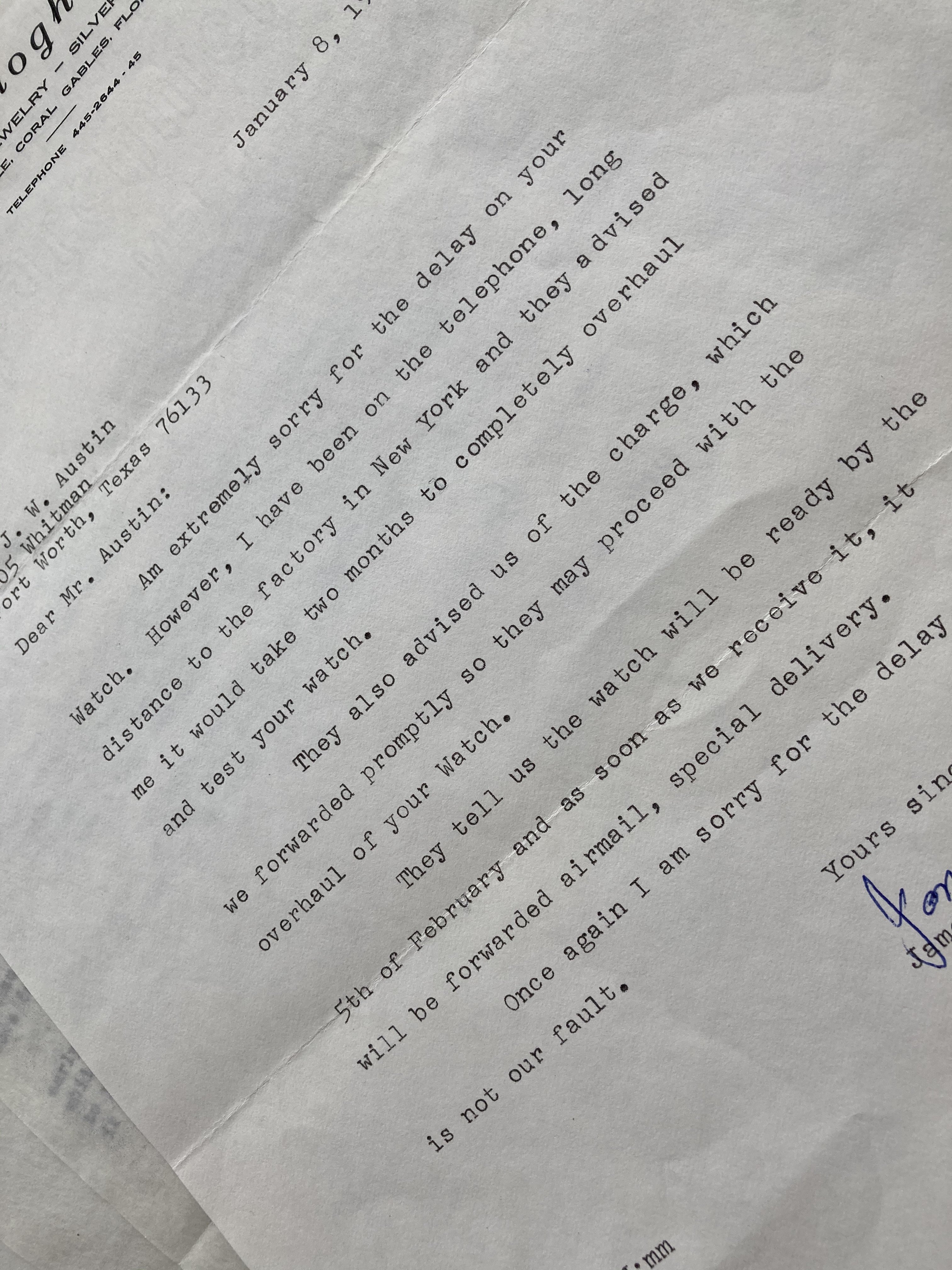 It looks like the Navy LCDR. W. Austin had some troubles with his watch and had to return it to Omega in NYC for a warranty repair. I've got his letter to Omega as well as the letter he's got back confirming reception of his watch for repair. Nine months later, Mr. Austin was writing again to Omega asking if they're building a new watch for him 😁 a couple of weeks later, he got another letter in response confirming that his watch was repaired and on its way back to America, from Switzerland.