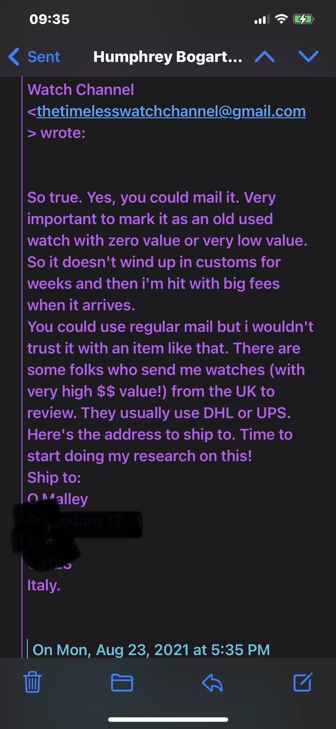 It’s been stated a dozen times but worth repeating: the entire narrative about avoiding cost to return the watch is imaginary, as there are no duties owed to mail a watch that is not being purchased/sold.
