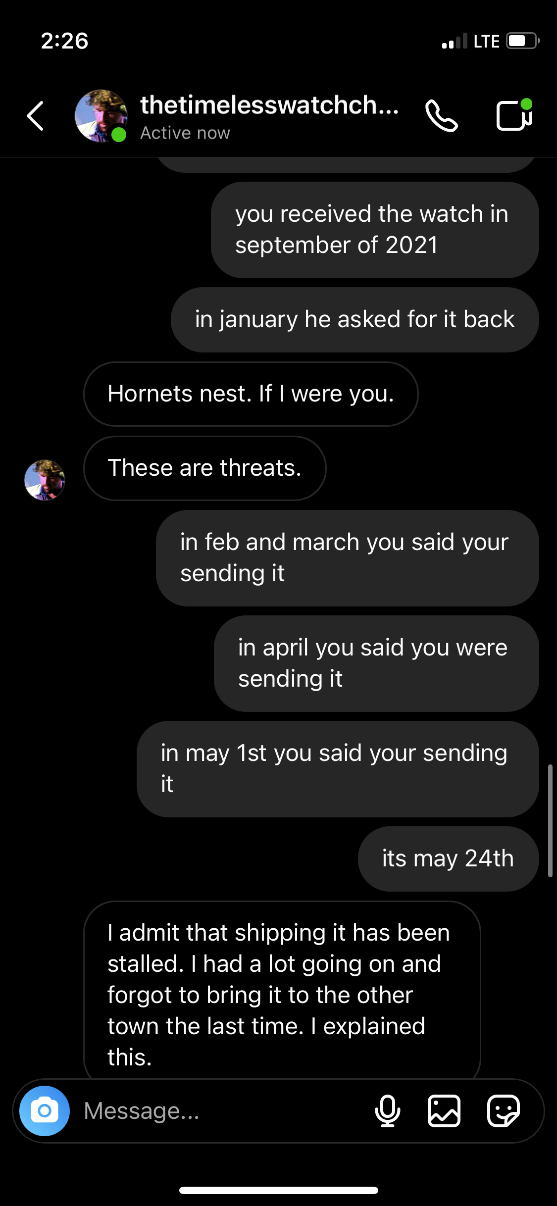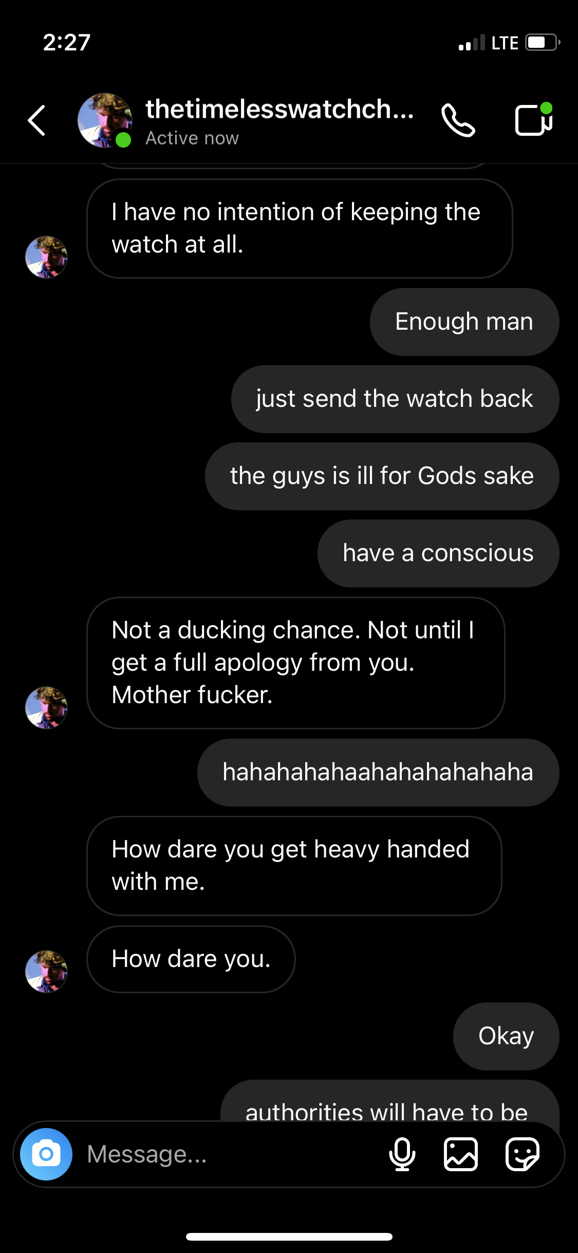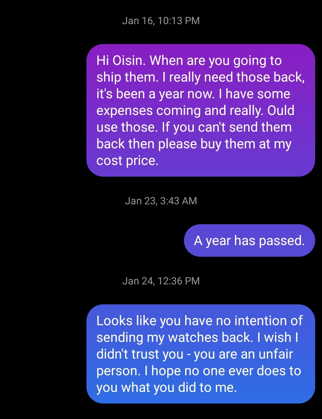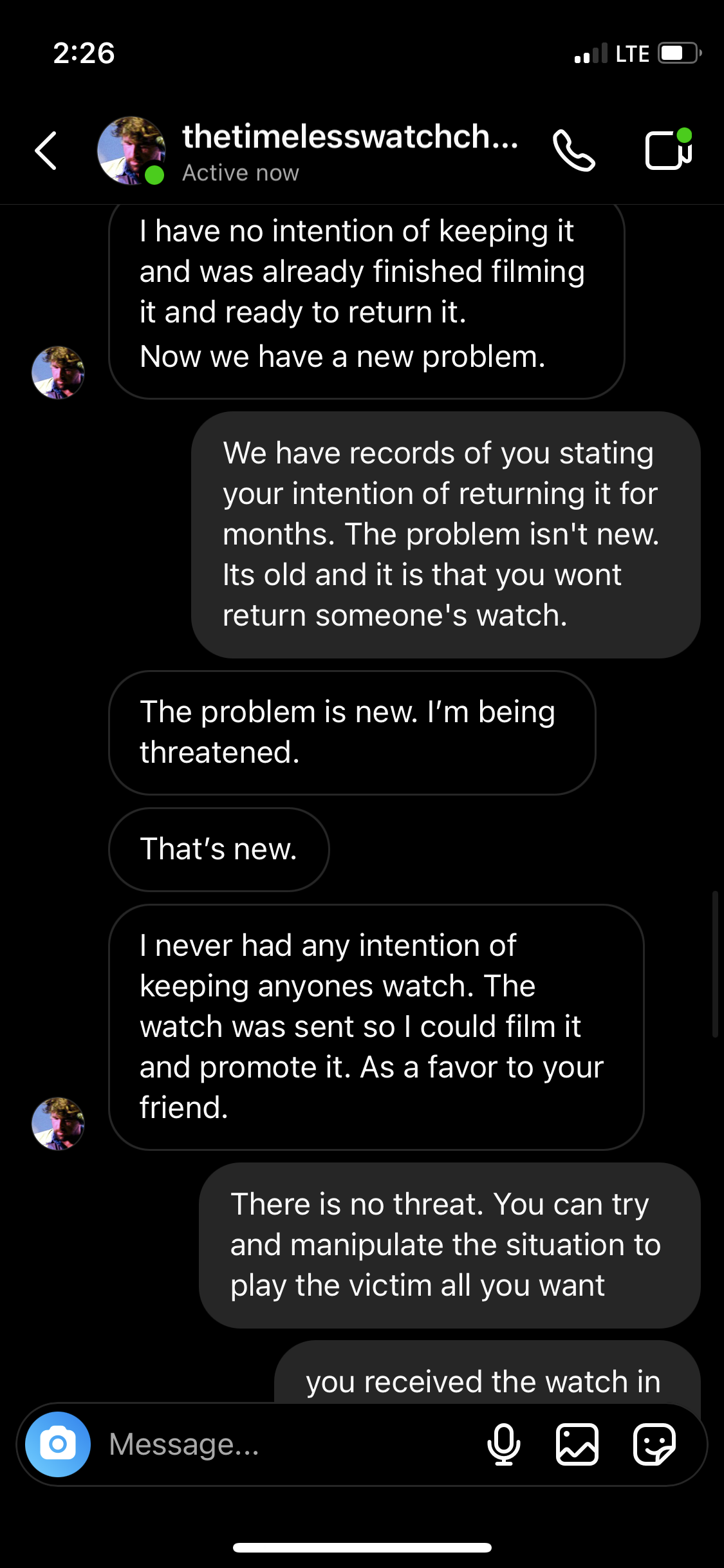 I messaged him on IG asking when he was planning on returning the watch. The response I got was "Who are you and why are you bothering me?"