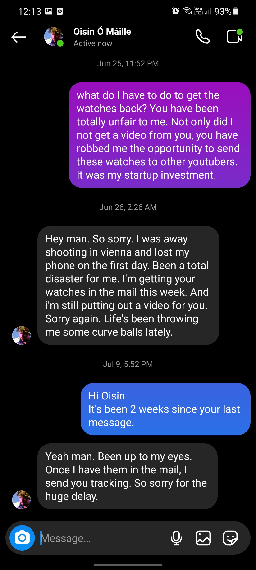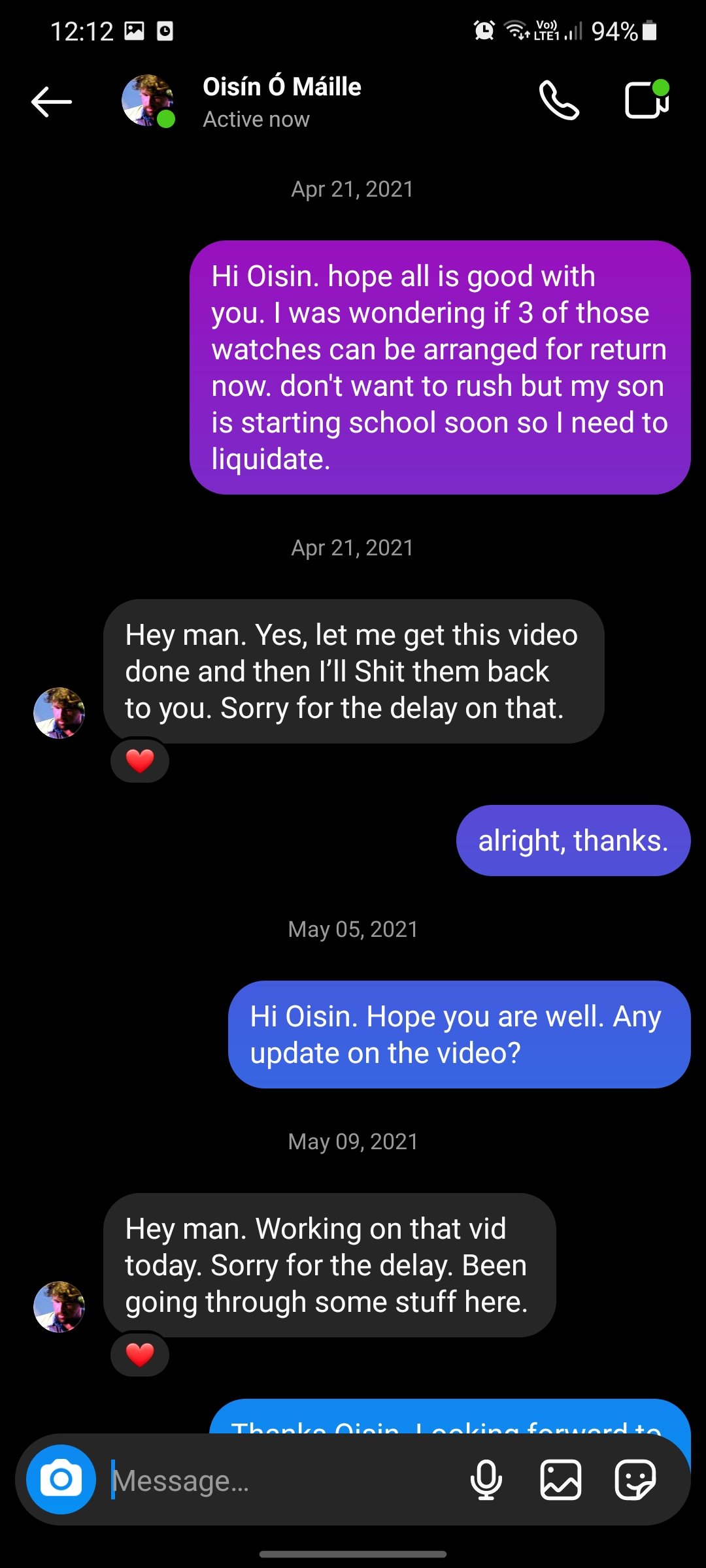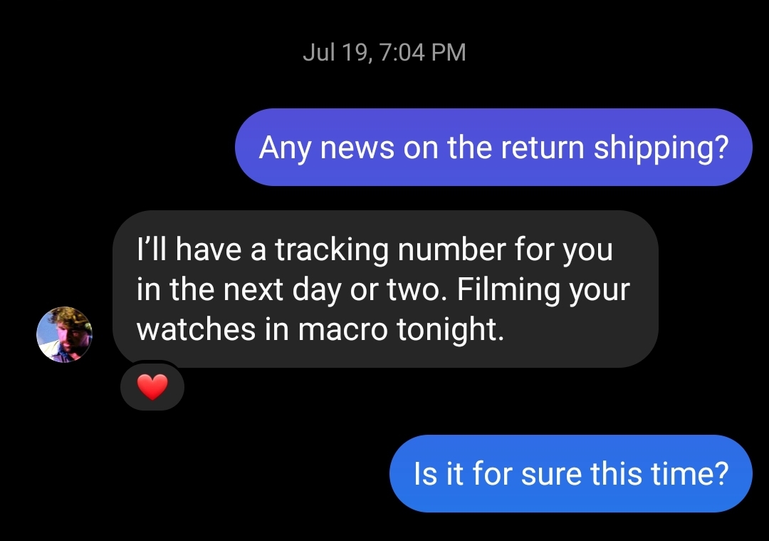 I messaged him on IG asking when he was planning on returning the watch. The response I got was "Who are you and why are you bothering me?"