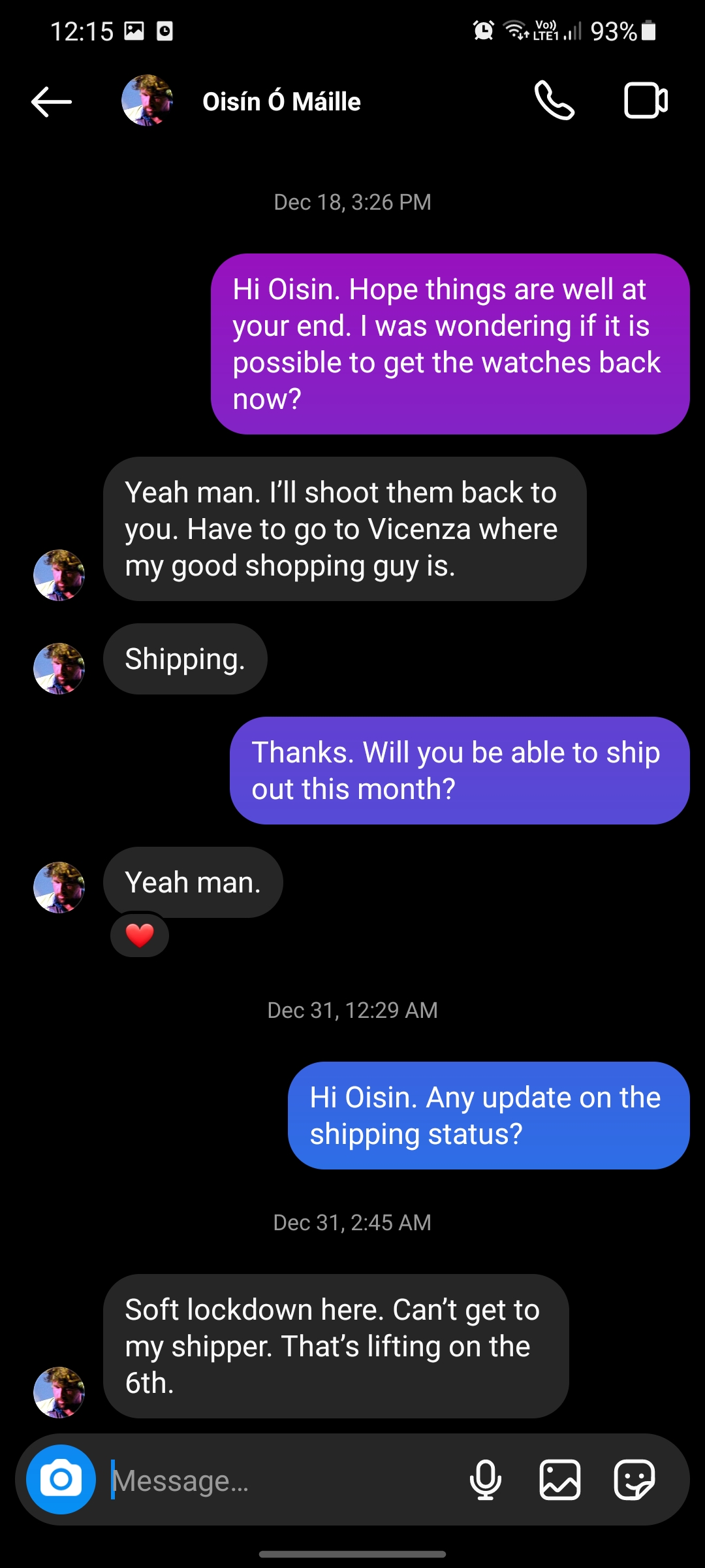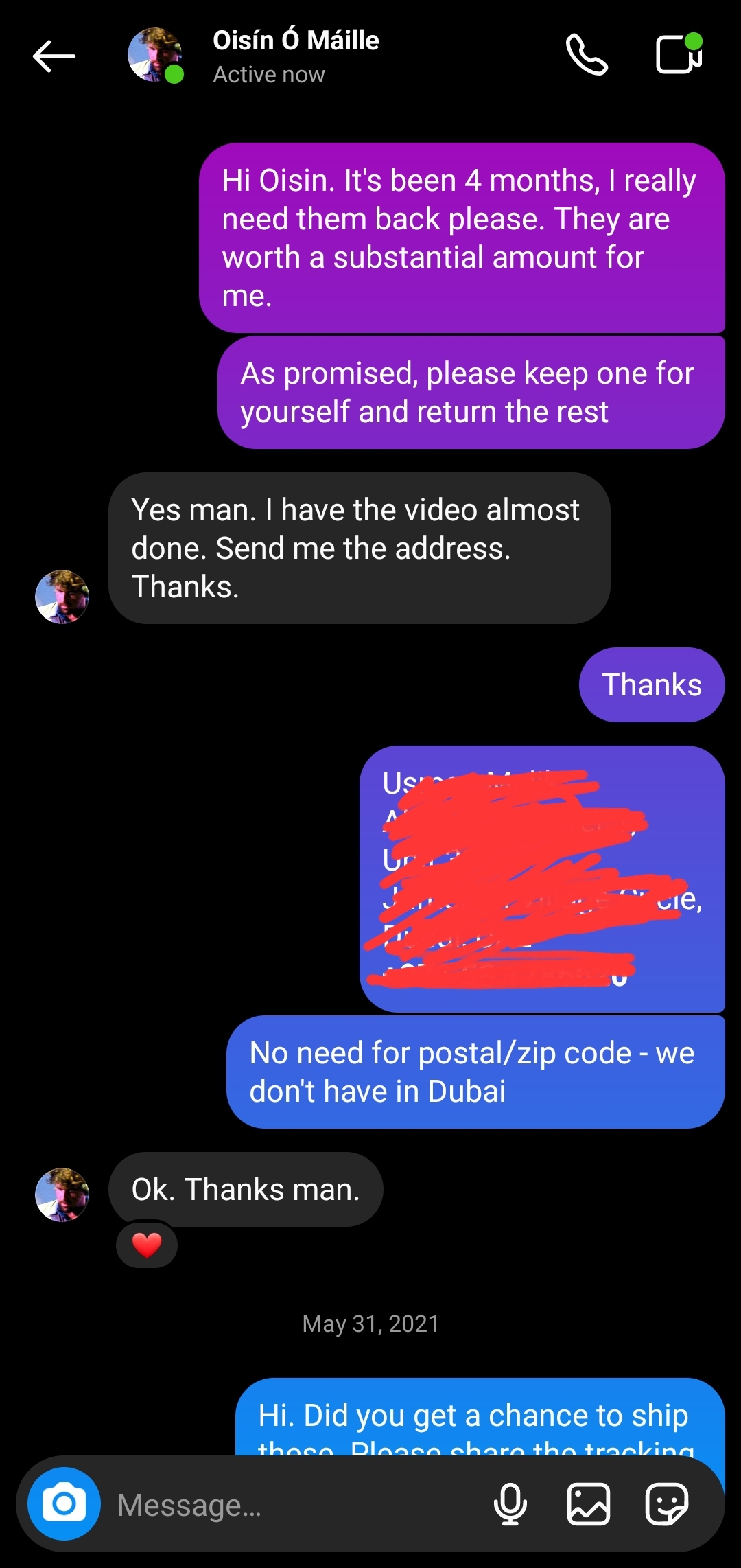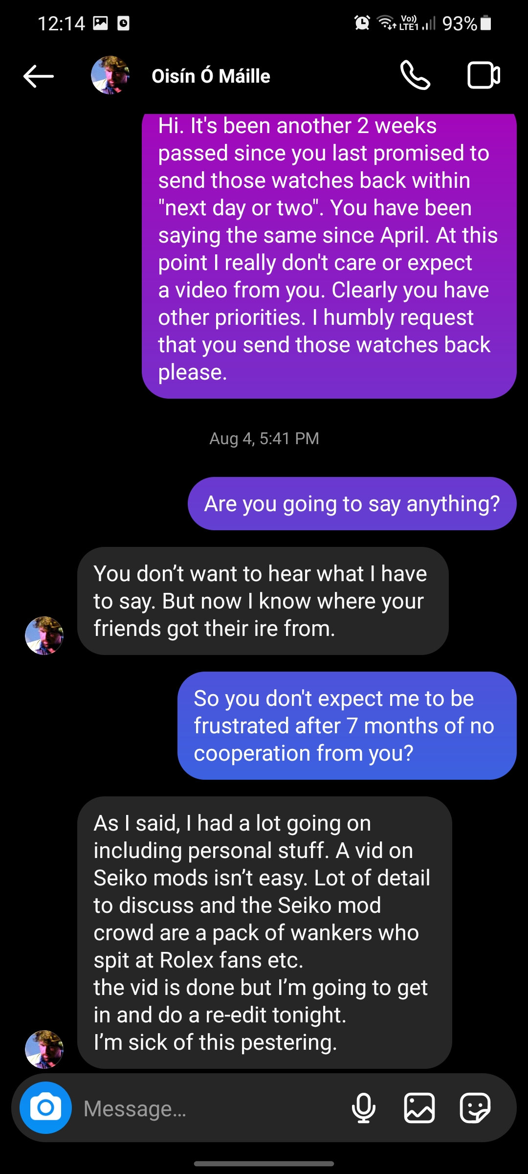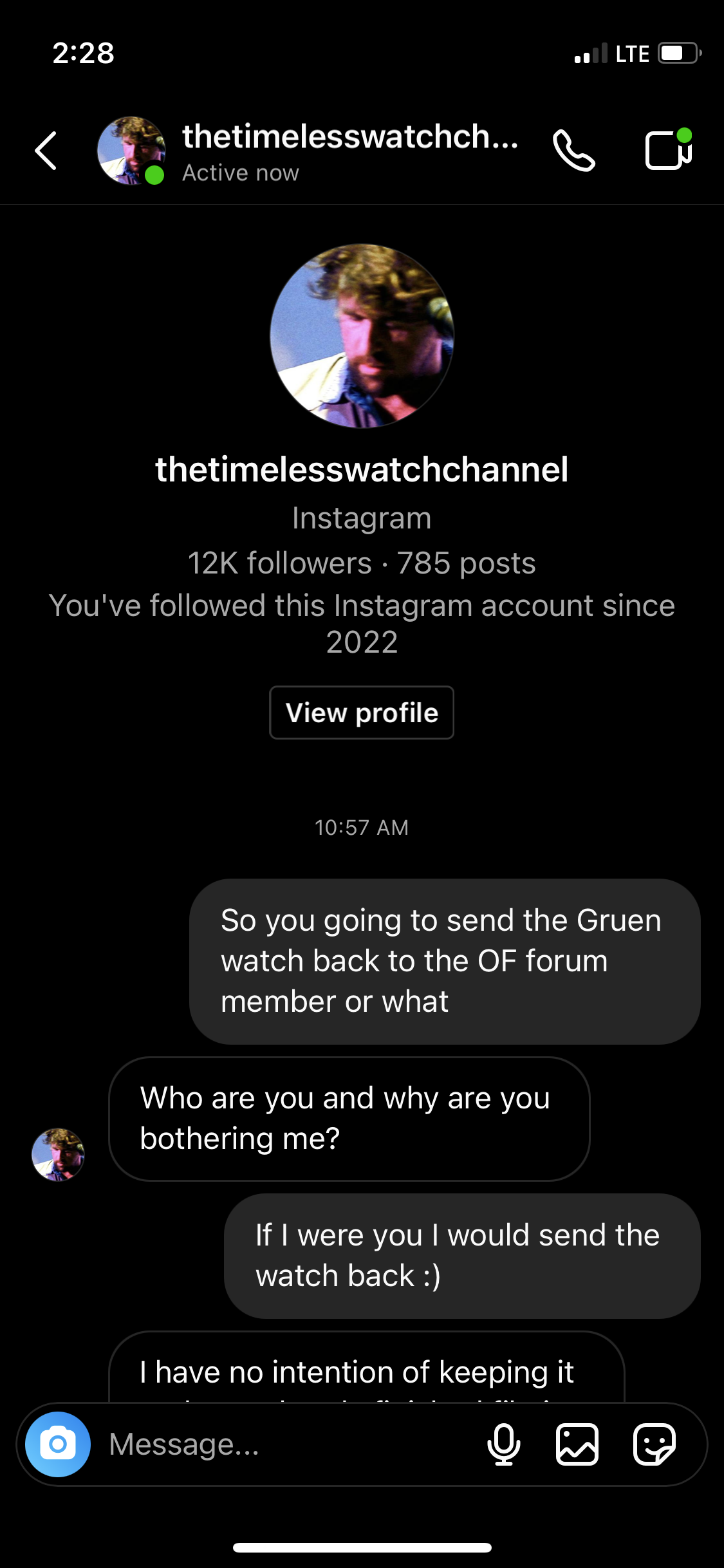 I messaged him on IG asking when he was planning on returning the watch. The response I got was "Who are you and why are you bothering me?"