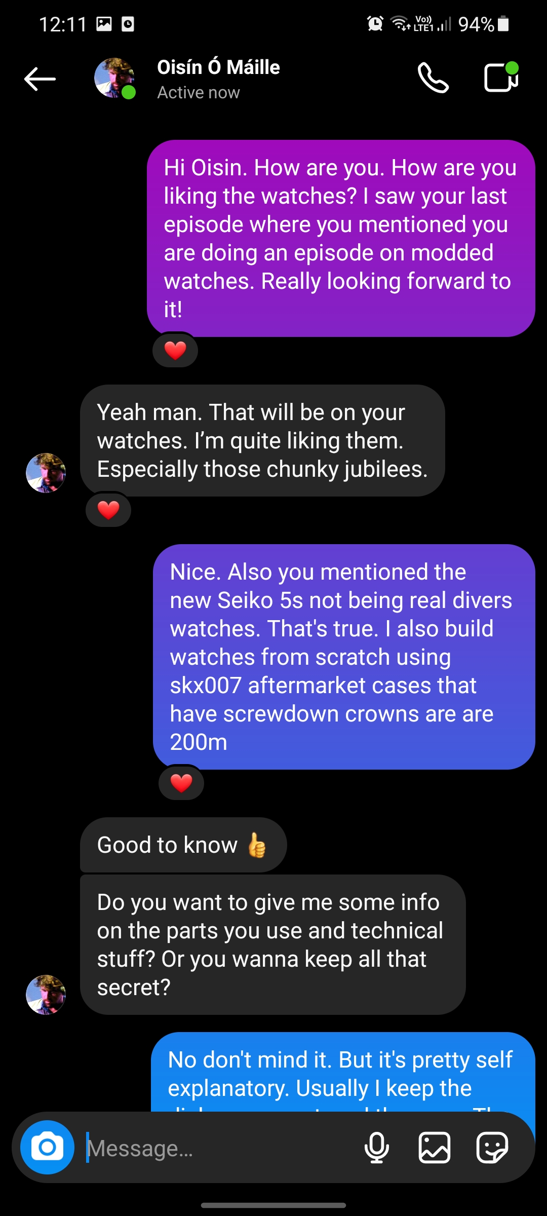 I just asked him to contact me as I'm having an issue with Oisin O'Malley from The Timeless Watch Channel after lending him a watch.. I did not say what this issue was....... this is his repley