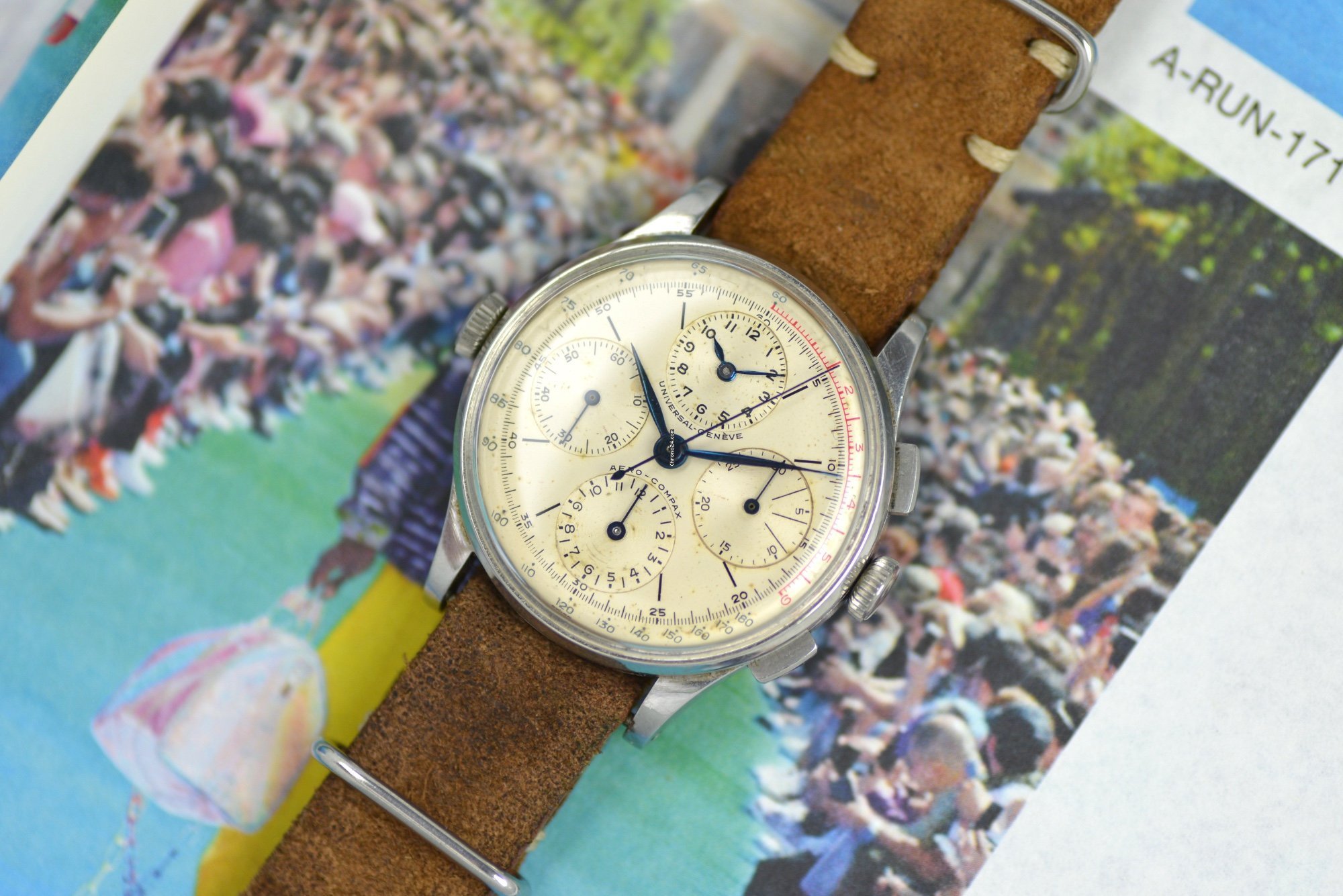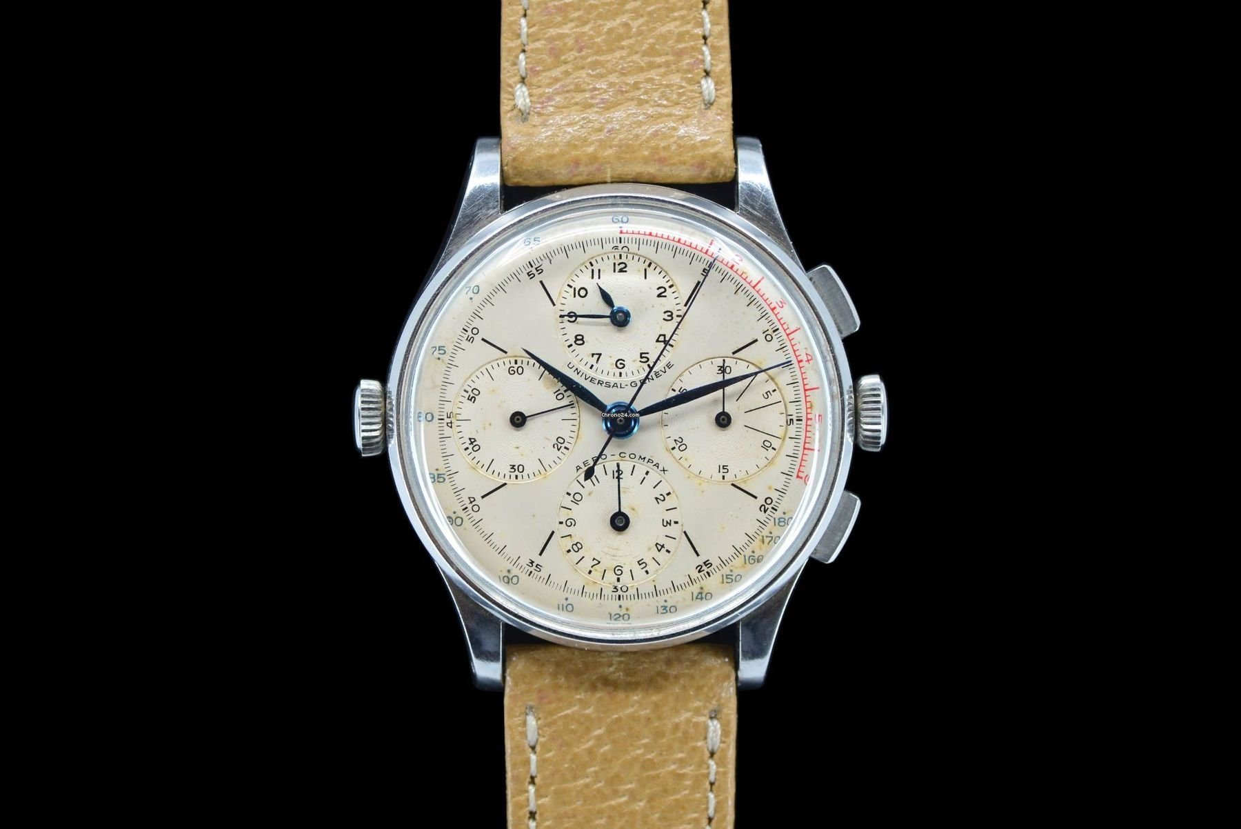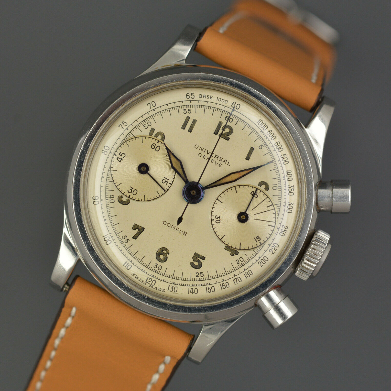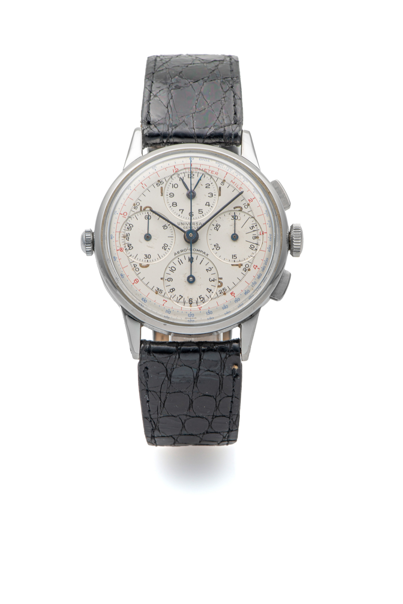 Dial: Brushed silvered, Arabic numerals, black outer 1/5th second divisions with Arabic numeral 5 minute markers, outer blue 60-1000 scale, textured subsidiary dials at 12, 3, 6 and 9 for time registration, seconds, 12 hour and 30 minute recording, blued steel dagger hands with luminous inserts, centre chronograph hand