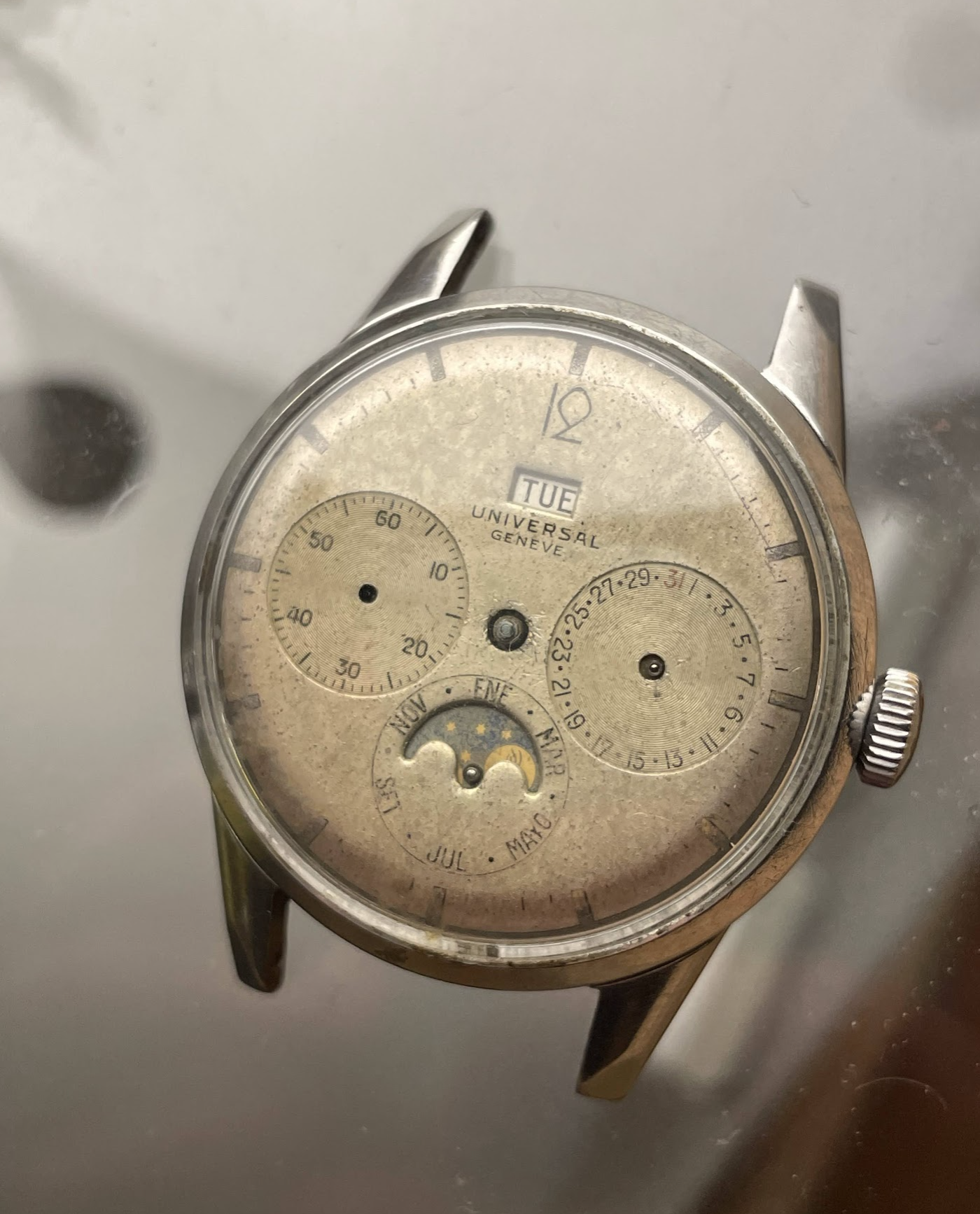 Posts 701 Likes 2,445 vintage hab ·Oct 23, 2022 T TheRealMe I didn’t ask the auction house about the discrepancy, but noticed that too. I wonder if someone just liked that dial style, and it was only available in English? The auction house is confident the case was made for the this movement and dial. I would guess that the day wheel was changed out at one point in the watch’s life.