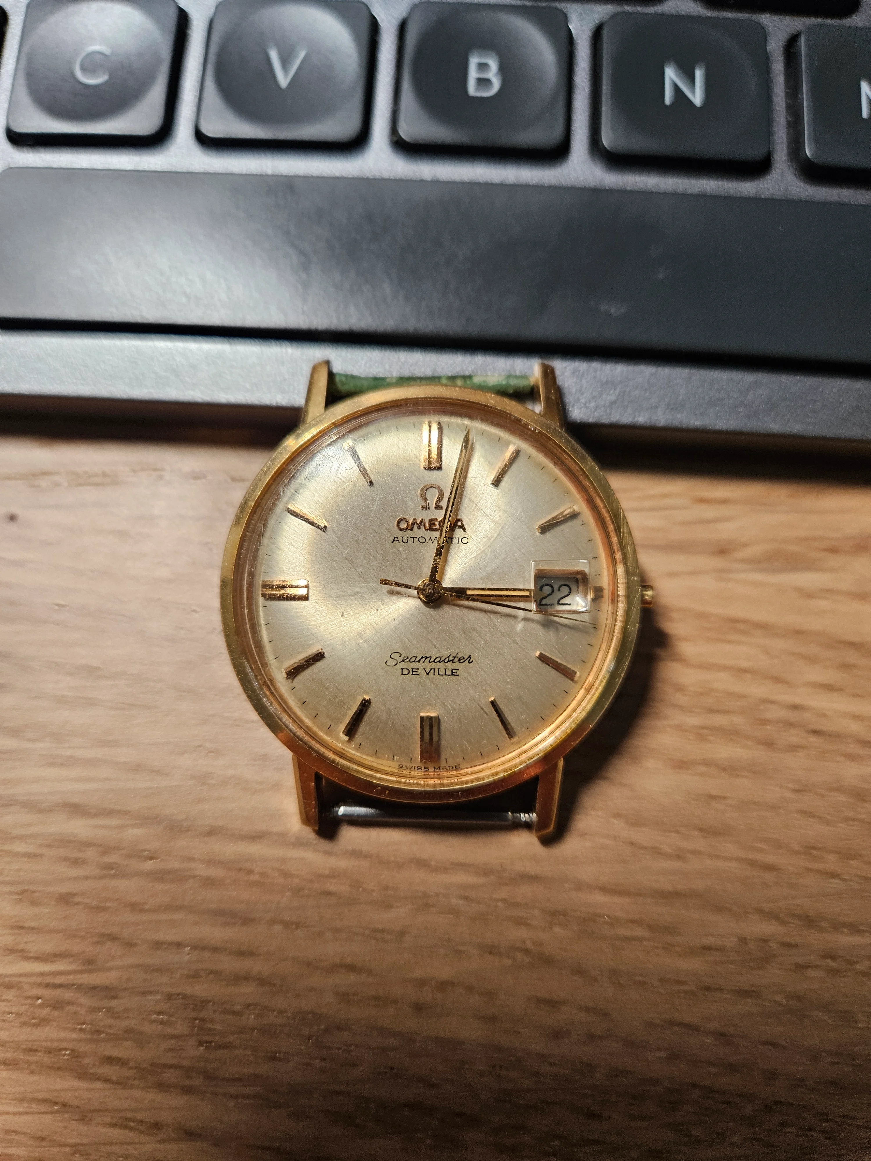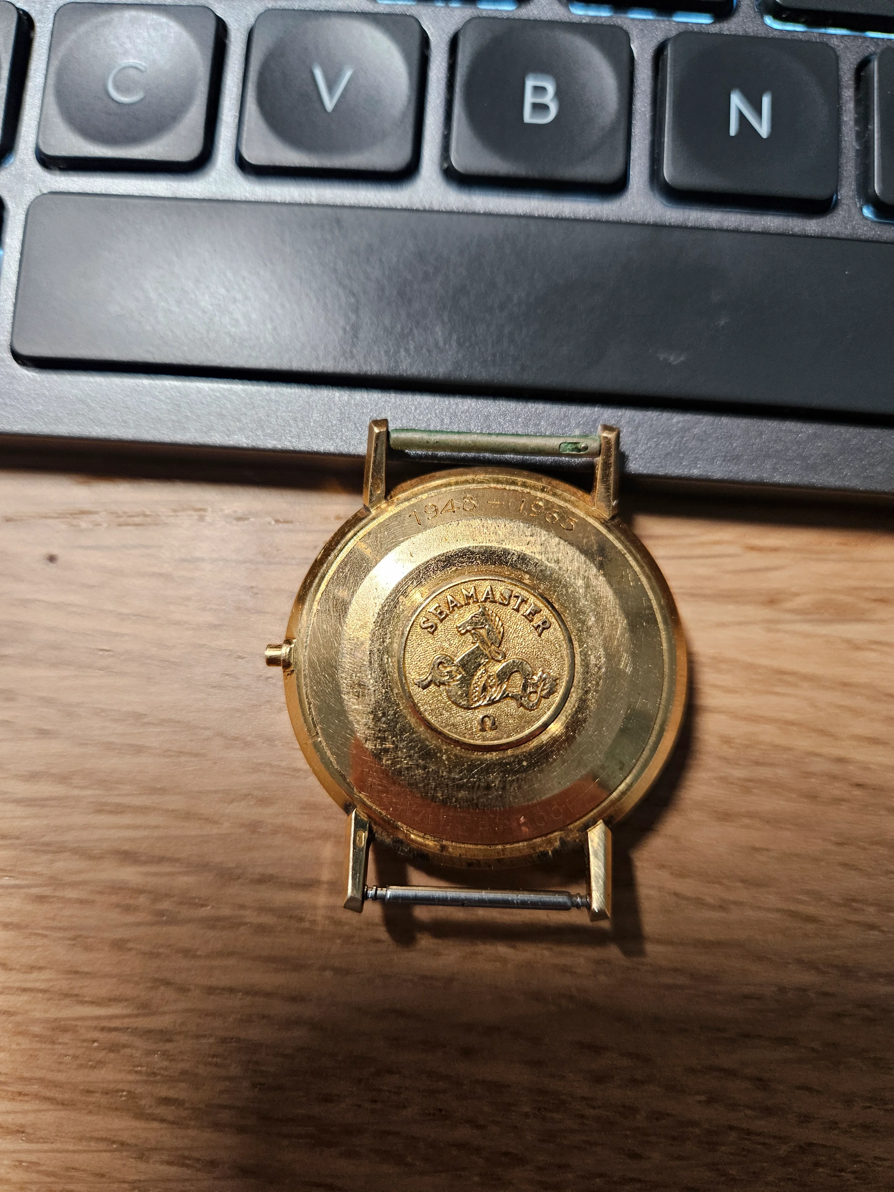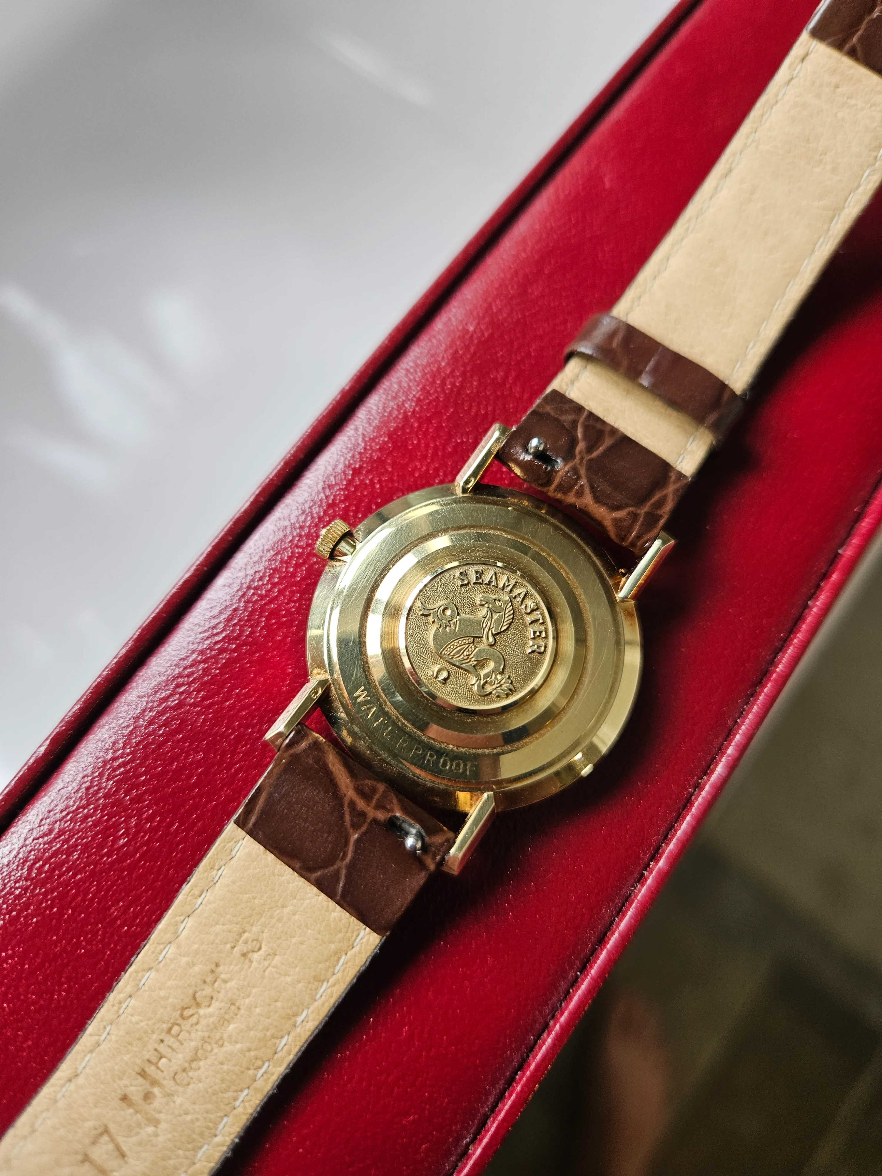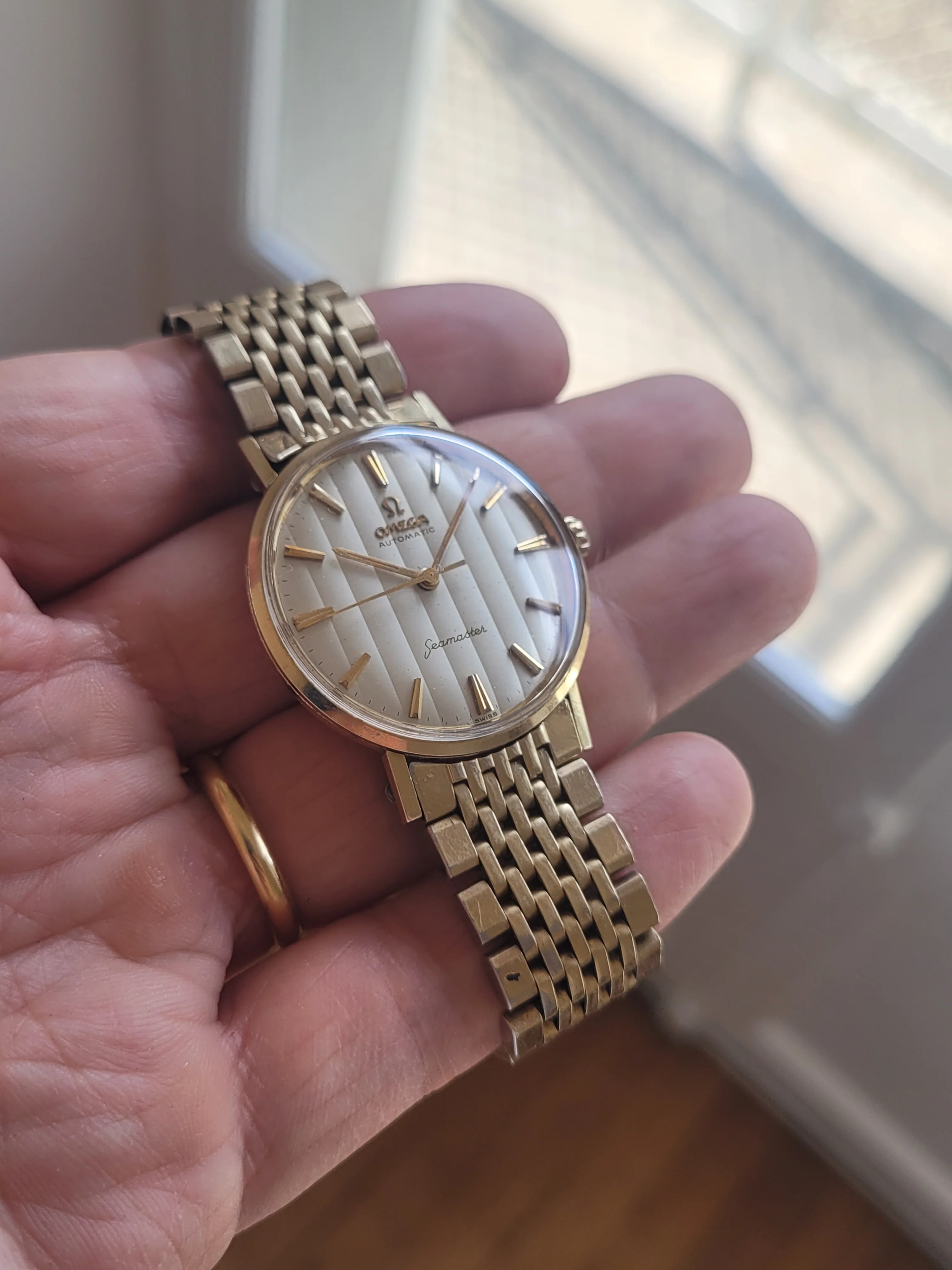 The watch has no date, it is the 18K variant with gold case, bracelet and dial and does feature the seahorse on the bottom, has the more „normal“ S in Seamaster and says swiss made on the bottom of the dial. The clasp is the larger variant, not as shown in the pictures for the swiss 14743.