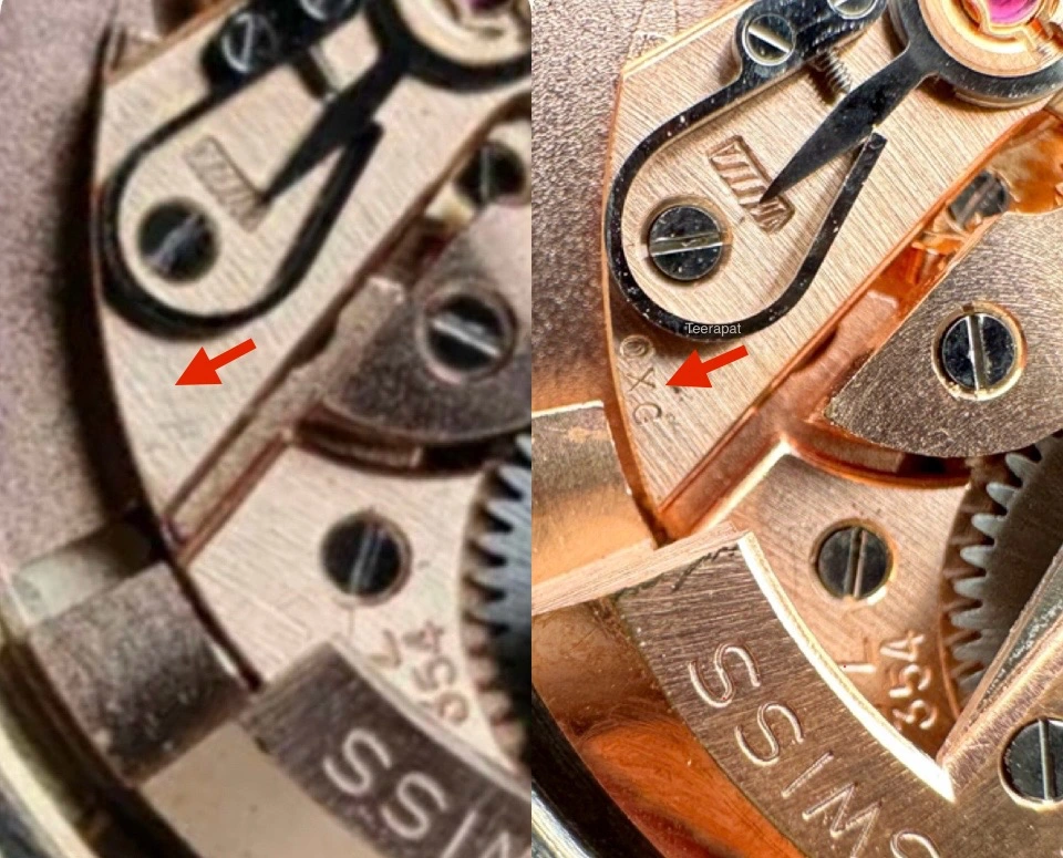 However, it contradicts the fact that the watch is fitted with caliber 352, which should indicate an early production period. I also noticed that the text under 6 o’clock may read “SWISS MADE” instead of the expected single “SWISS”.