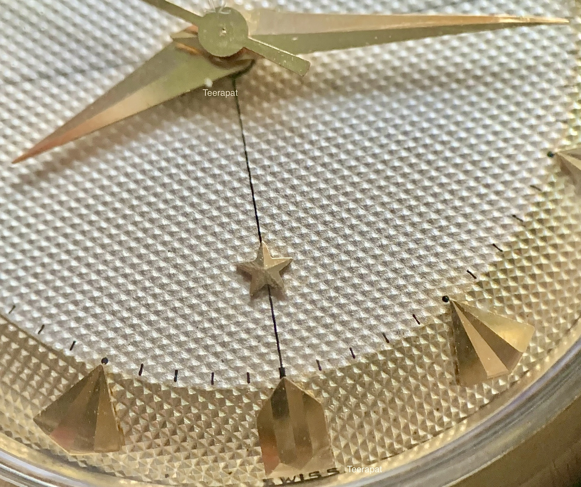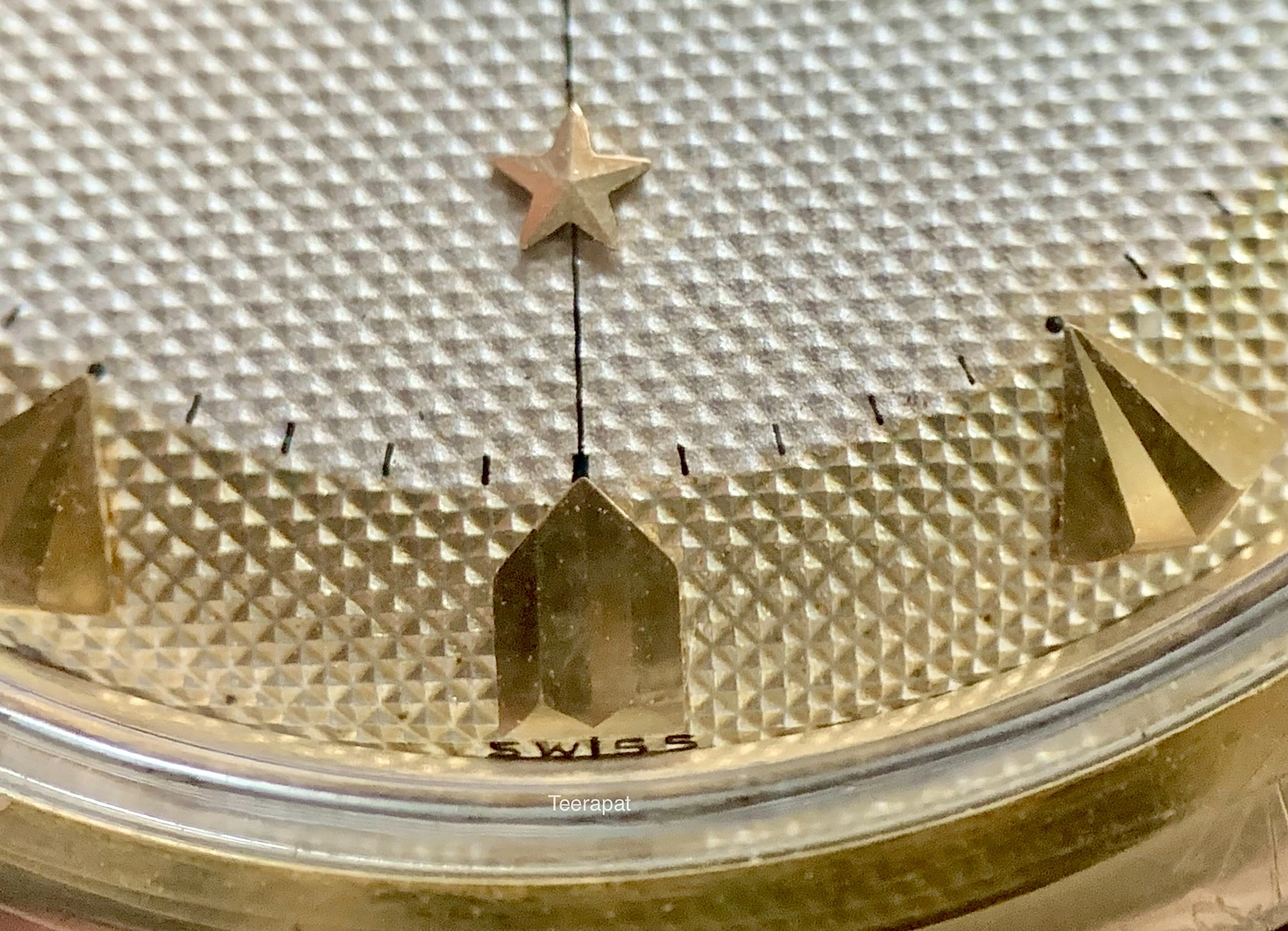 • The single “SWISS” at 6 o’clock is faint, which is normal on arrowhead-marker dials