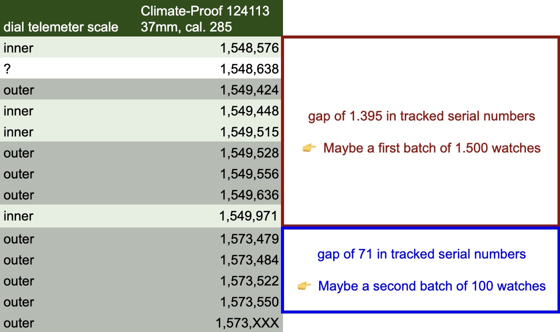 - Both dial options of the 124113 (inner and outer telemeter scale) were produced in parallel, and not successively (contrary to what is mentioned on the original Orologi & passioni post).