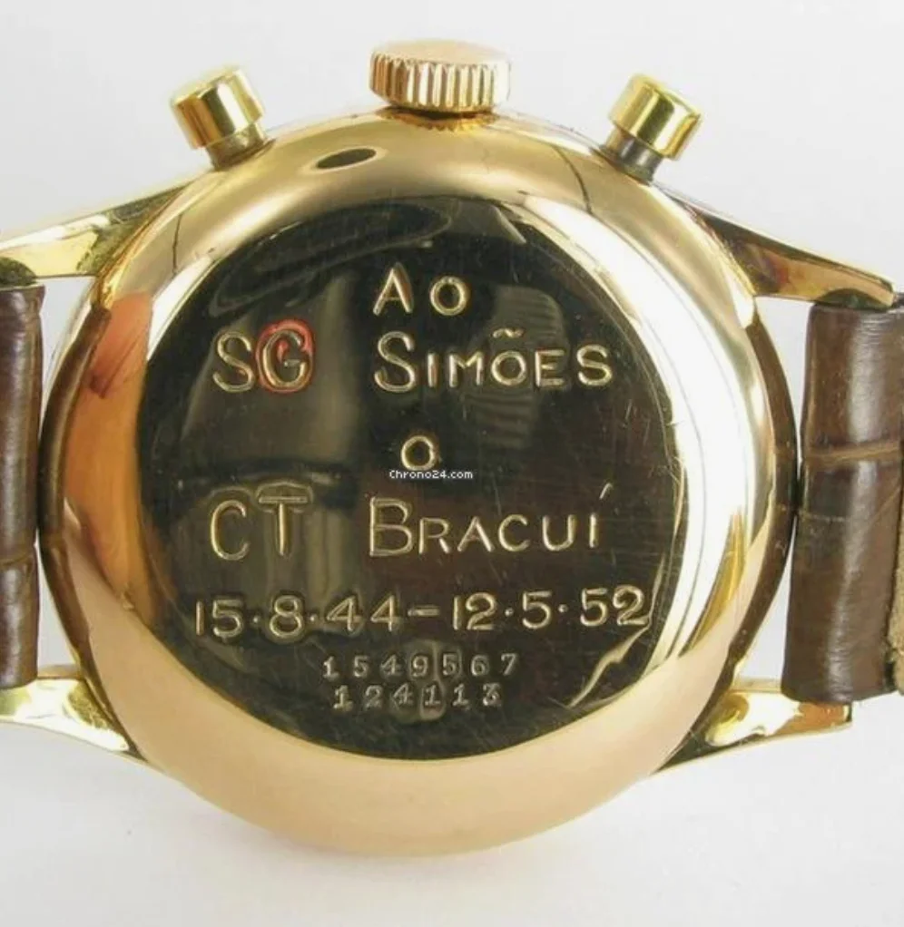 Hands on this one look a bit suspect to me (not sure if everything else looks good or not, but it certainly should, given how much they want for it...) , but what really interested me was the caseback engraving, which seems to read along the lines of “Sg. Simões / CT Bracui / 15.8.44 - 12.5.52”.