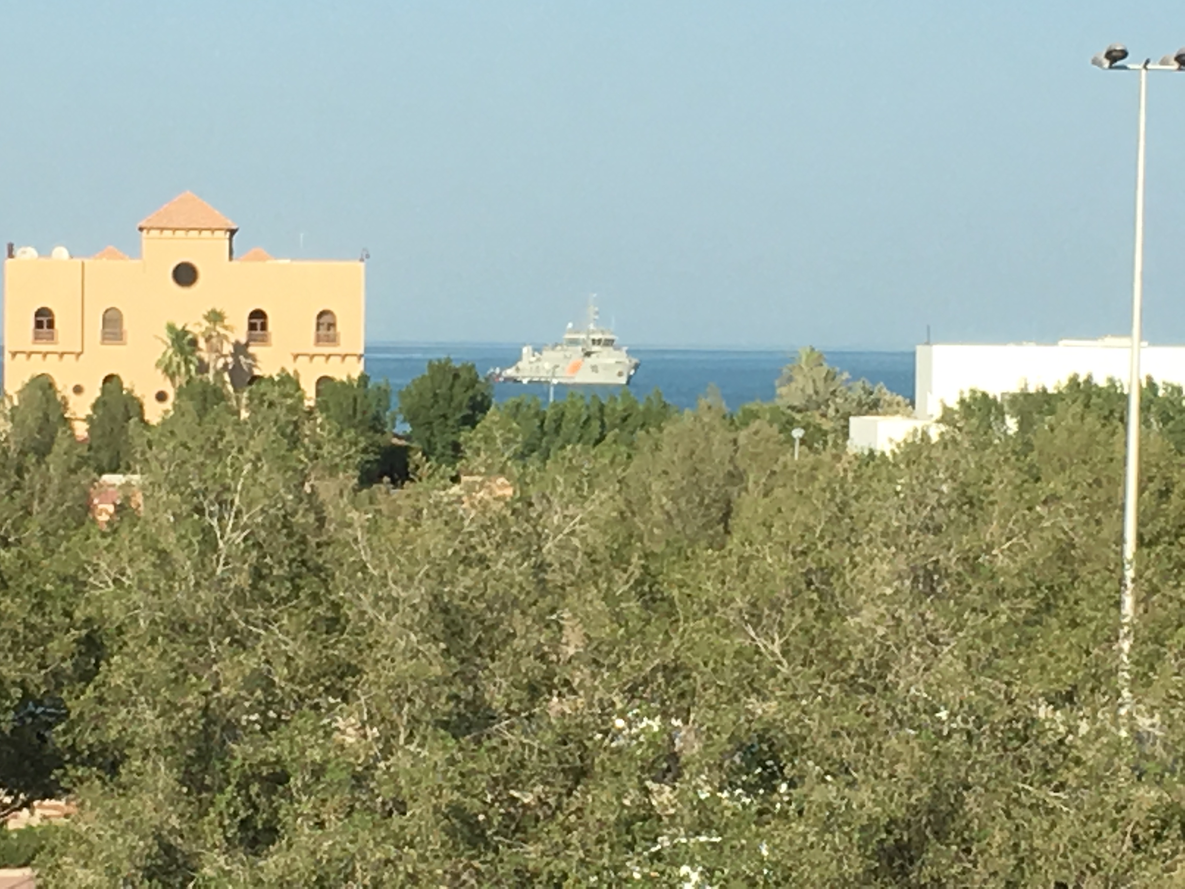 (There is always a small naval vessel hanging around beside the palace when he's in residence)