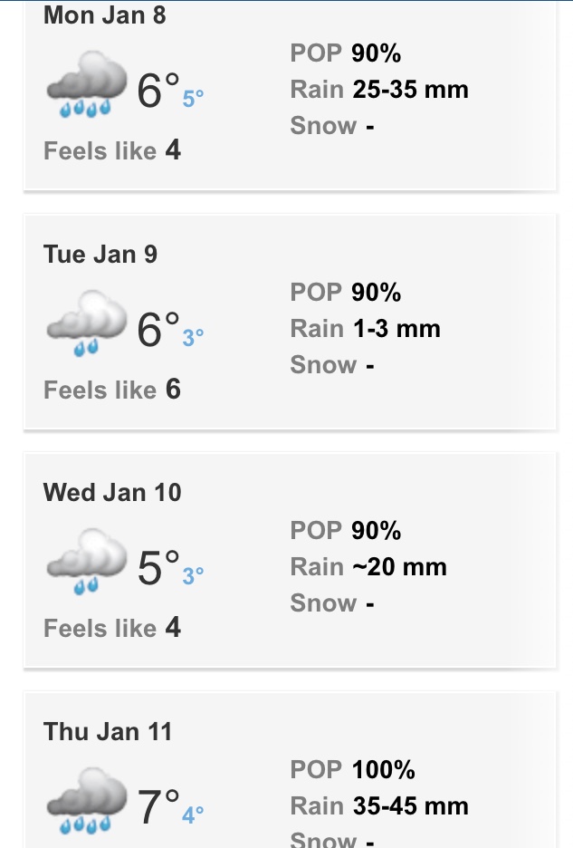 After weeks of temps well below freezing, and often below -20C, tomorrow we are supposed to get to +4C and +6 on Thursday, then temps head back down again for the weekend.