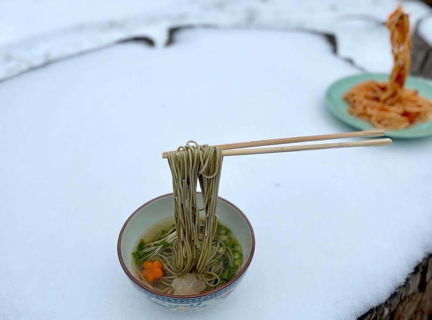 Saw in the news yesterday. A Portland artist froze noodles and chopsticks in midair. Sort of the counter to frying an egg in the sun. Took 15 minutes to freeze solid.