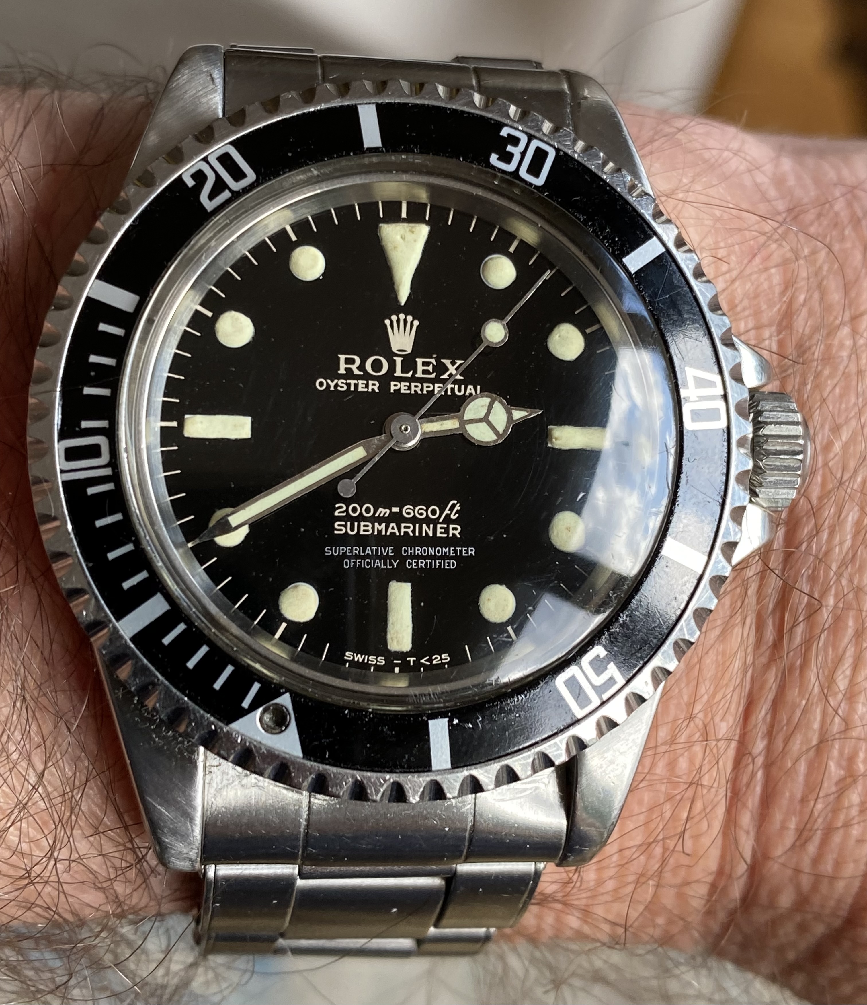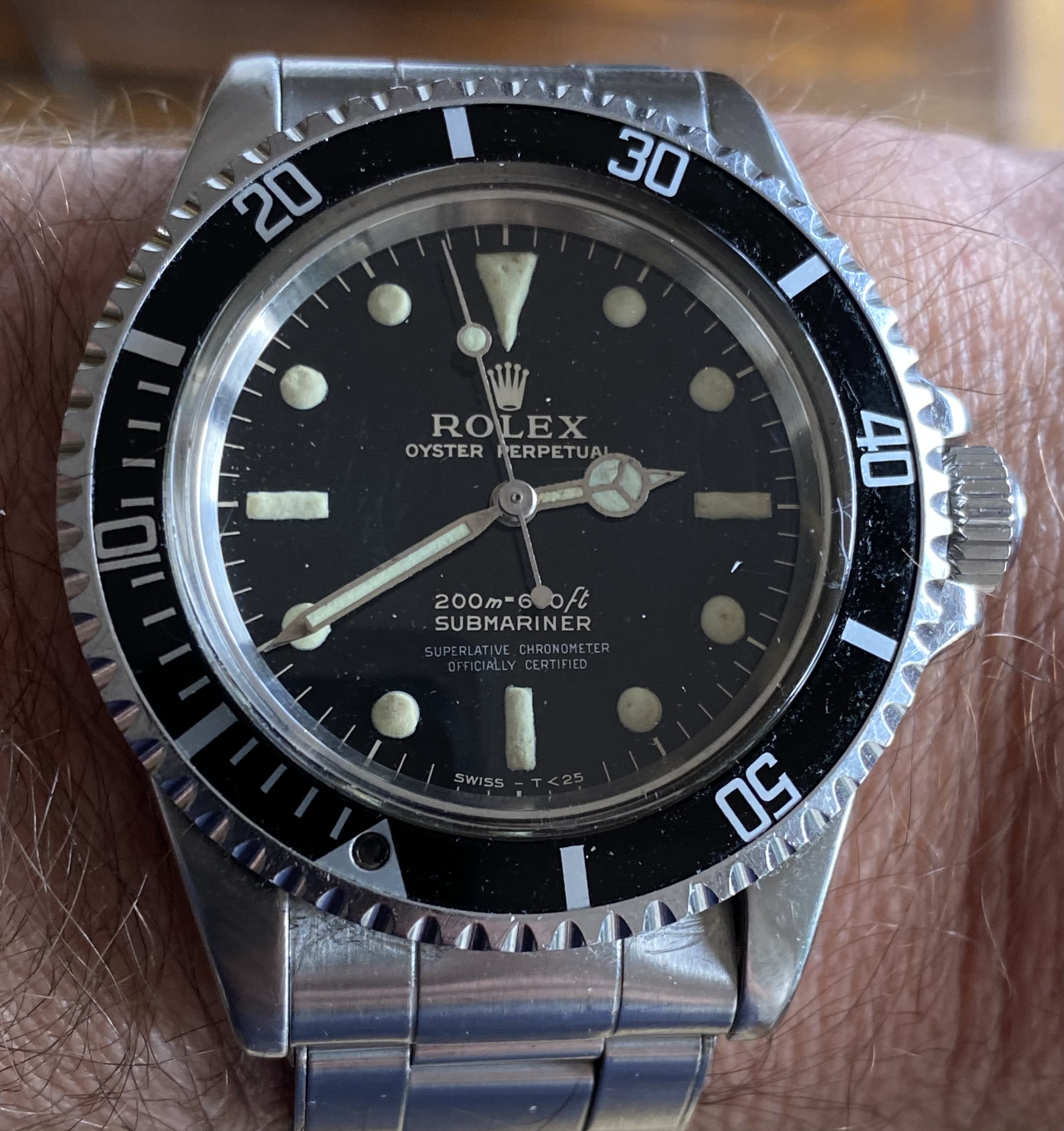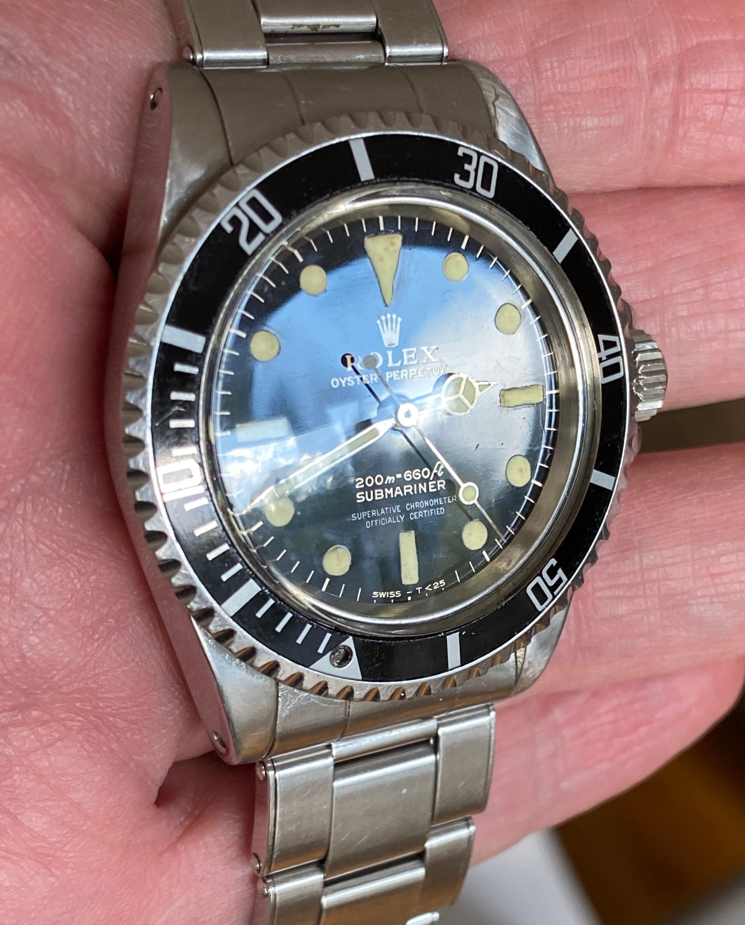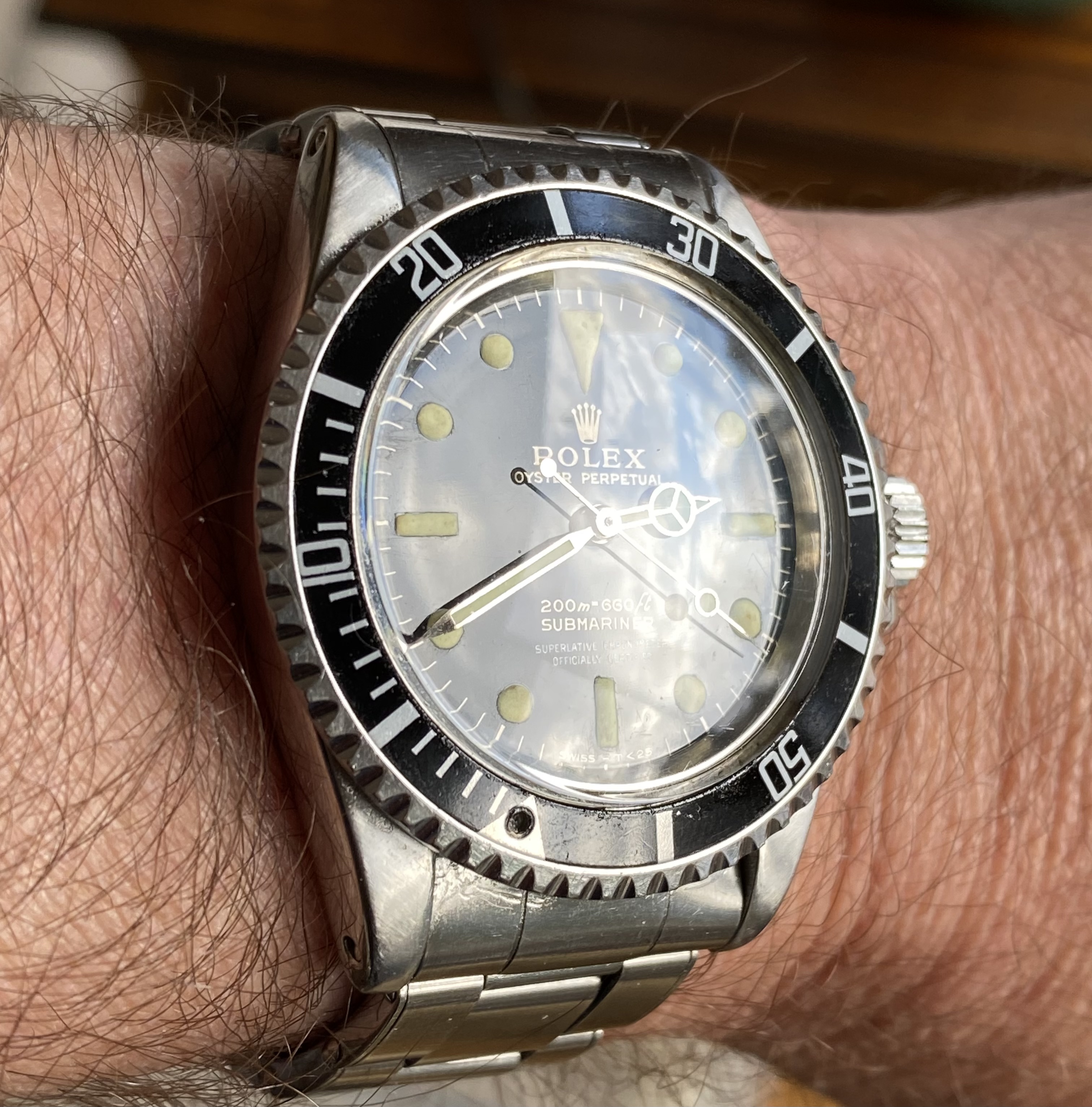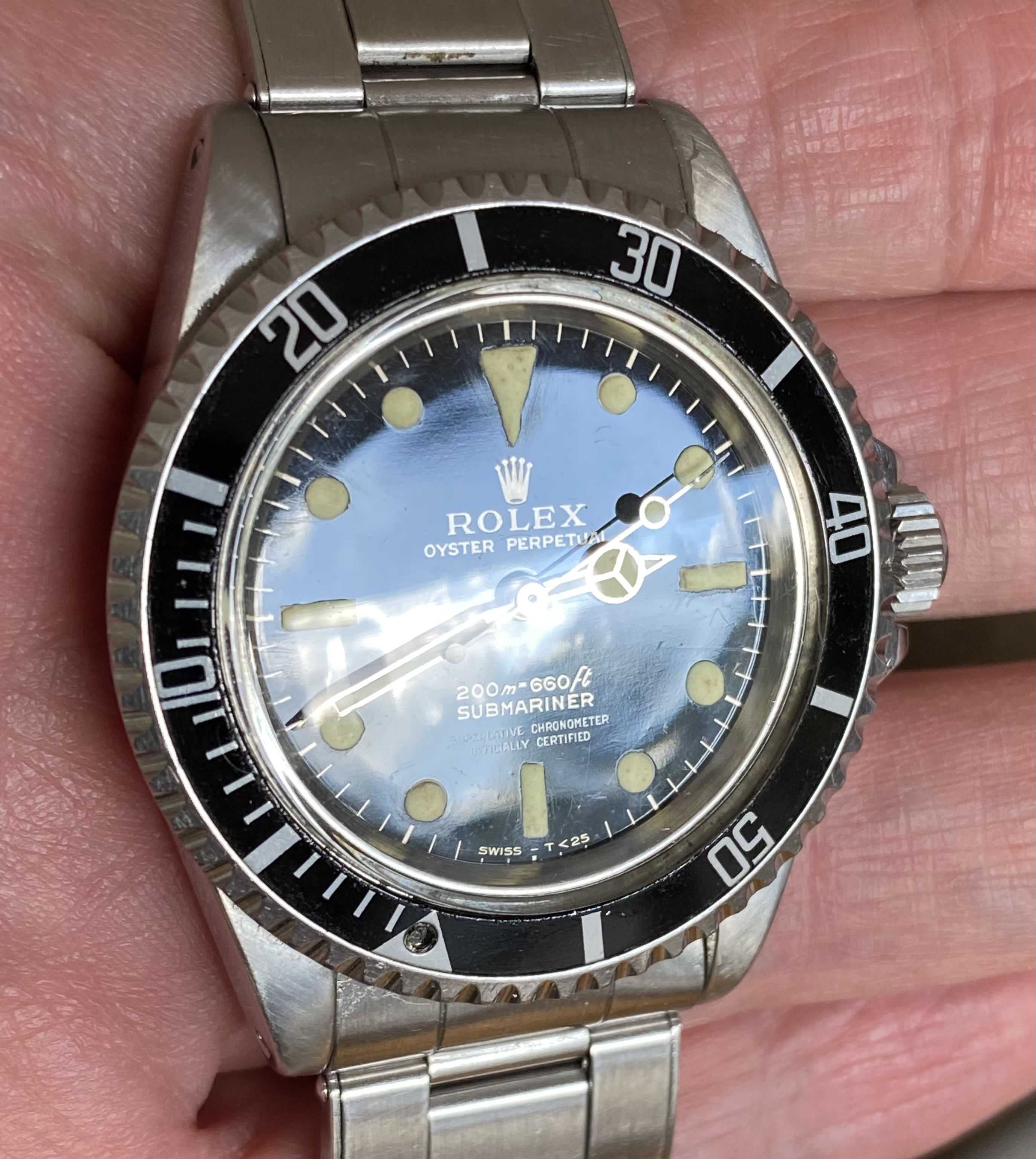 Other than the lume, the glossy dial is nearly perfect. My watchmaker confirmed that the watch hadn’t seen a lot use in its long life. The rivet bracelet is still tight. I paid about what a brand new Sub costs on the grey market right now.