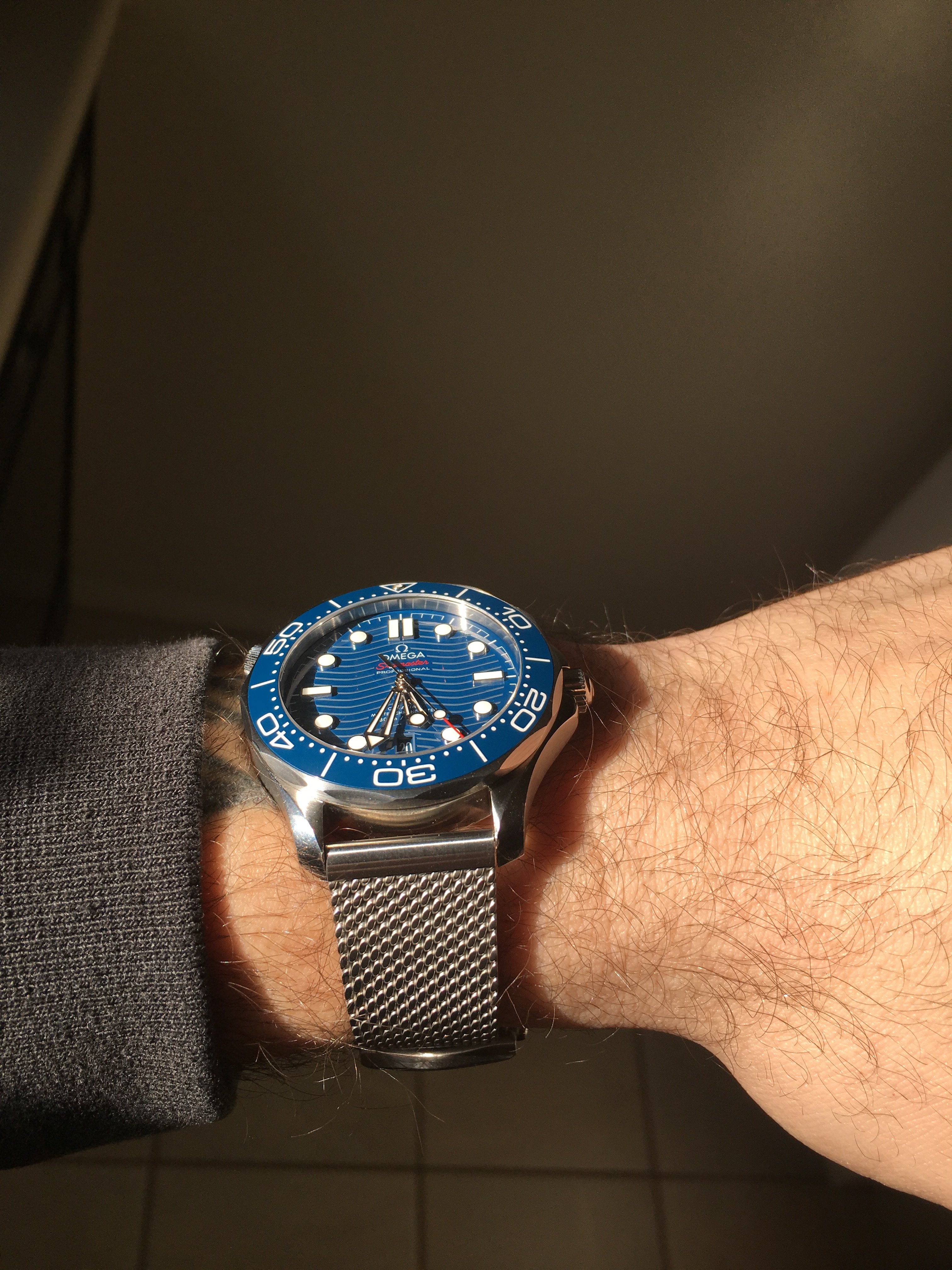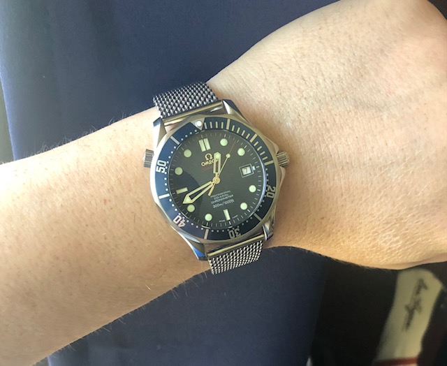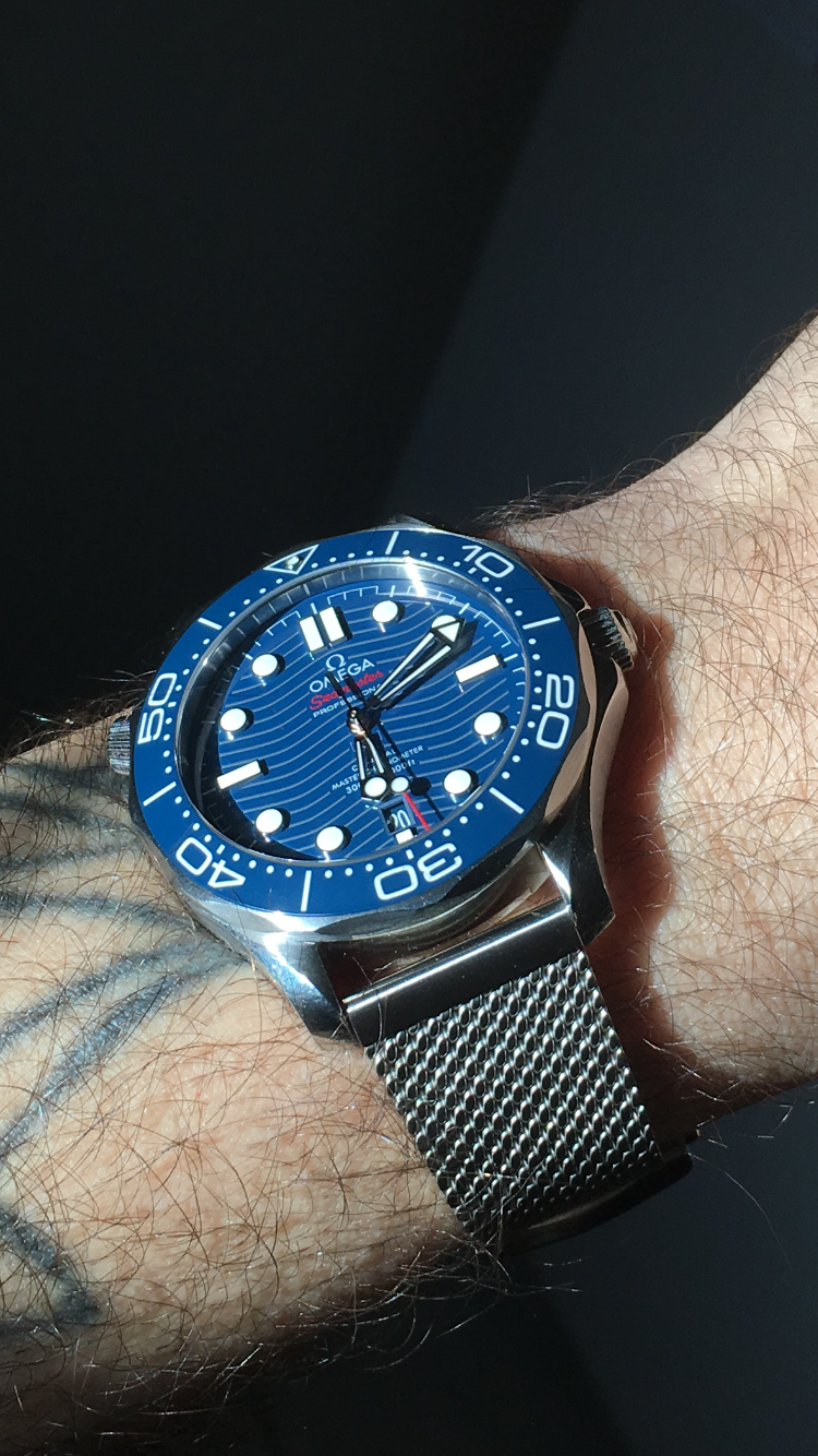 ·I recently put a mesh bracelet on my blue 300m Seamaster. It is 2.8mm thick and I purchased it from Strapcode. I originally bought it for my Tudor BB58 but I think it looks better on the Seamaster (I think due to the short lugs).