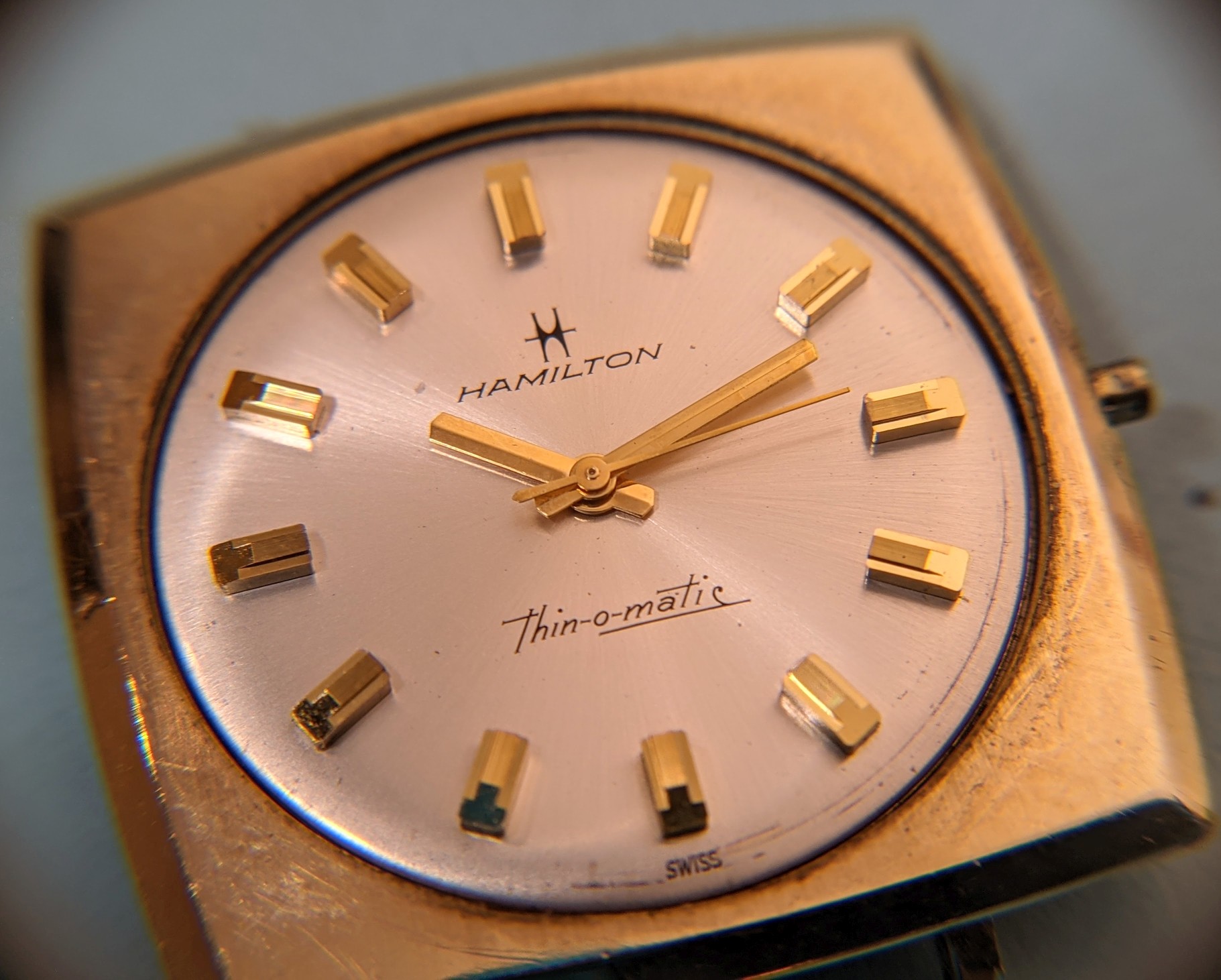 ·Hamilton cal 628 Thin-o-Matic. They make a big deal of the thinness (the name of the model is 'Thin') that's made possible by the micro-rotor auto wind, but then the dial & dial furniture are nearly as thick as the movement itself...